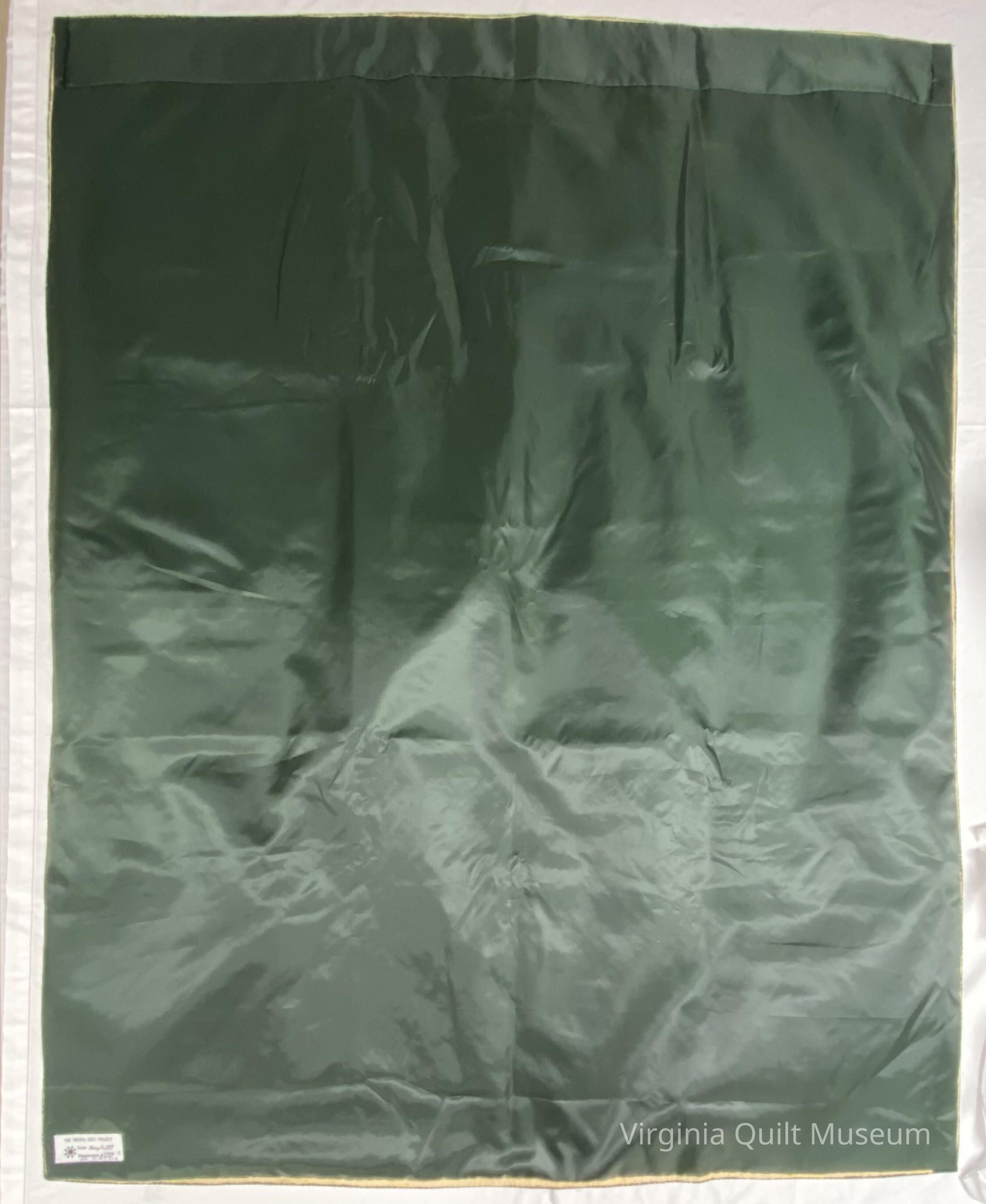 The Log Cabin blocks were constructed on sheer fabric and a reinforcement strip covers the seams on the back before the backing was added. The backing is a synthetic green and was likely added later as conservation.Context