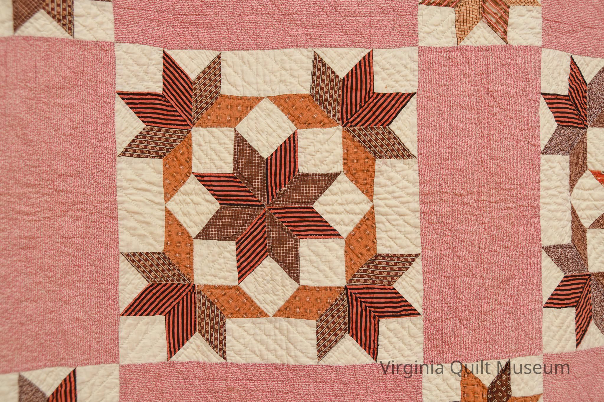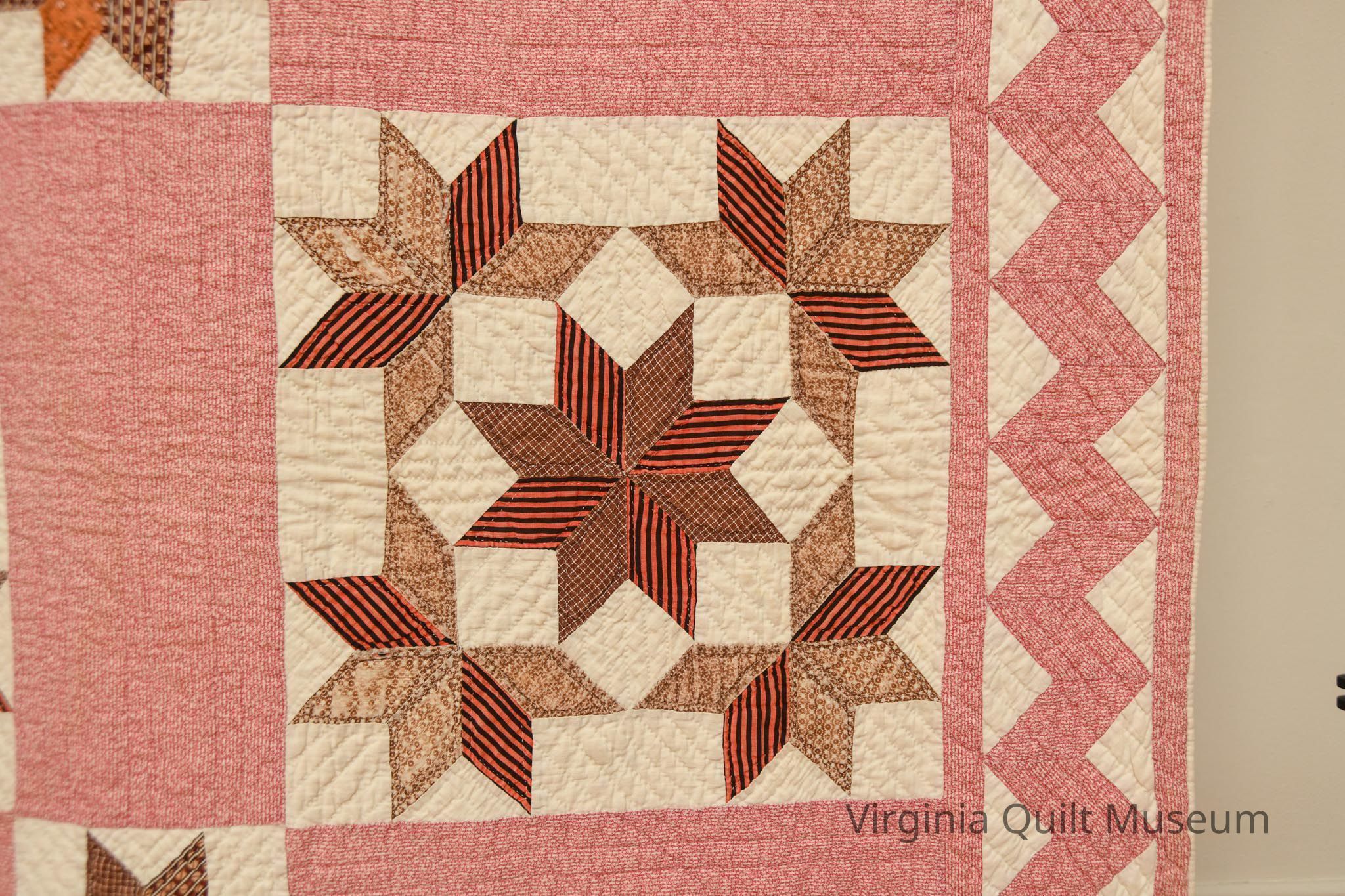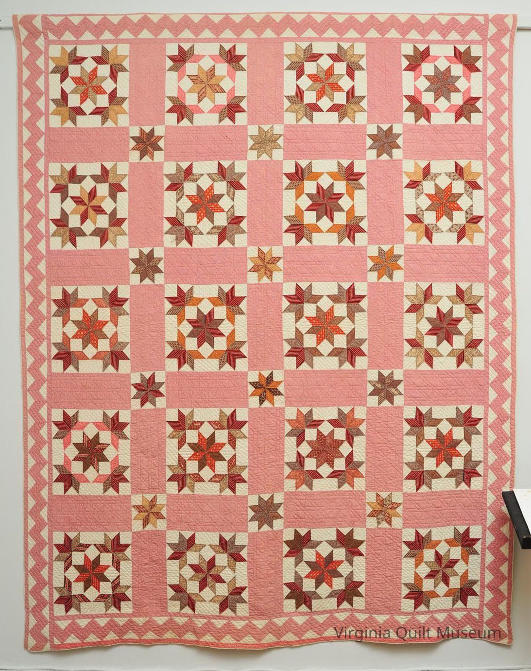 Hand pieced and hand quilted. 20 blocks of pieced diamonds in eight-point star design in the center with 6-diamond partial stars at each corner of block. White background. Each block is framed by pink sashing, 5.25" wide. Smaller blocks where sashing intersects feature madder prints. The outer border has a 4" wide pink zig-zag on white with a narrow matching pink strip on each side.Context
