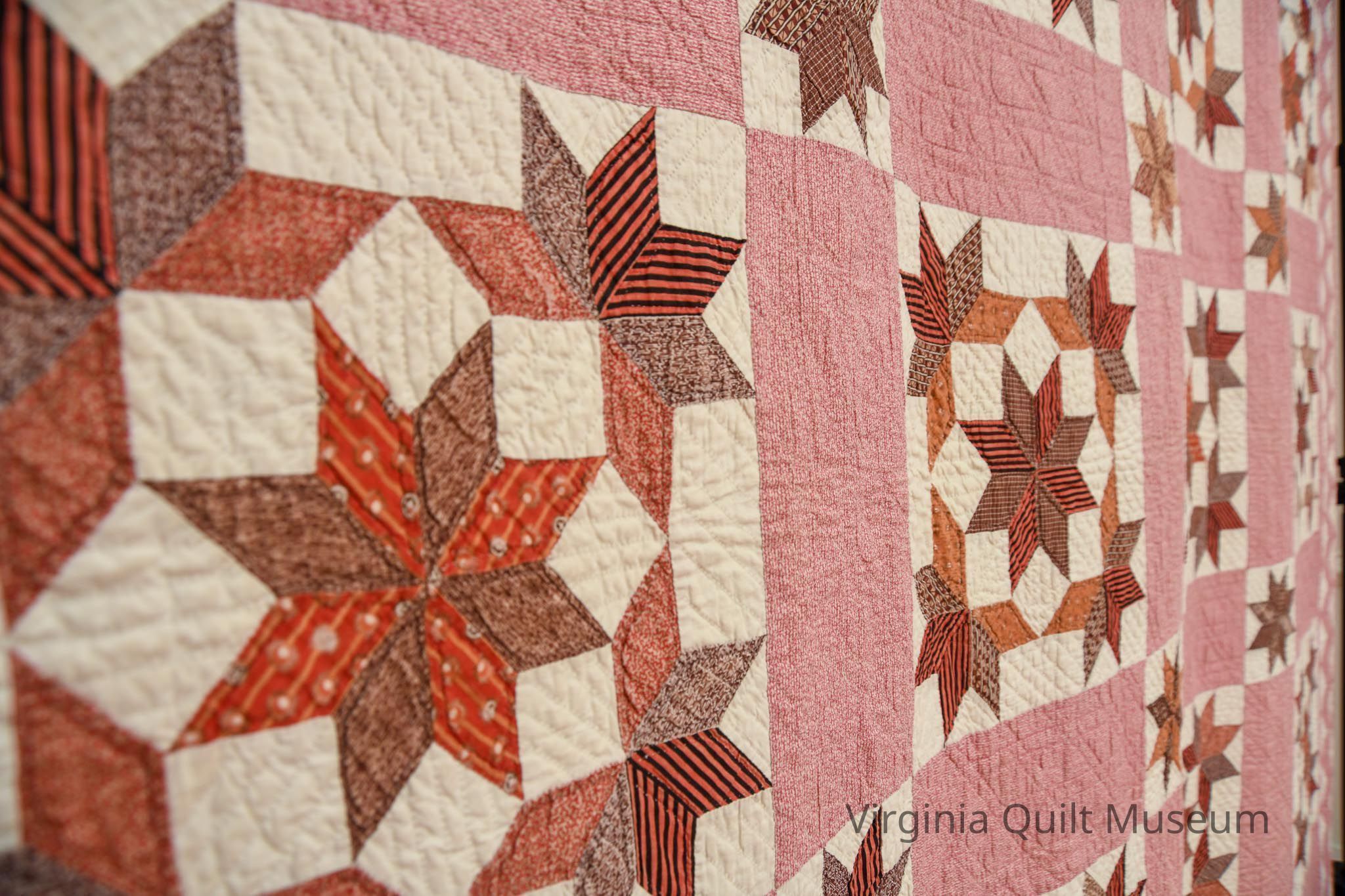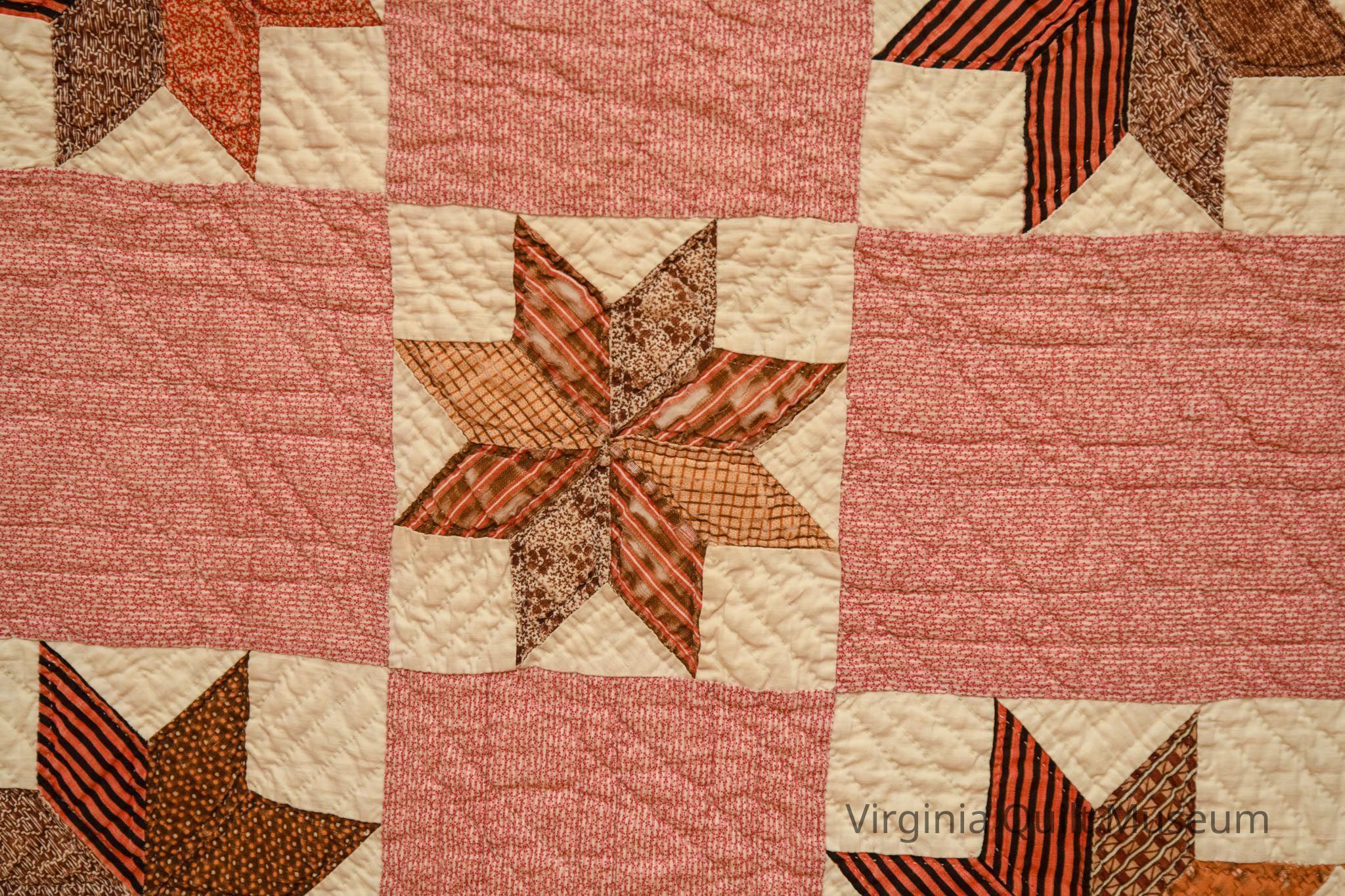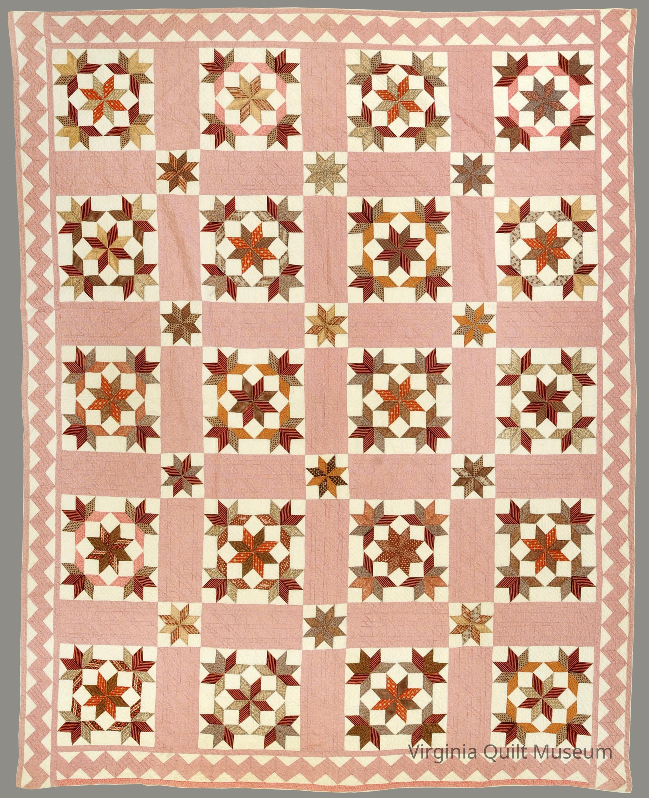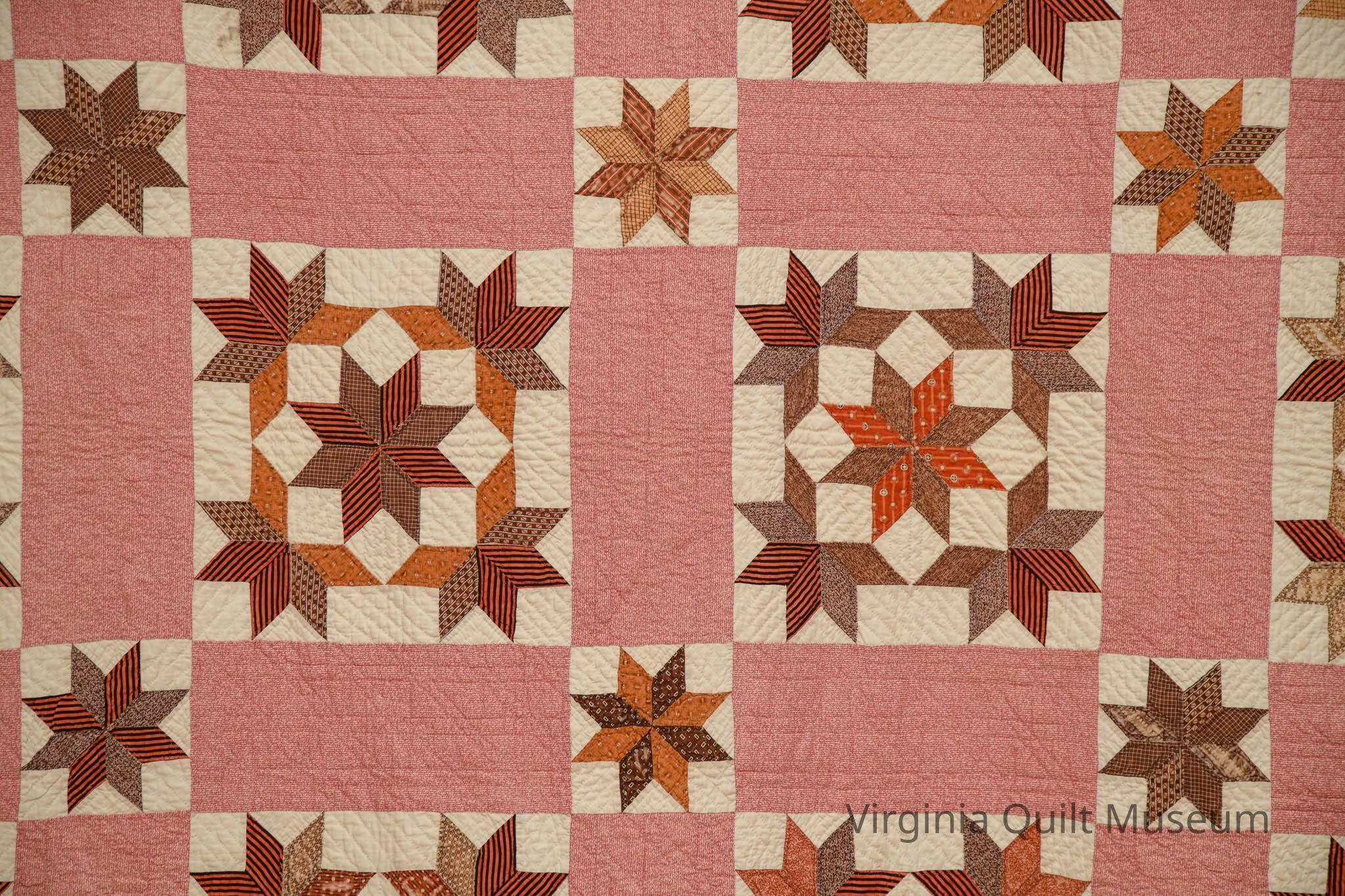 Hand pieced and hand quilted. 20 blocks of pieced diamonds in eight-point star design in the center with 6-diamond partial stars at each corner of block. White background. Each block is framed by pink sashing, 5.25" wide. Smaller blocks where sashing intersects feature madder prints. The outer border has a 4" wide pink zig-zag on white with a narrow matching pink strip on each side.Context