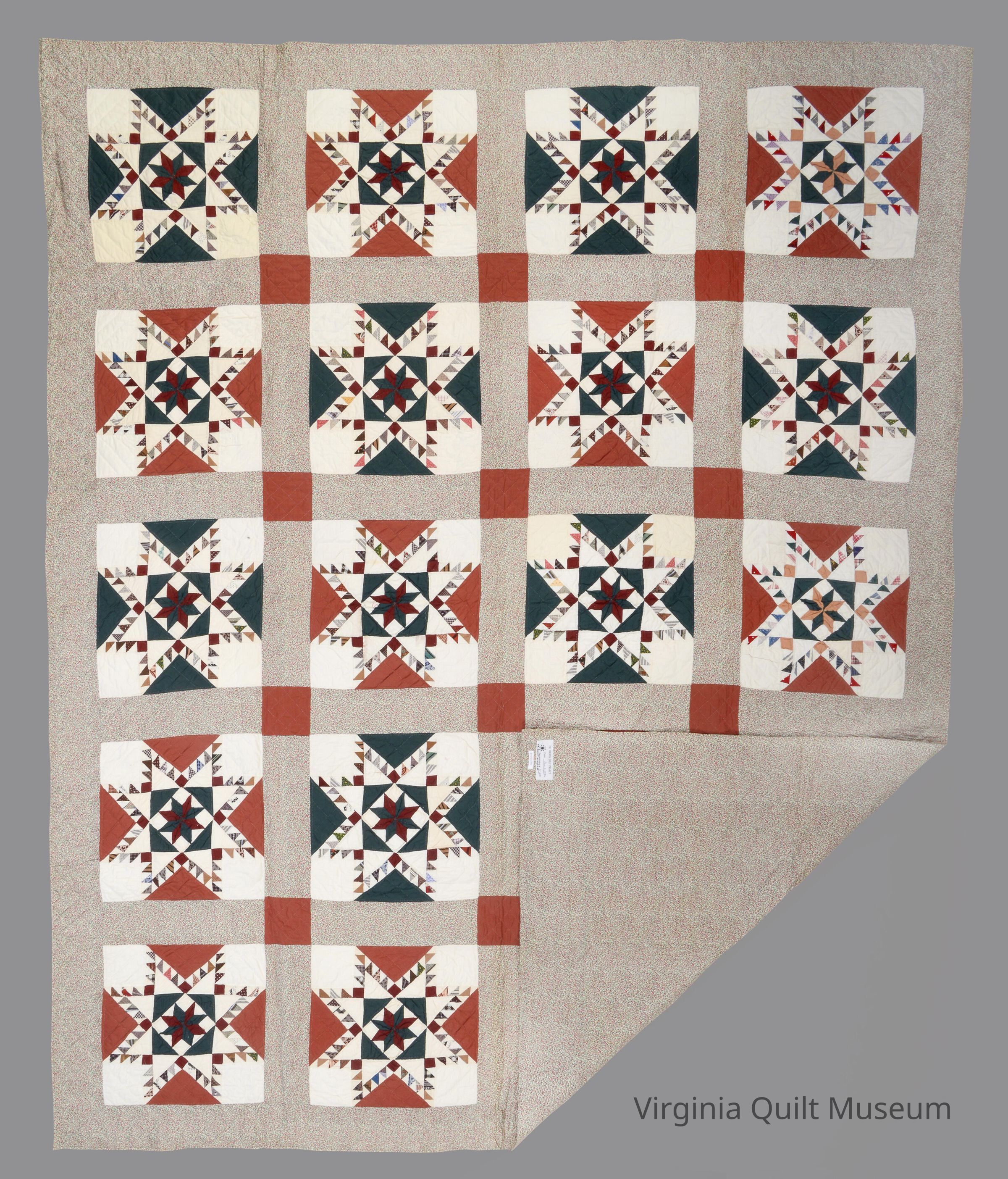 This pieced star blocks were done in the 1880s while the backing, hand quilting, and sashing were done in the 1930s. The quilting outlines the stars and straight lines through the eight pointed stars in the centers.