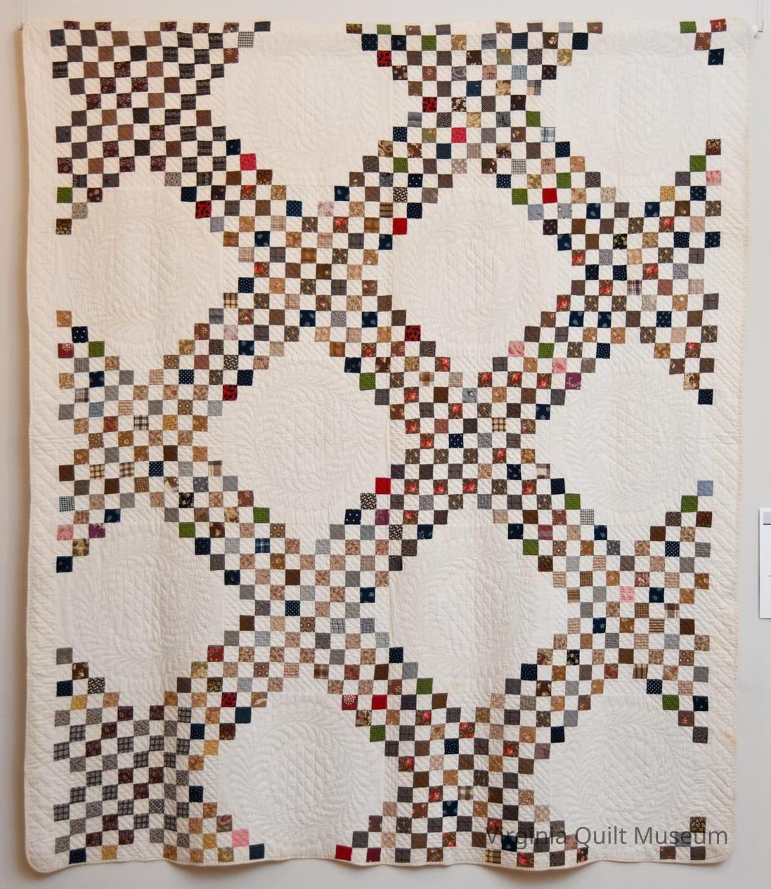 Irish Chain pattern pieced quilt with white foundation. Wide variety of scrap fabric was used. Feathered wreath quilting.