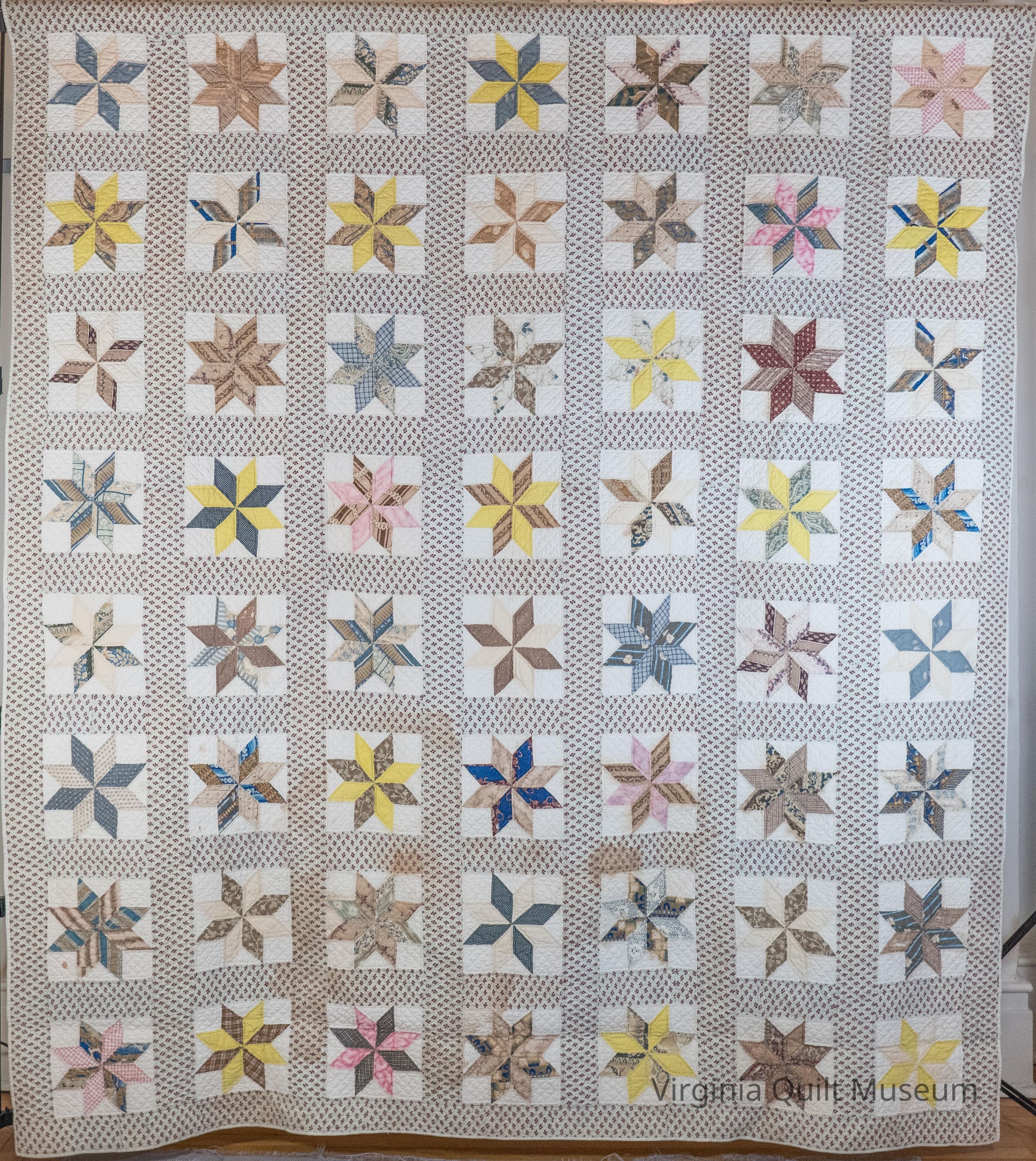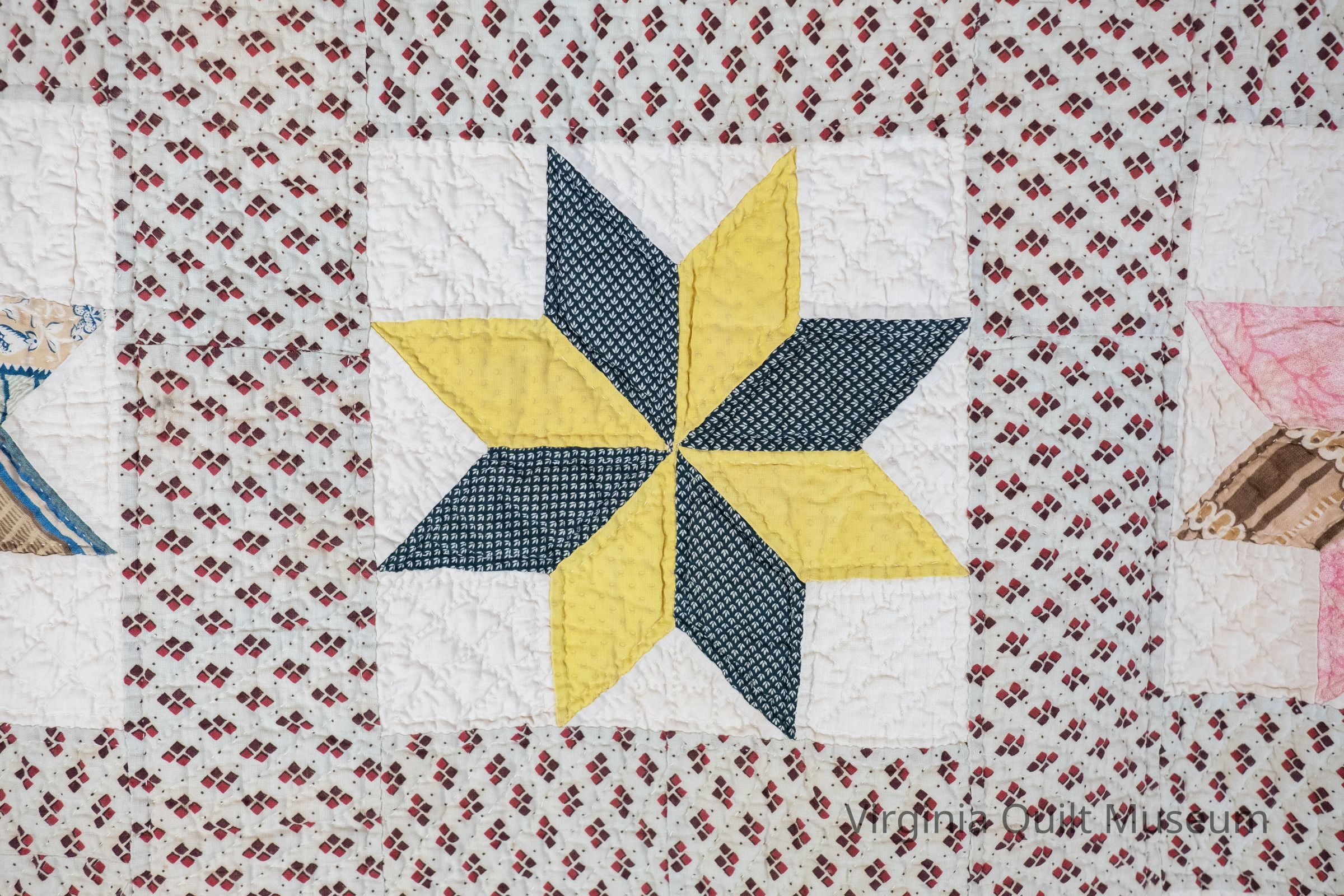 This was pieced by Sarah Judson Broadus in 1840 as a little girls "learning sewing".  She then grew up, married, raised a family and left the quilt top in a trunk. Roughly 100 years later, Sarah's daughter Lucy Ann Stringfellow and her niece Lucy Catherine Bowie quilted the old top. The aesthetics of the quilt were sacrificed in order to best preserve and secure the pieces down.Collection