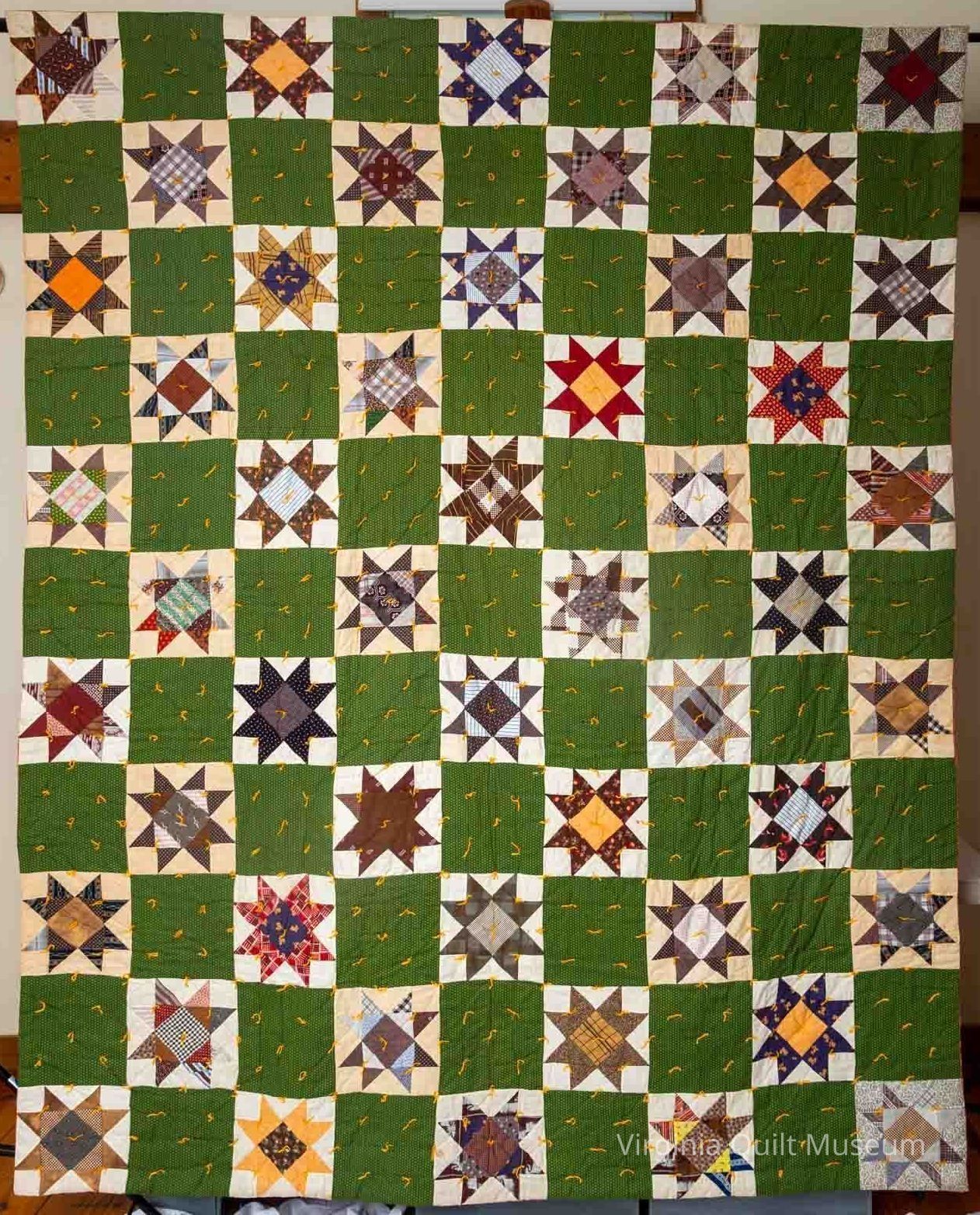 This quilt features a total of 99 blocks, with 30 eight-pointed stars set in alternating plain blocks. It was made using scrap fabric, including solids, stripes, prints, plaids, and checks. Pieced multi-color and multi-print scrap quilt of pieced star blocks.