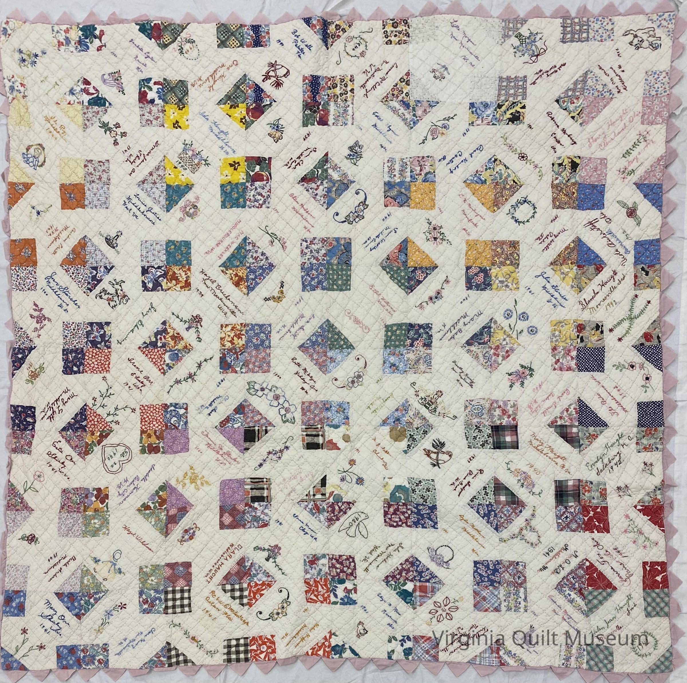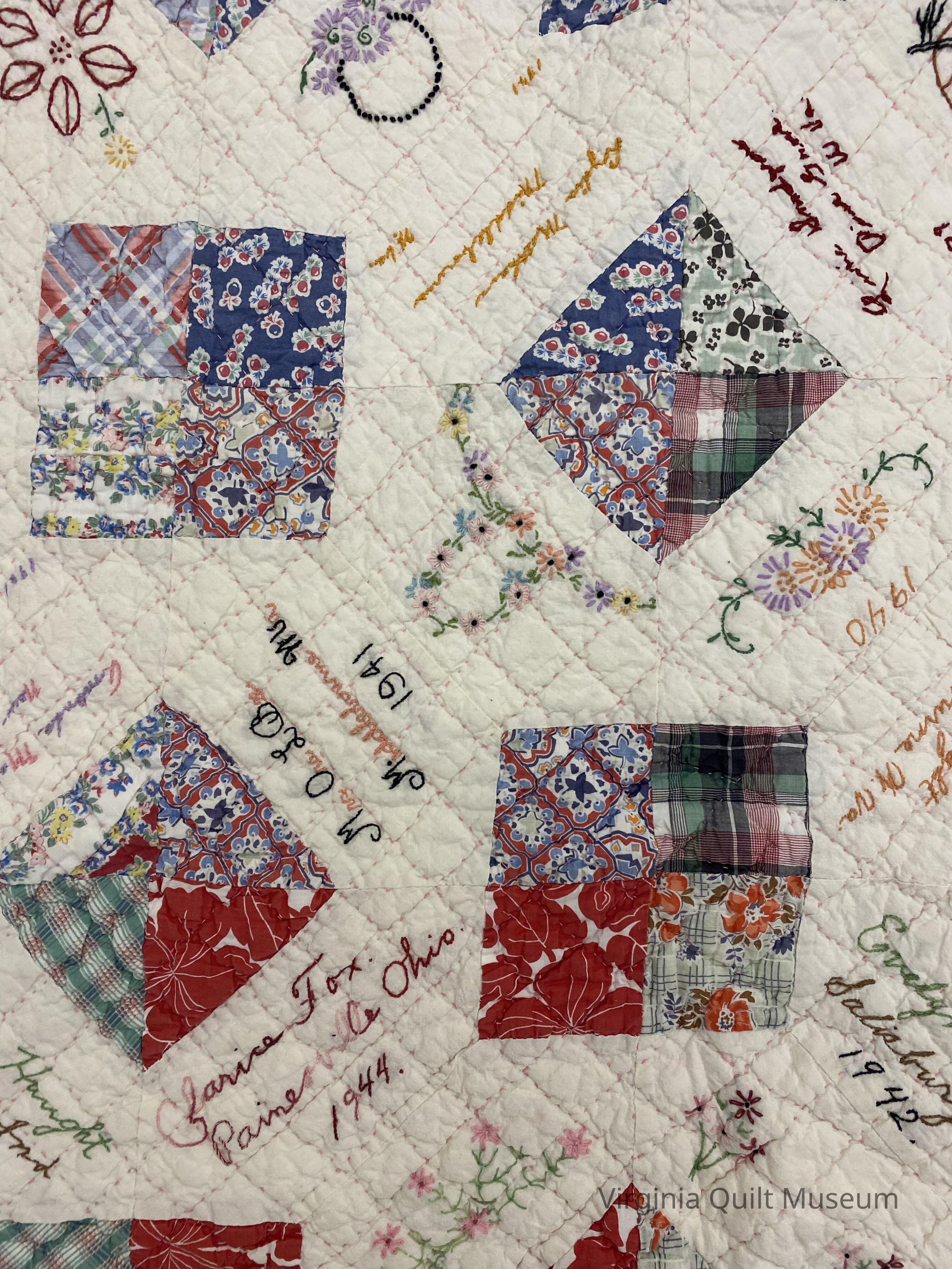 Many women assisted in making this quilt. It is unknown why the quilt was made. The signatures on the quilt are neighbors of Irma Moran of Middlebourne, West Virginia. Each block contains a stitched name and location. It is believed that Irma Moran, who's name is also on the quilt, was given this quilt by her mother, Clara.Collection