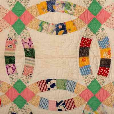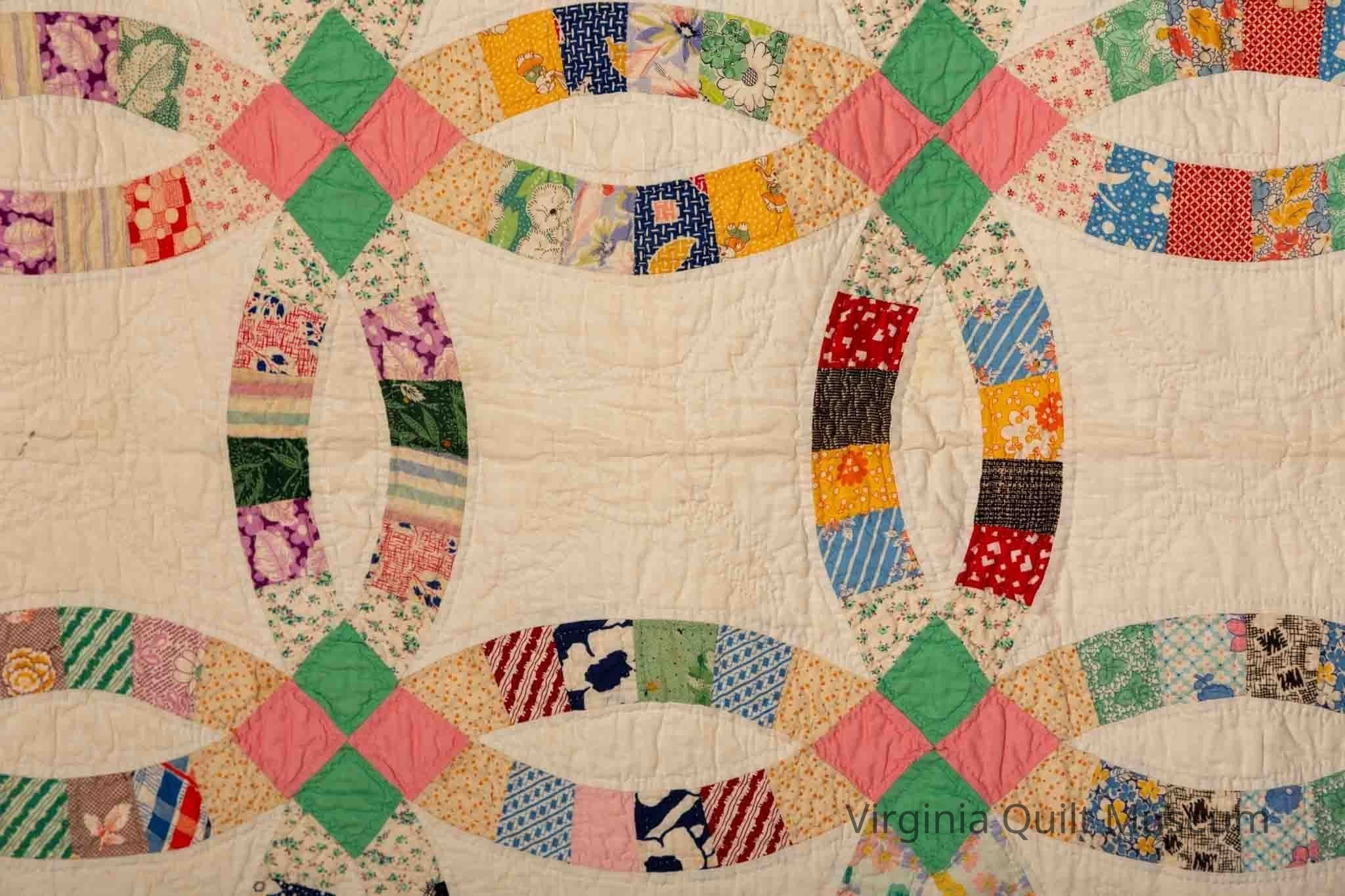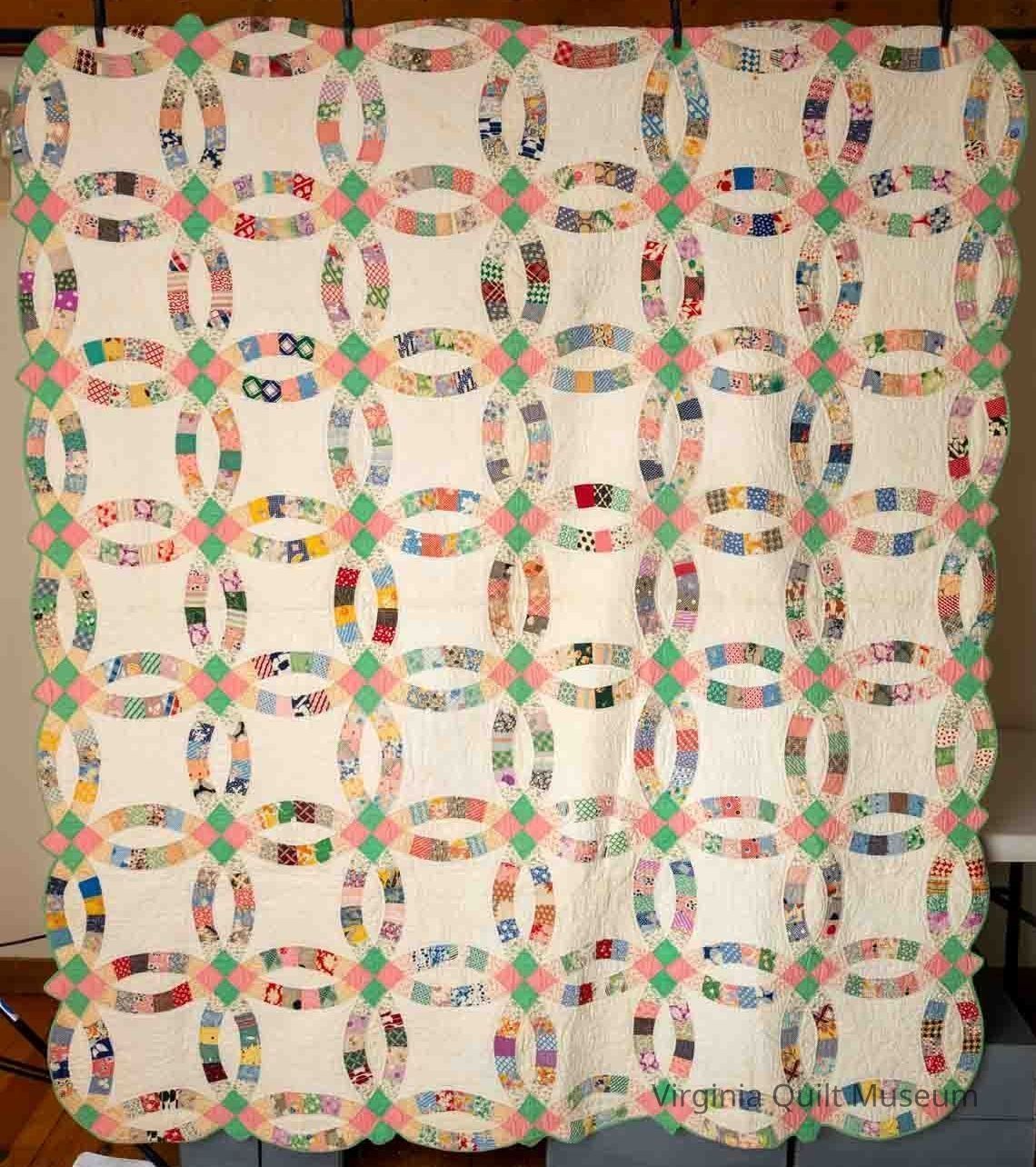 This quilt is made out of feedsack fabric. It features traditional interlocking arcs arranged on a white background. The interlocking sections contain pastel pink and green squares. The feedsack fabric is arranged in a symmetrical pattern. Meticulously hand-quilted with a circular design with four lobes. The quilt was finished with a pale green scalloped binding. It is in very good condition with only a couple of small stains.Collection