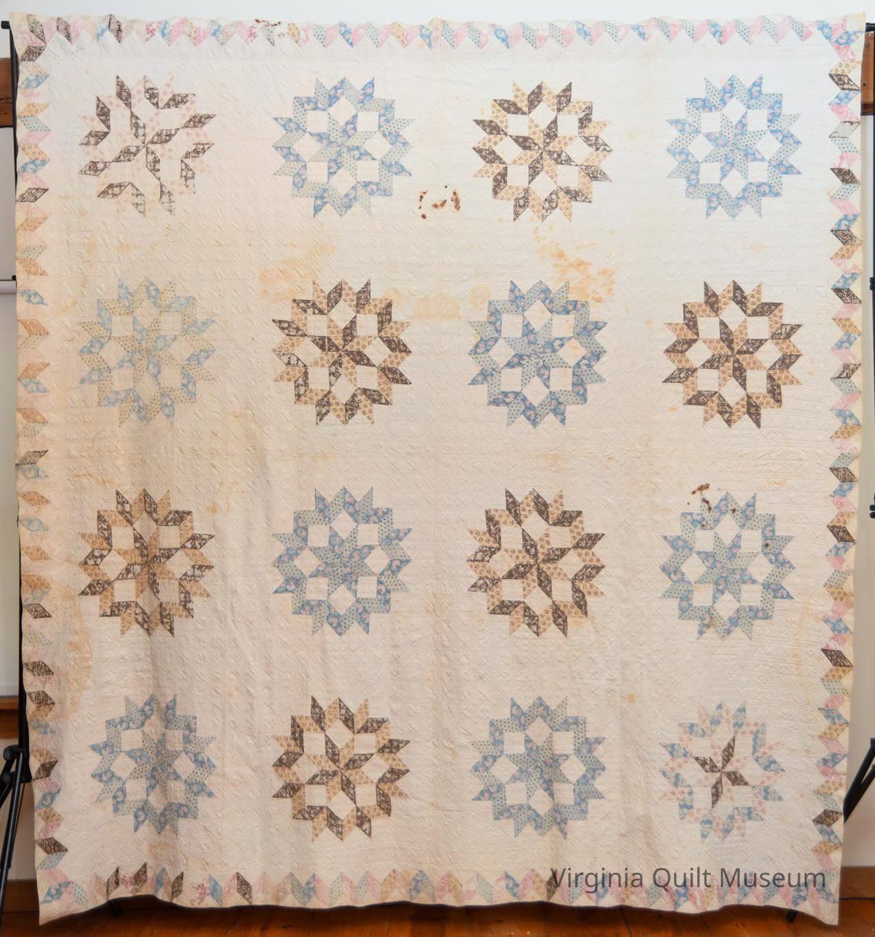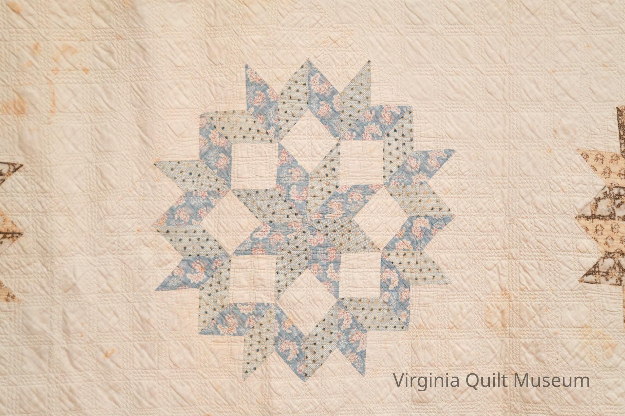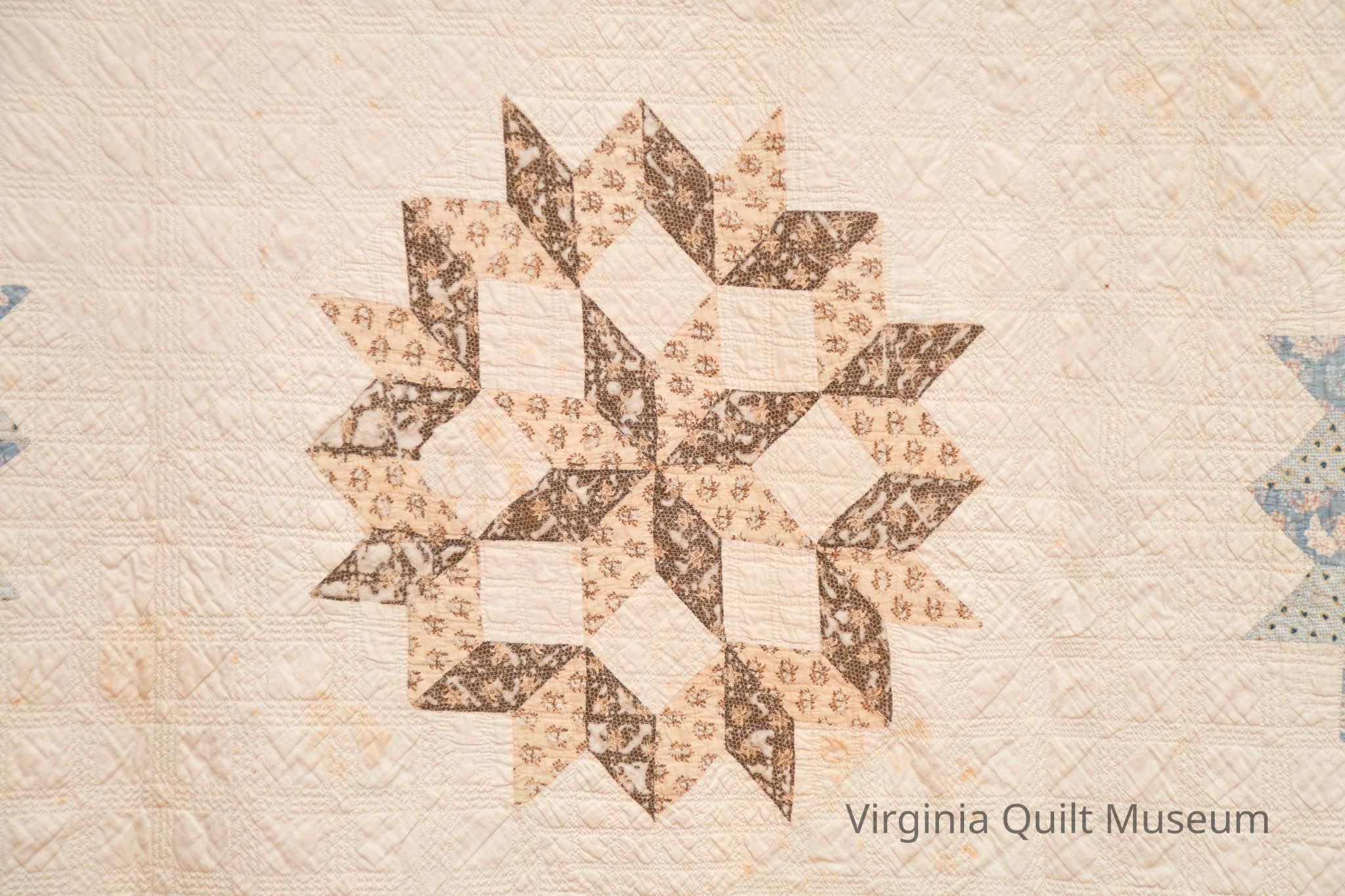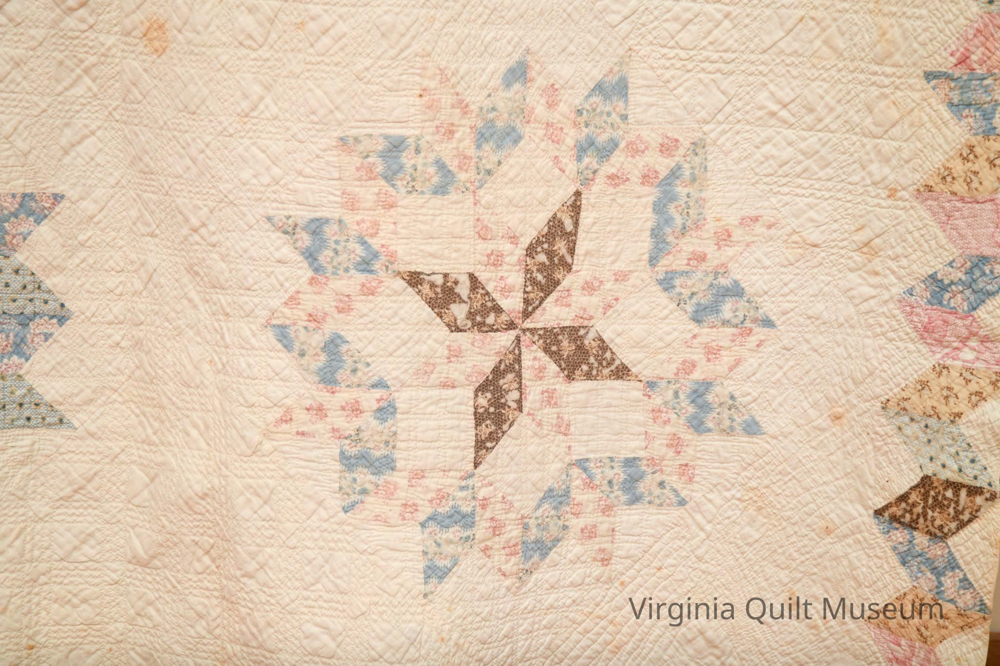 This quilt consists of 16 blocks pieced in the Star of Bethlehem pattern also known as the Carpenters Wheel. The pattern is created using diamond shaped pieces forming a ring around an eight-pointed star. The blocks, measuring approximately 16 inches square are placed on point and alternated with plain blocks of the same size. Colors used are light and dark shades of blue, brown, tan and pink. The background and backing are an off white. The 3 1/2" border repeats the diamond shapes and all of the print fabrics creating a zig-zag effect.  The edging is a very narrow 1/8" formed by rolling the backing fabric to the front.