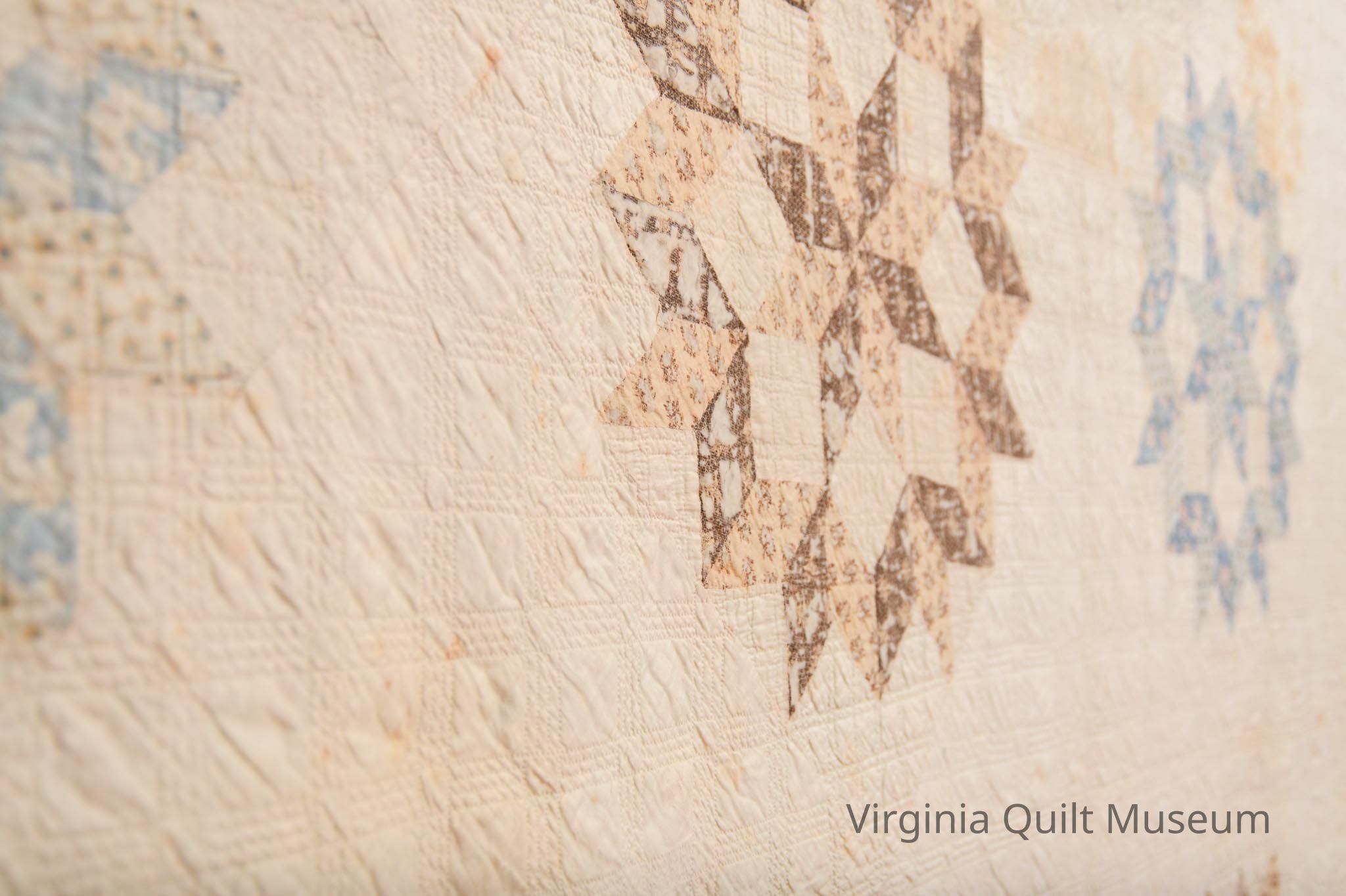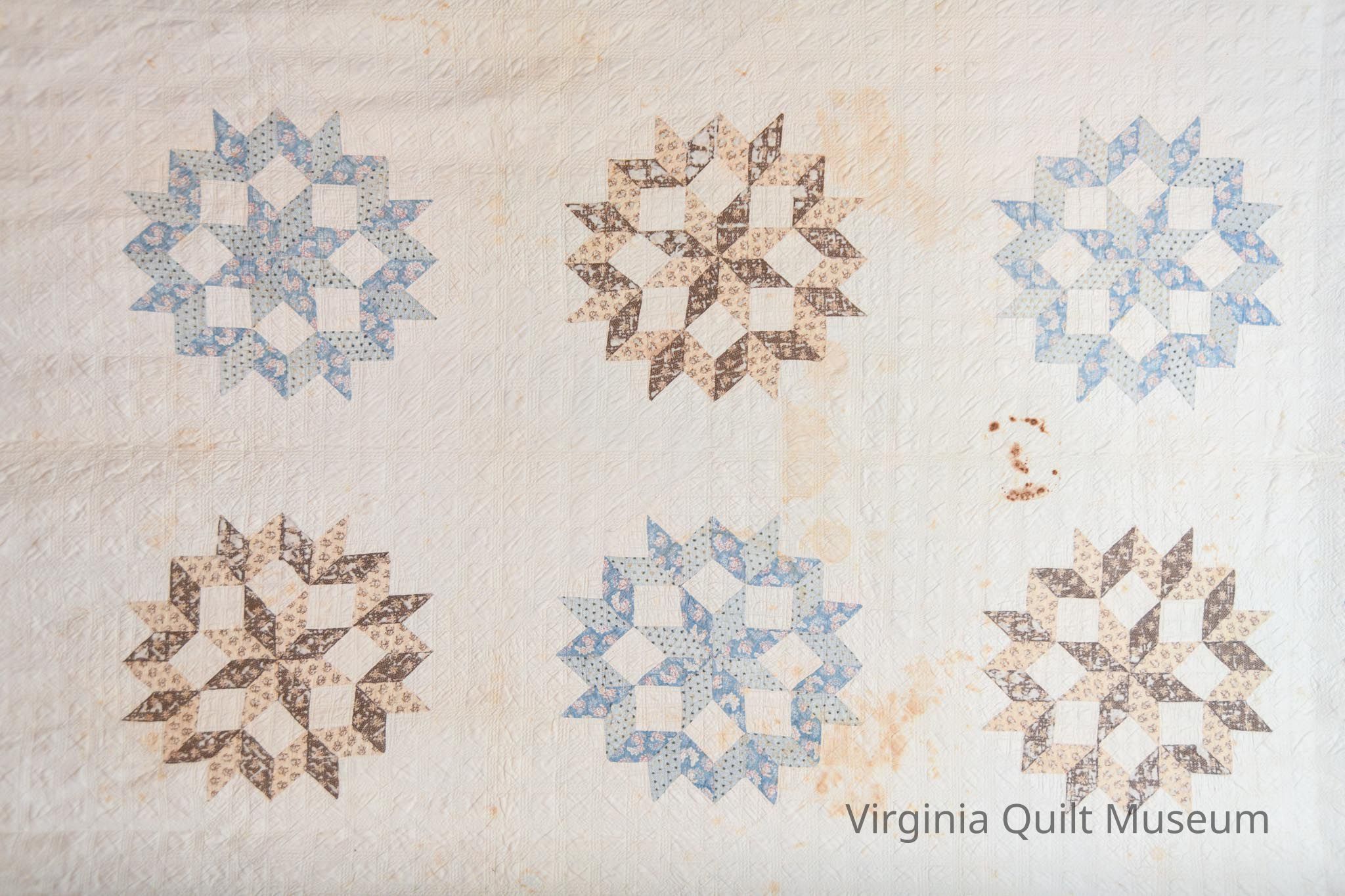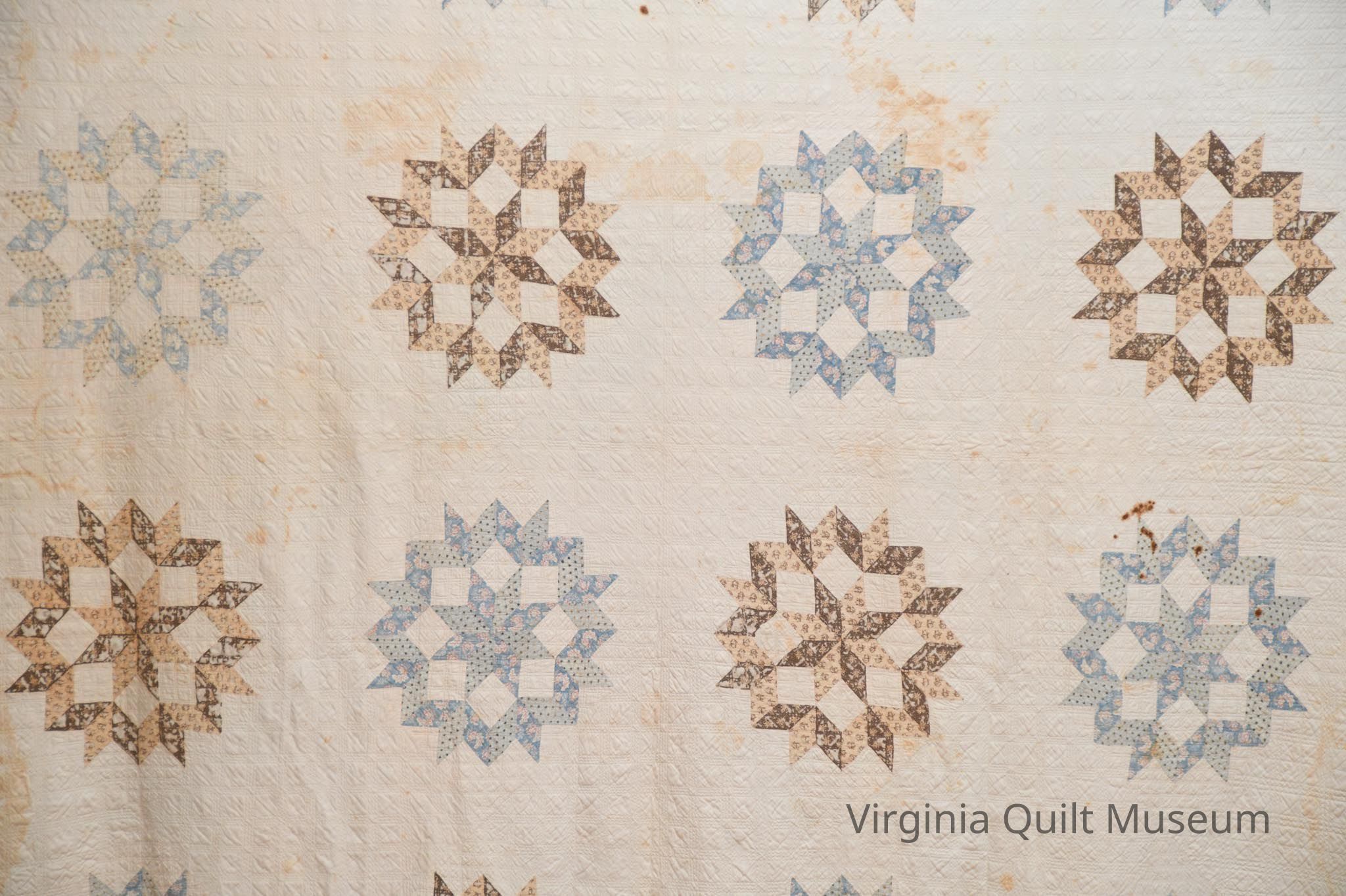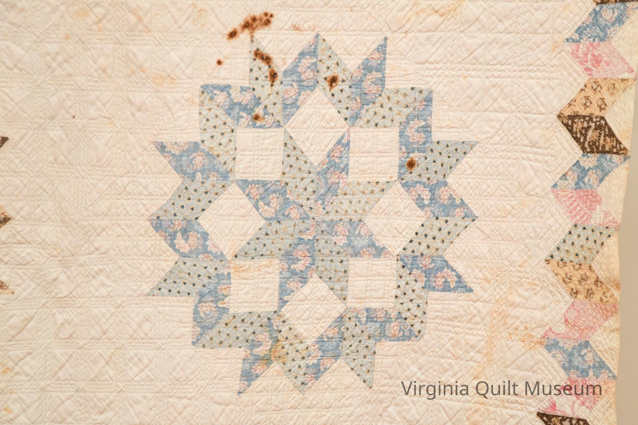 This quilt consists of 16 blocks pieced in the Star of Bethlehem pattern also known as the Carpenters Wheel. The pattern is created using diamond shaped pieces forming a ring around an eight-pointed star. The blocks, measuring approximately 16 inches square are placed on point and alternated with plain blocks of the same size. Colors used are light and dark shades of blue, brown, tan and pink. The background and backing are an off white. The 3 1/2" border repeats the diamond shapes and all of the print fabrics creating a zig-zag effect.  The edging is a very narrow 1/8" formed by rolling the backing fabric to the front.