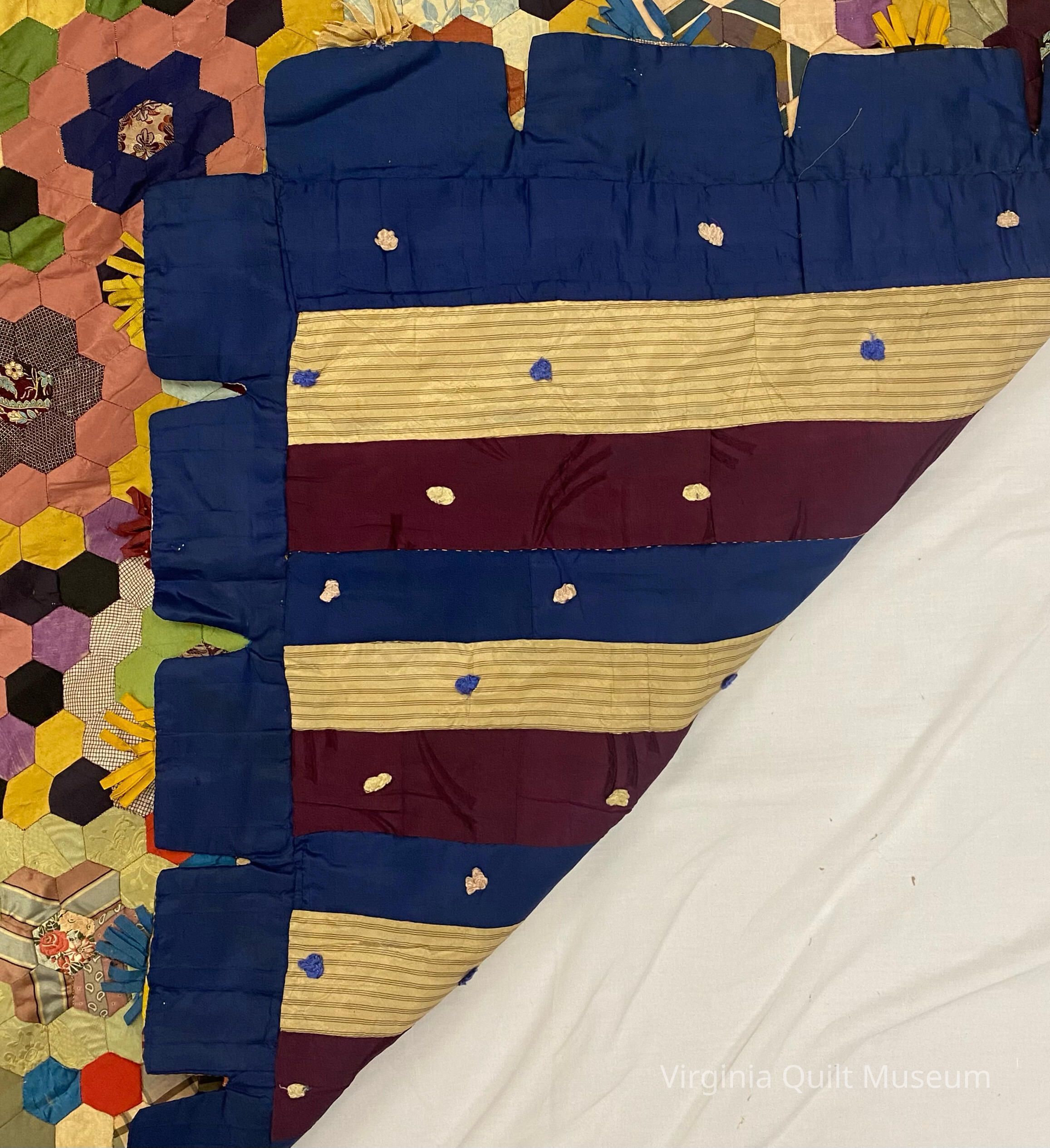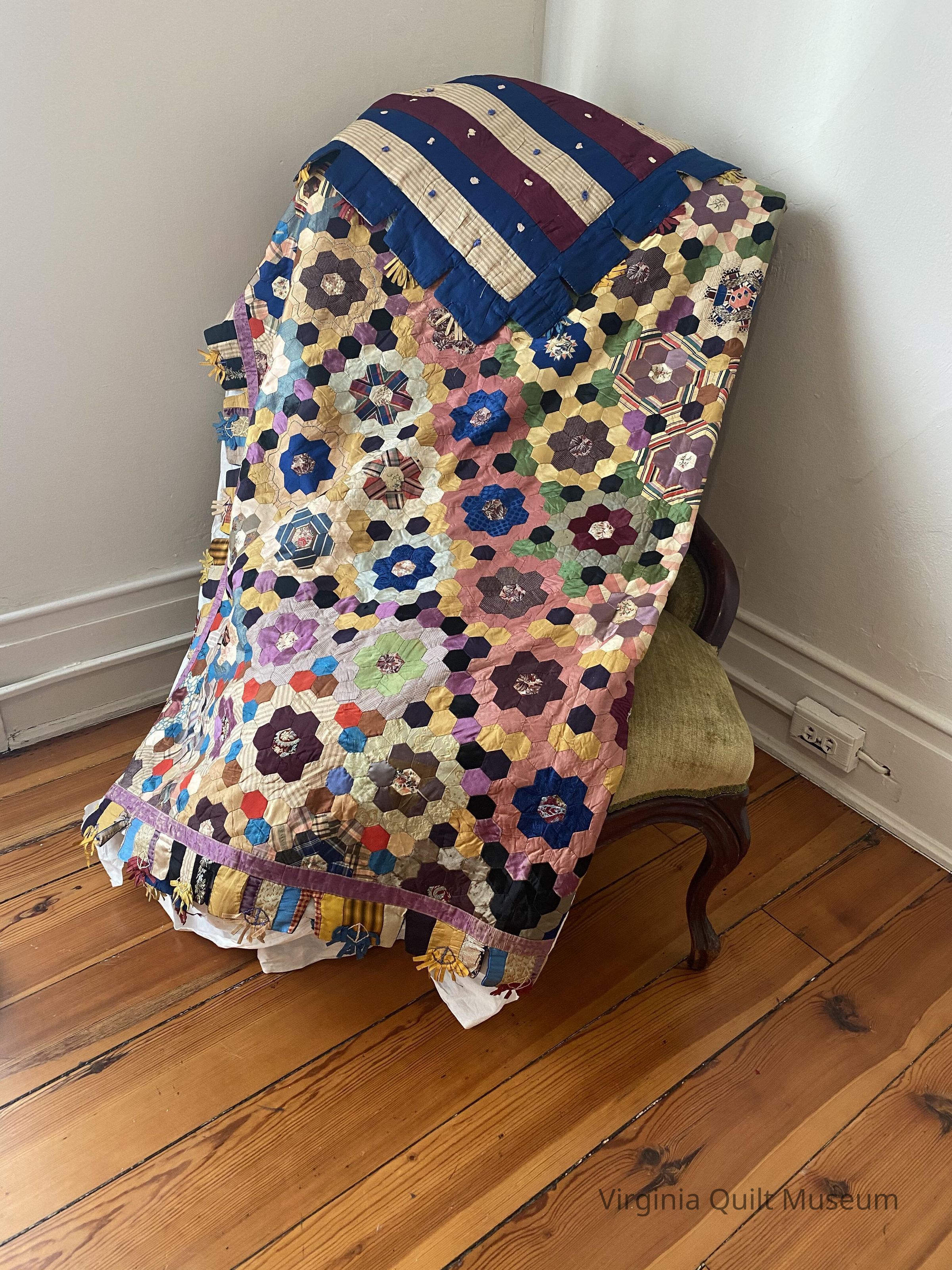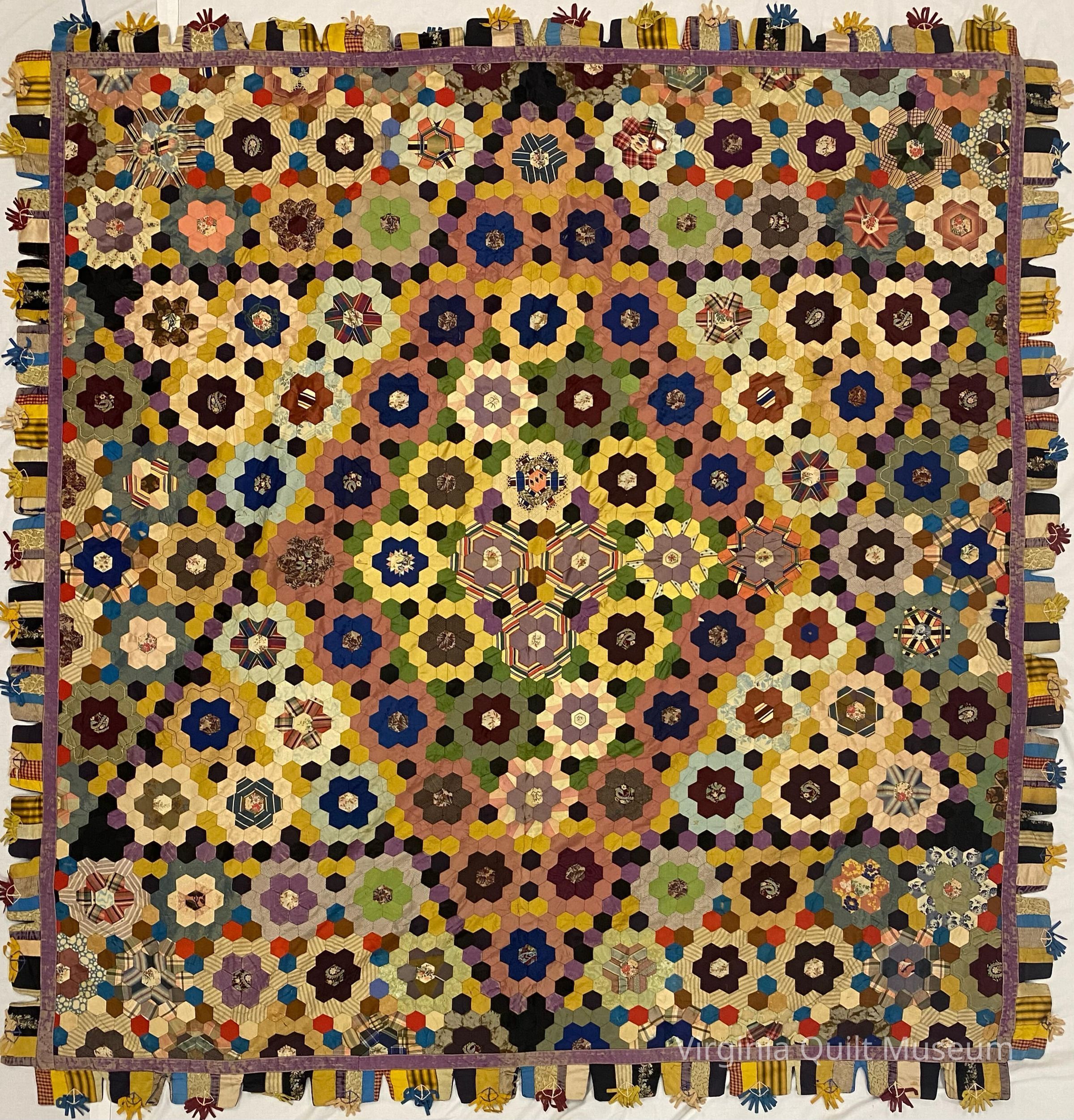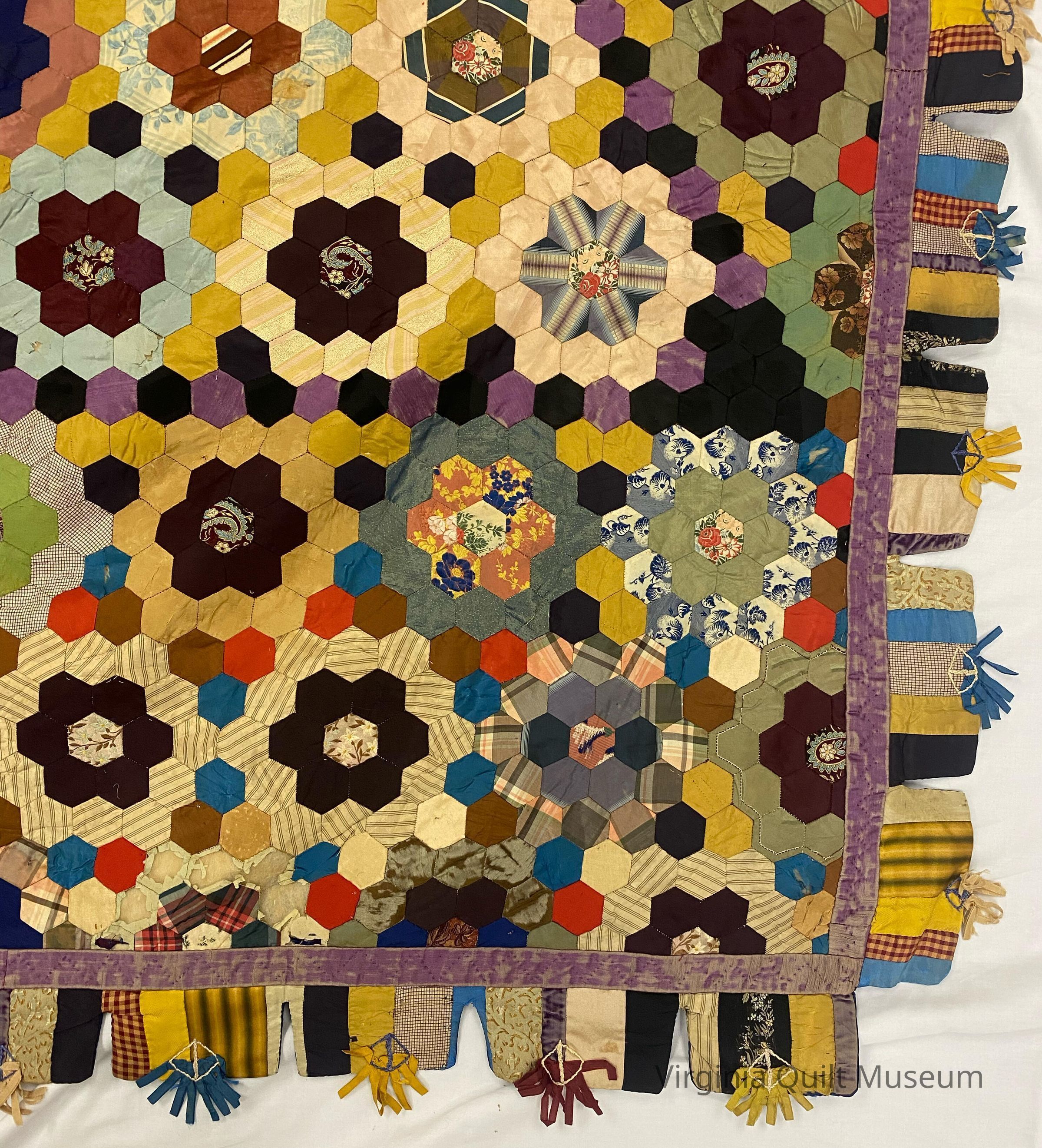 This quilt is an all-silk, hexagon quilt. It is made with a great variety of silks, including solids, brocades and embroidered fabrics. There is a Jerusalem star pattern as well as various other secondary patterns within the star. The back is a red, white, and blue stripe silk. The quilt is tied with hand quilting in the border. The edge is an unusual notched pattern of "tabs" with silk ribbon attached to each one with hand embroidered stitches.Context