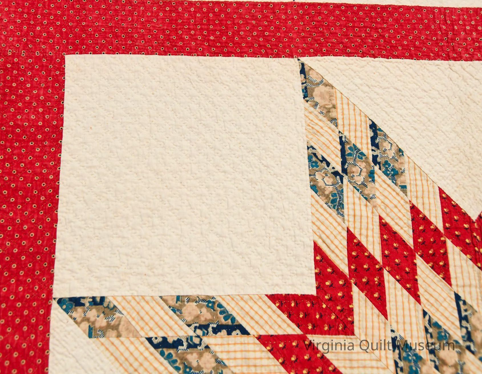 The entire quilt is hand-quilted using single, cotton thread. There are four colors of thread used, white, brown, and dark and light blue to match the block pattern. The Star of Bethlehem blocks include crosshatch quilting. The stitches measure about 7-9 stitches per inch.Collection