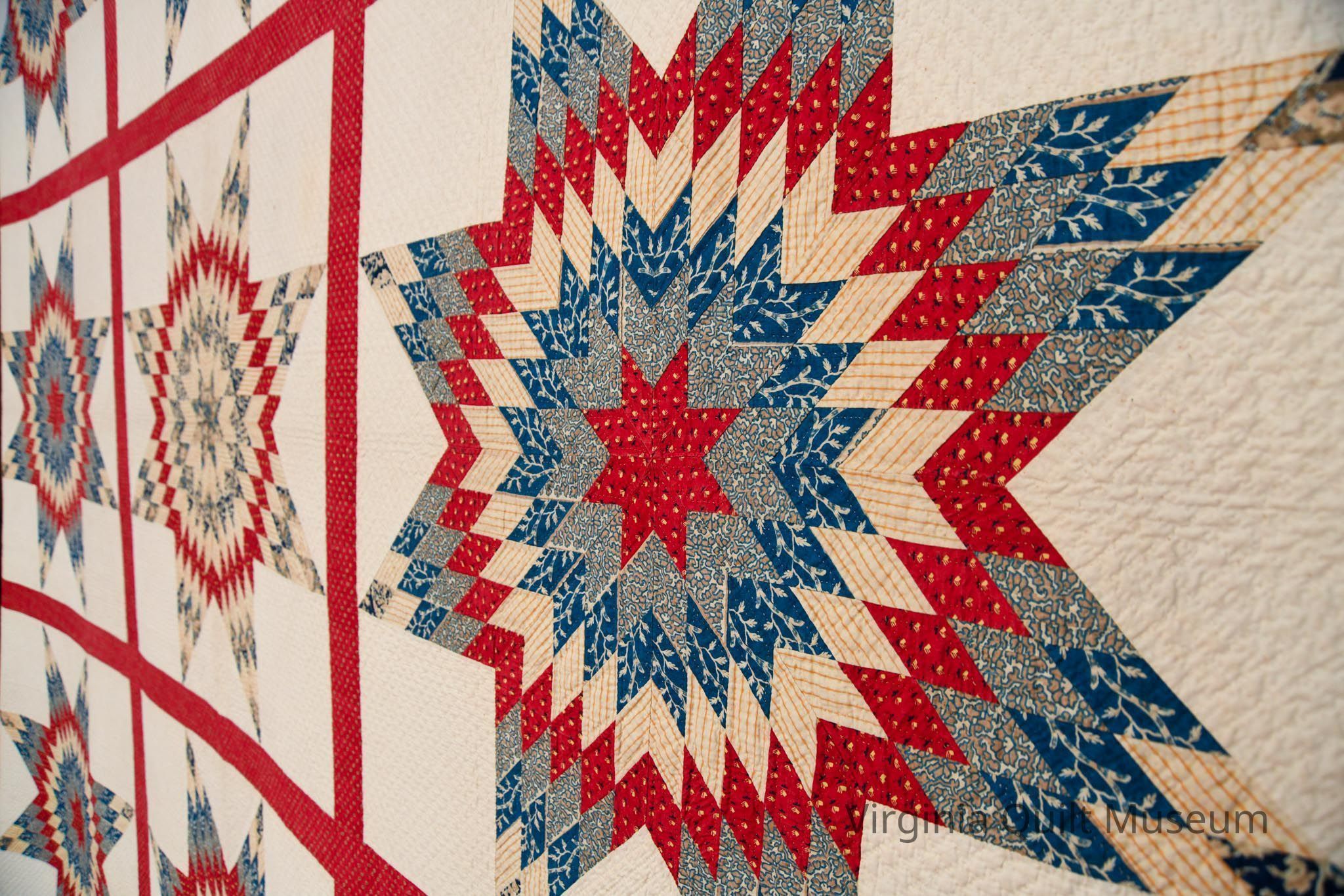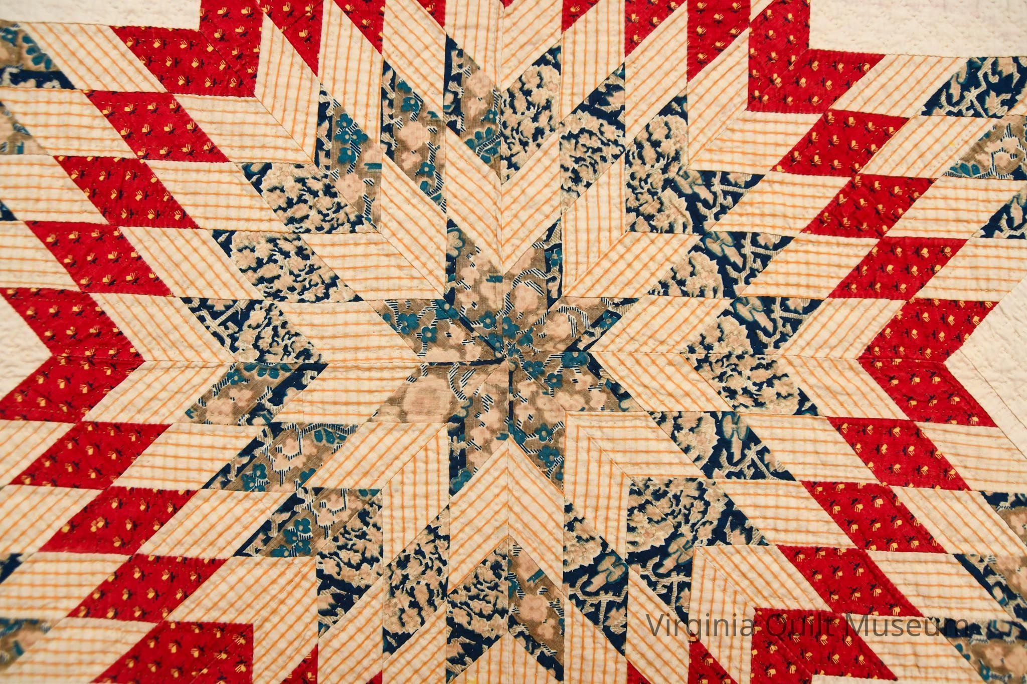 This quilt features 9 Star of Bethlehem blocks. Each block is made out of 200 diamond pieces. The quilt was likely made using new/purchased fabric. 8 of the 9 blocks are the same and the center block is different. The fabrics include a butterscotch stripe, 3 various lafayette blue floral prints, and a turkey red with yellow and red detailing. Between each block is a turkey red sashing with block polka dots.