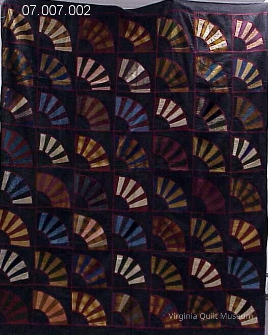 Handpieced to foundation with hand embroidered designs. Black ground in all blocks with fans facing the same direction. 56 blocks that are set in rows, 8 by 7.Context