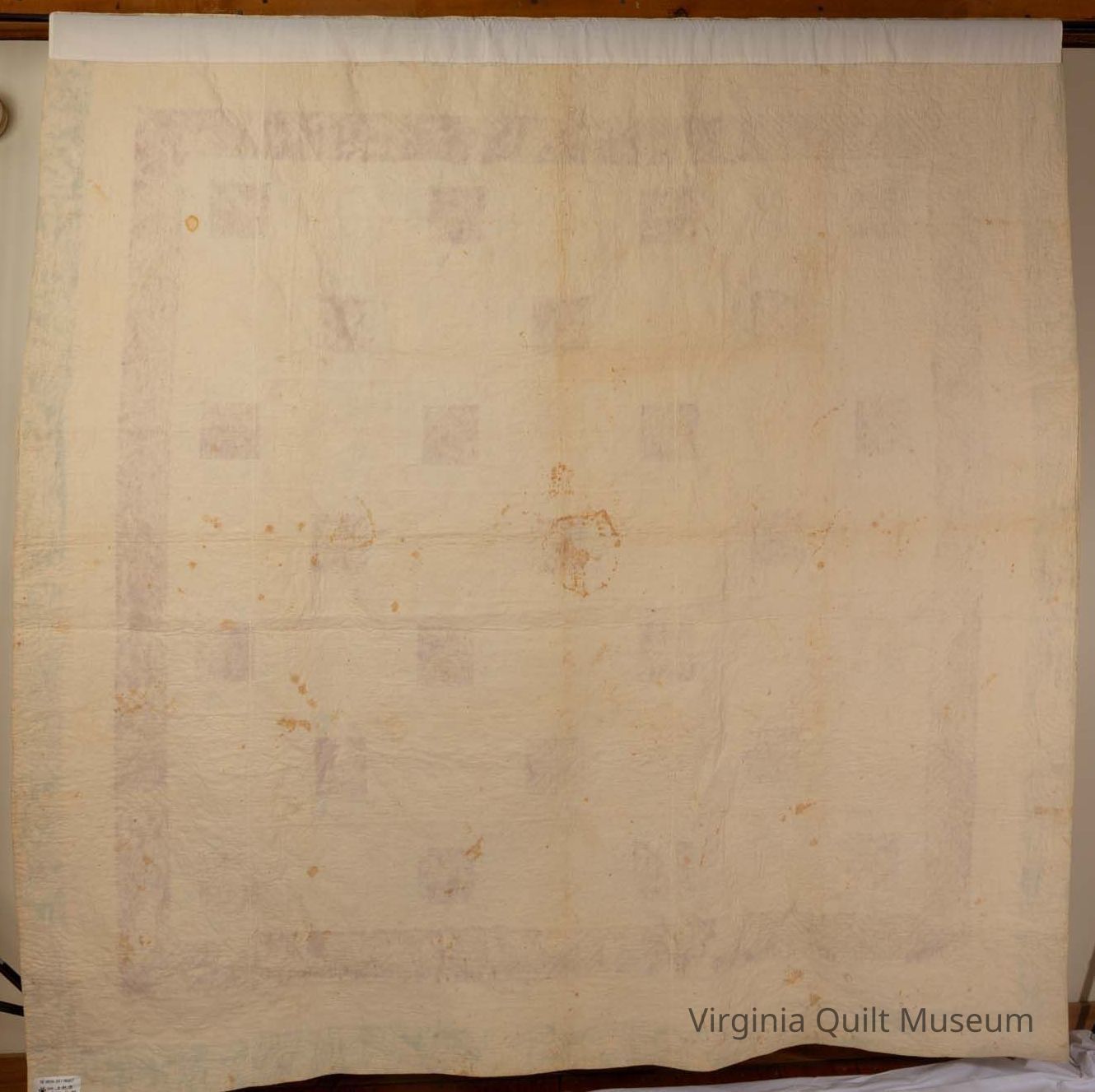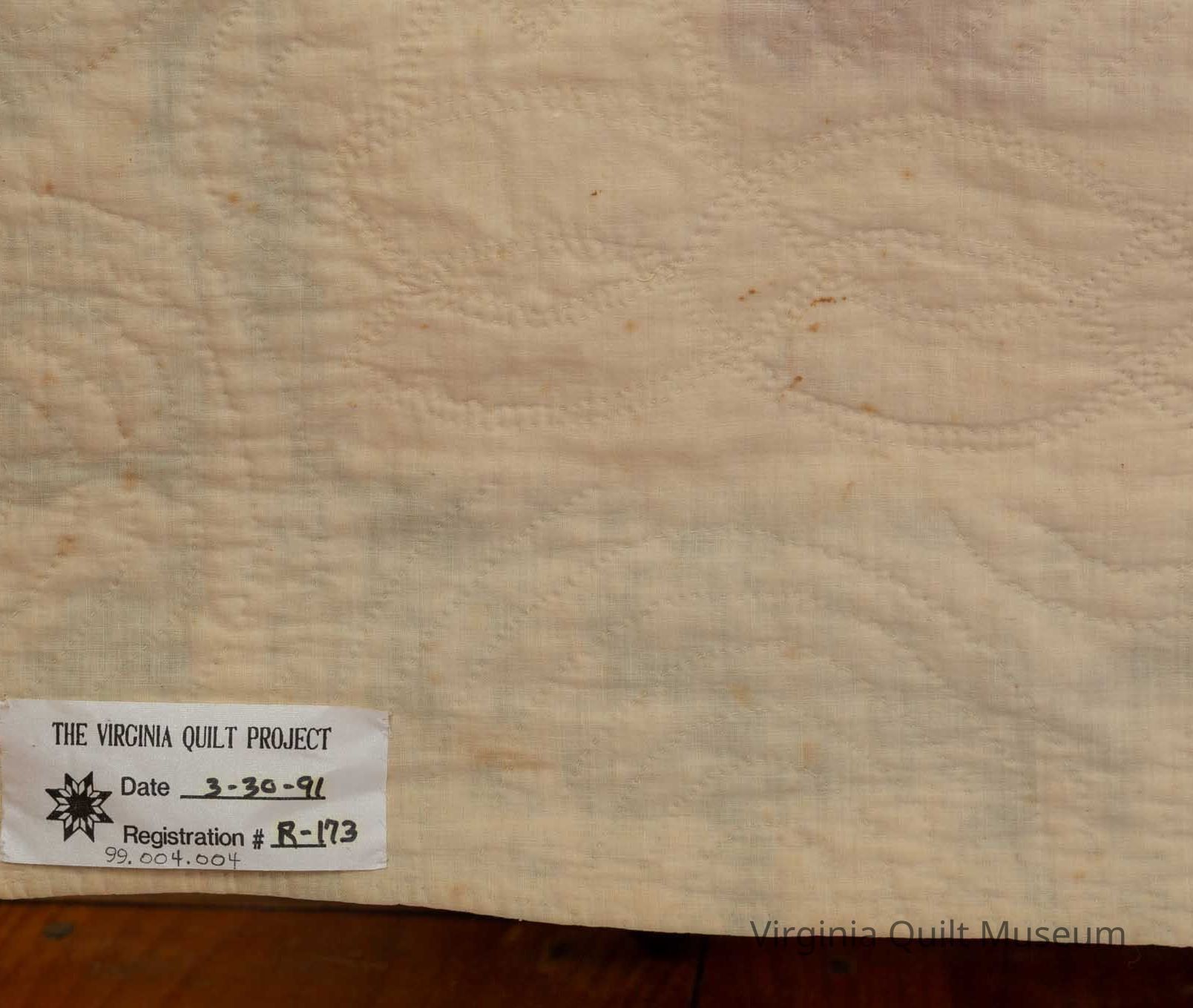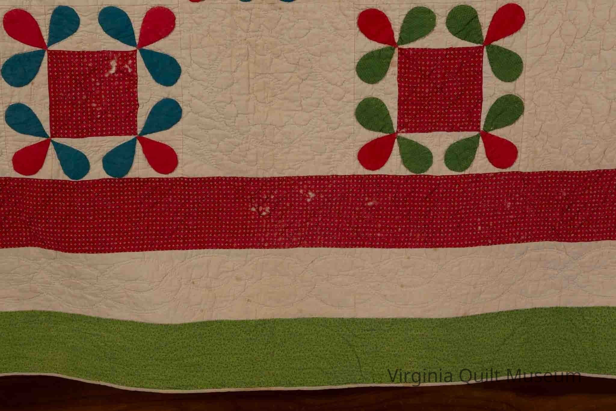 The border consists of three strips, each measuring 4" wide and is on all four sides.  The backing was brought to the front as the edging. A label attached to the backing is from the Virginia Quilt Project, dated 1991.