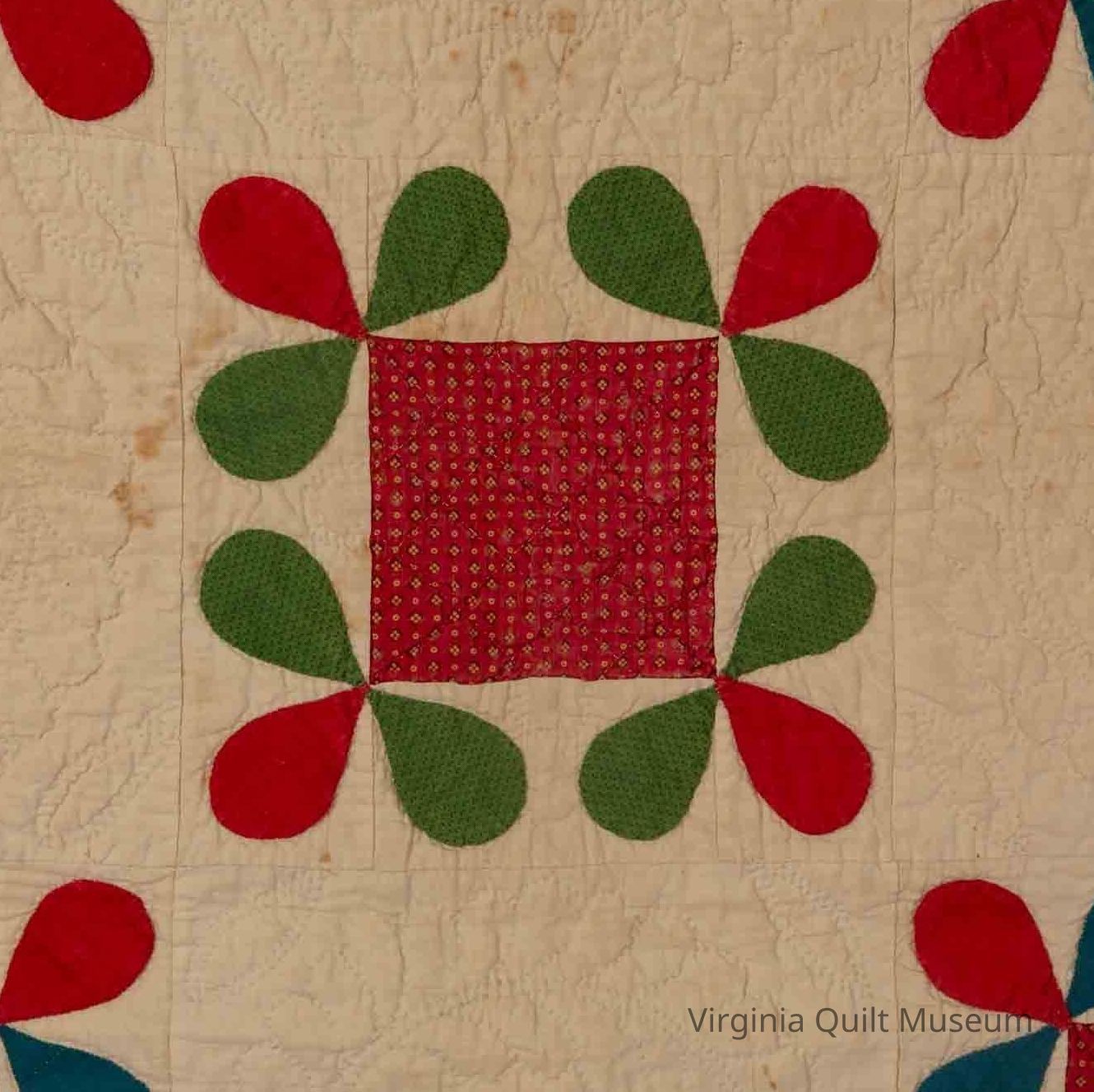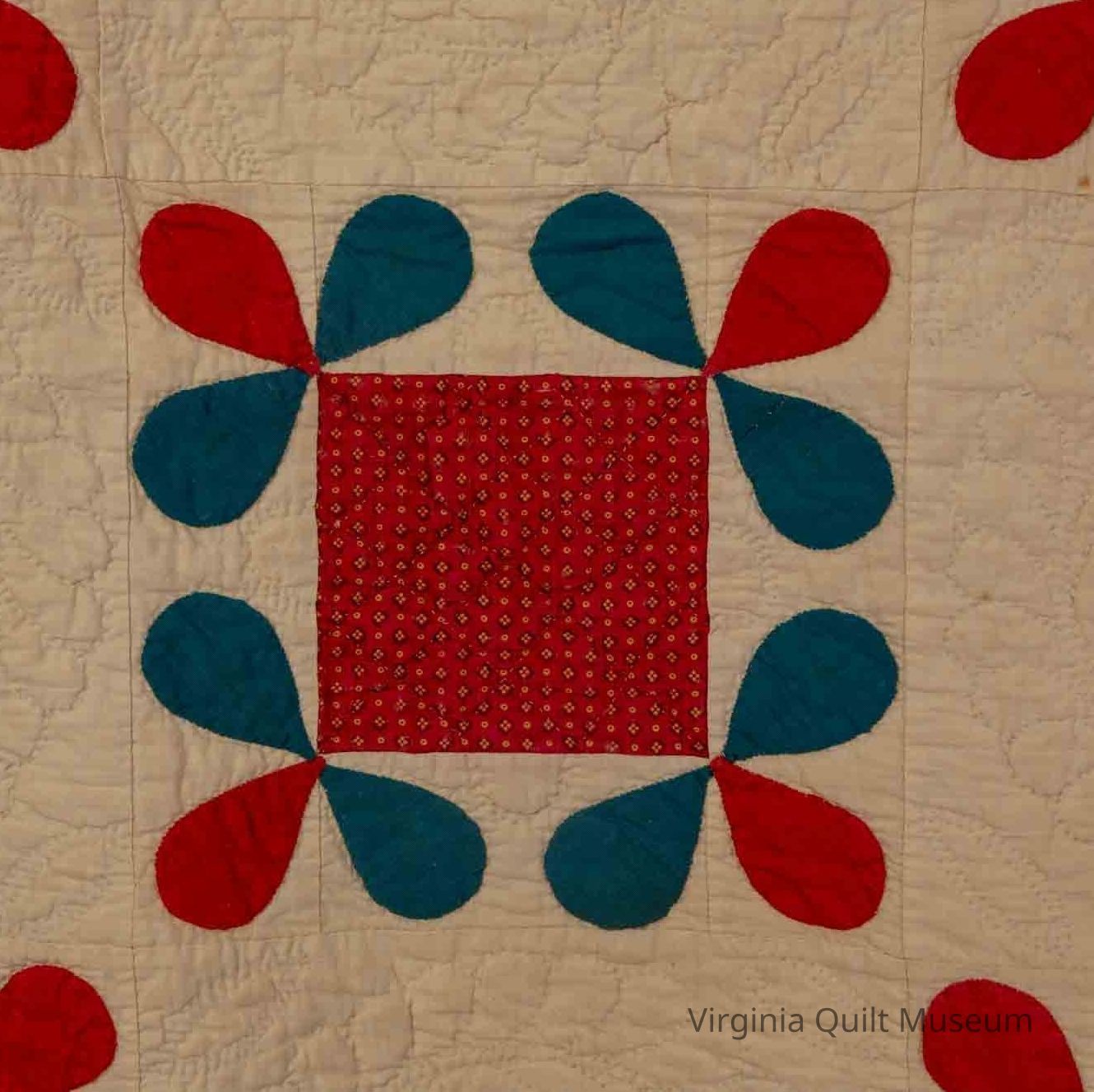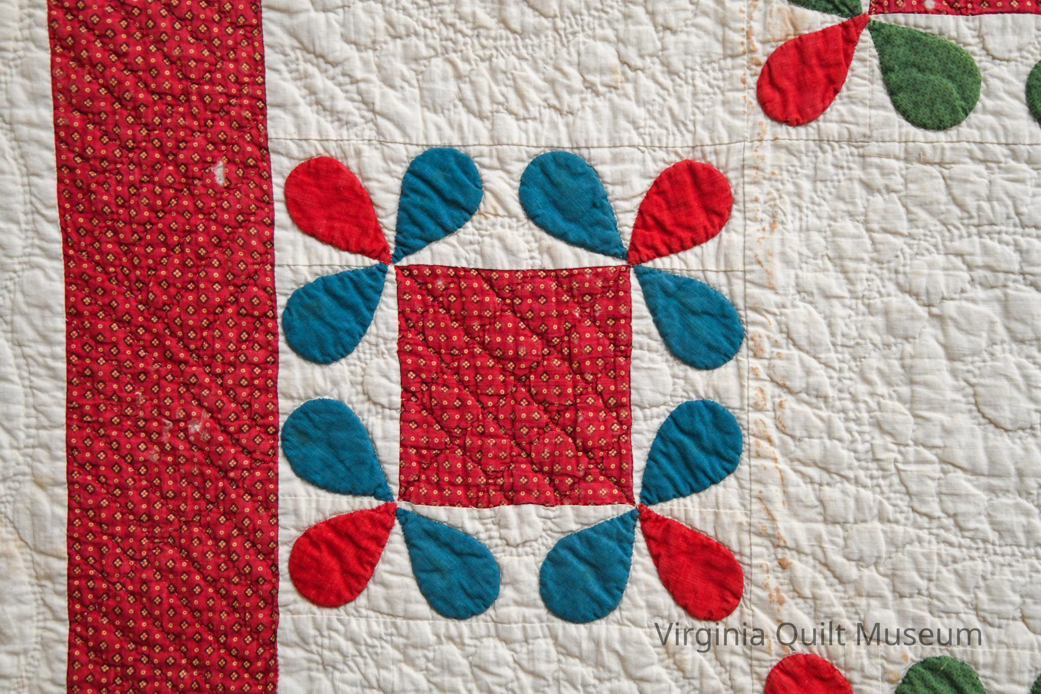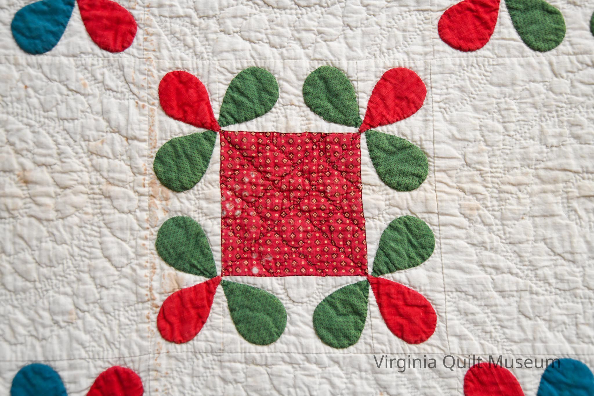 The quilting consists of a cable on the middle border, half concentric circles on outer border, and straight lines forming triangles on the inside border. A wreath was used on the like-size plain blocks. Cross hatching lines on the center of the pieced block and outline of the petals.Context