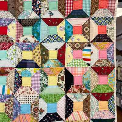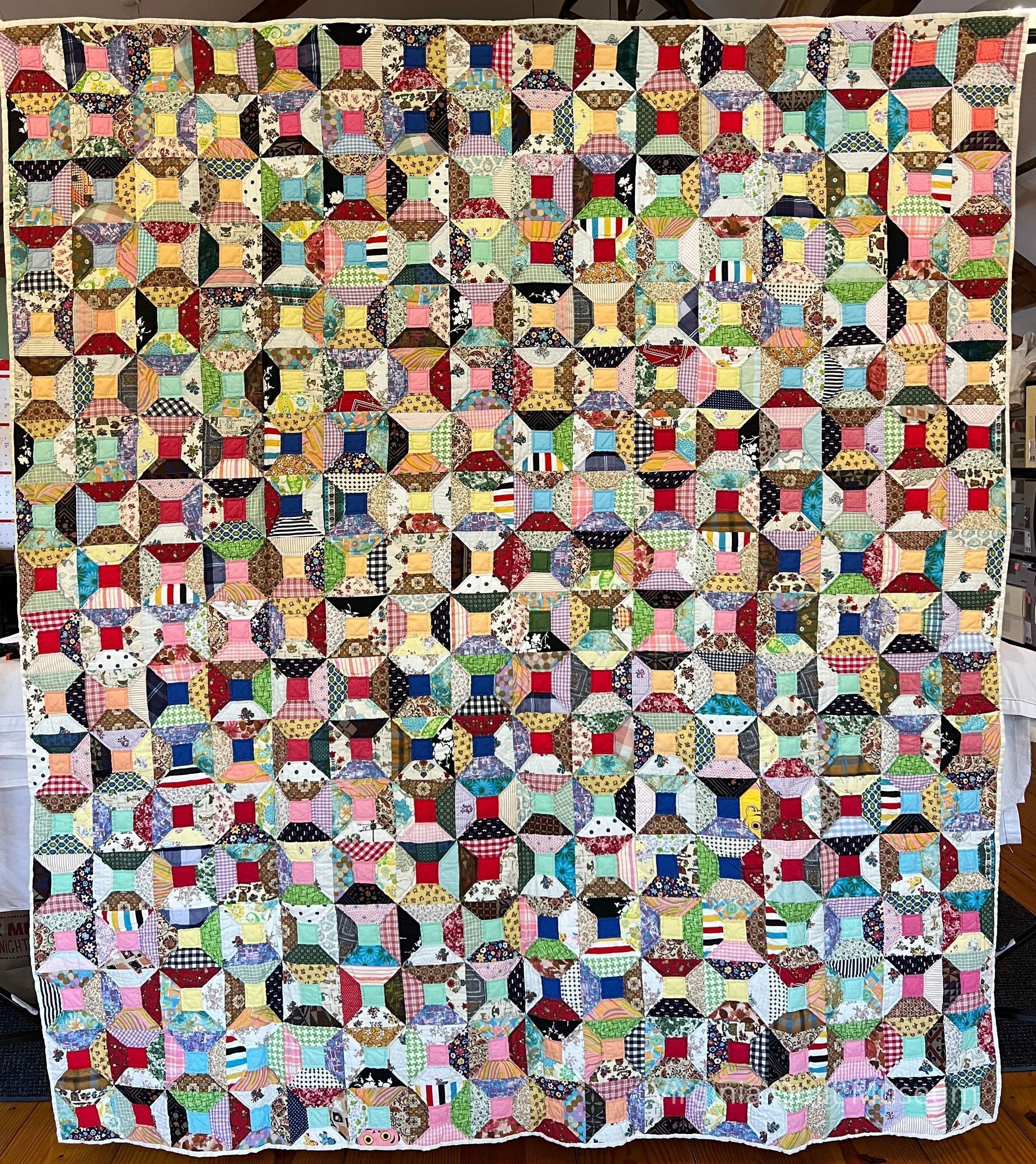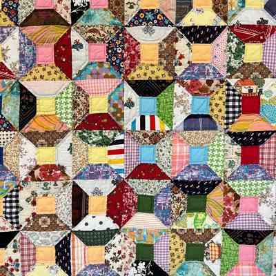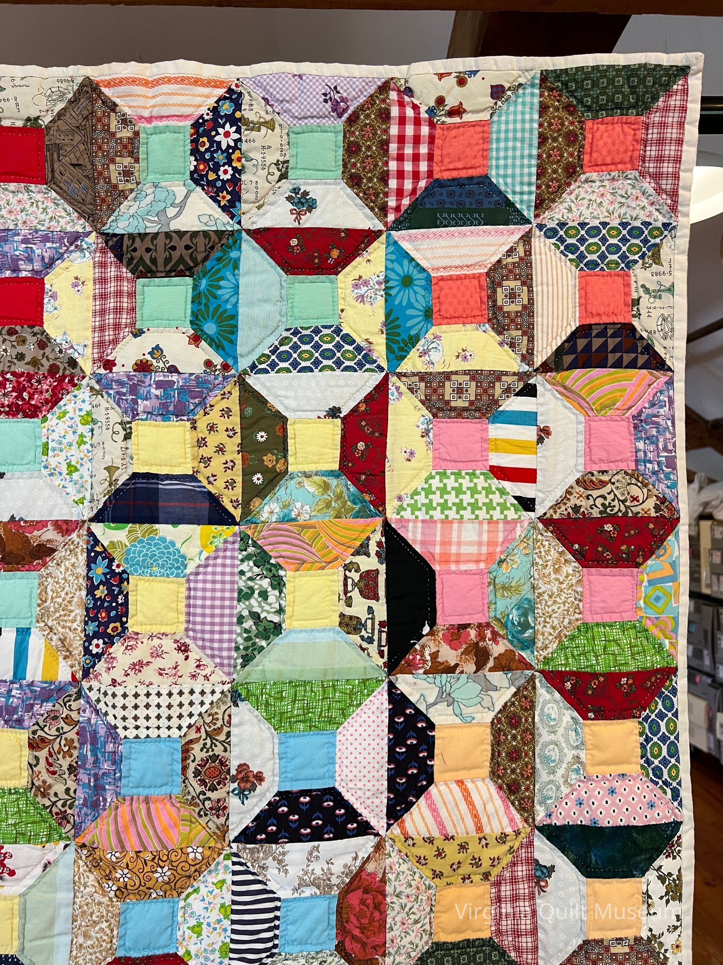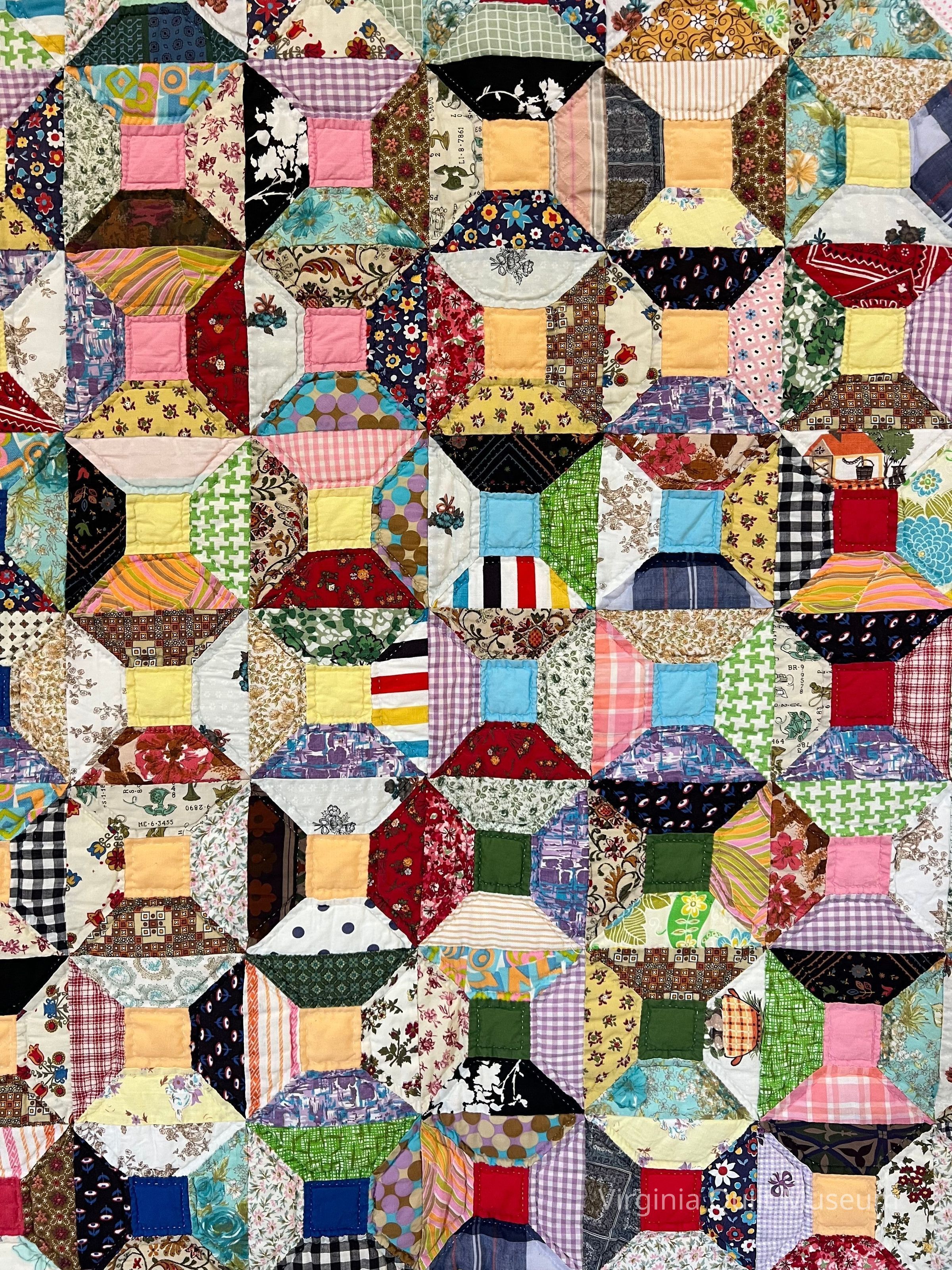 repeating hand pieced blocks, featuring a central square surrounded by trapezoidal pieces, likely made of old scraps, includes a wide range of fabrics. Quilting outlines each shape within the blocks. Narrow back to front binding.Made/Created