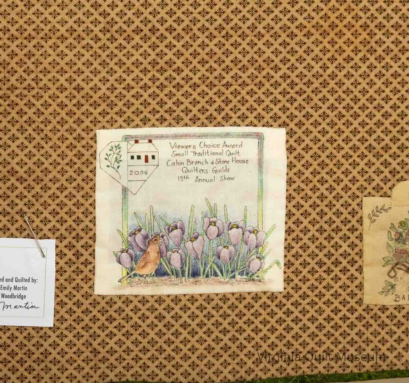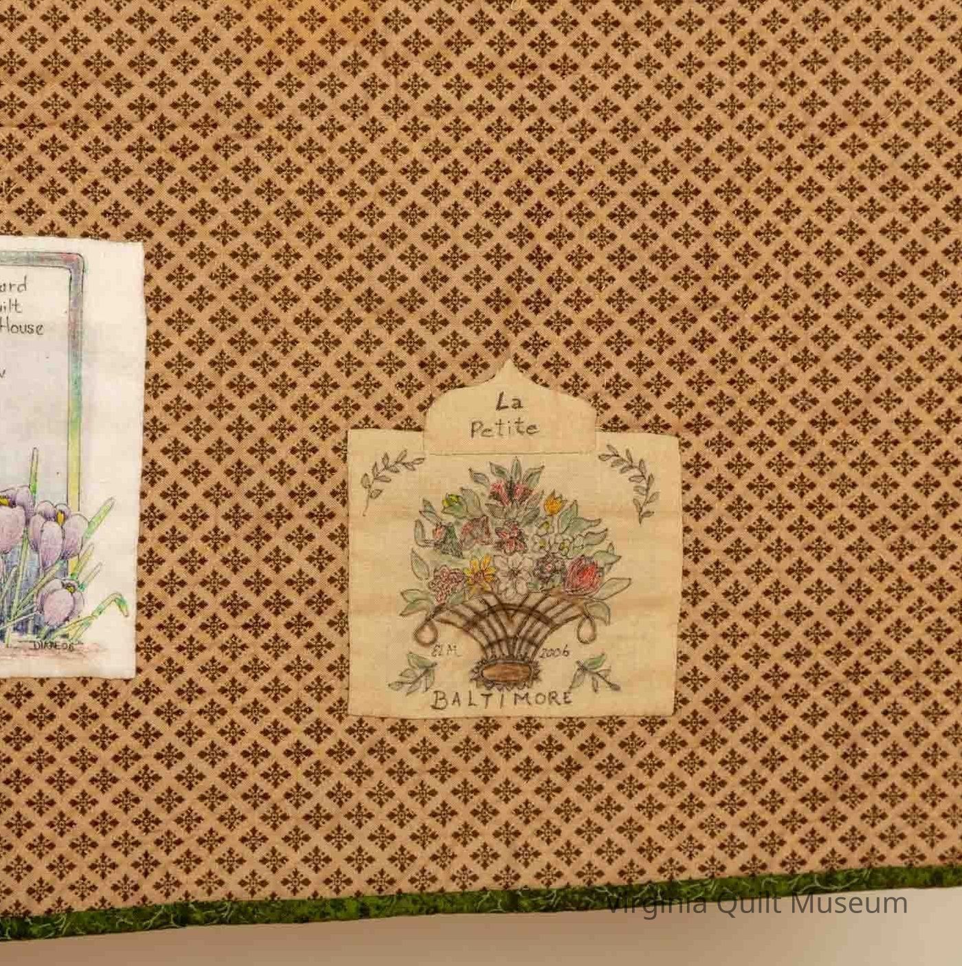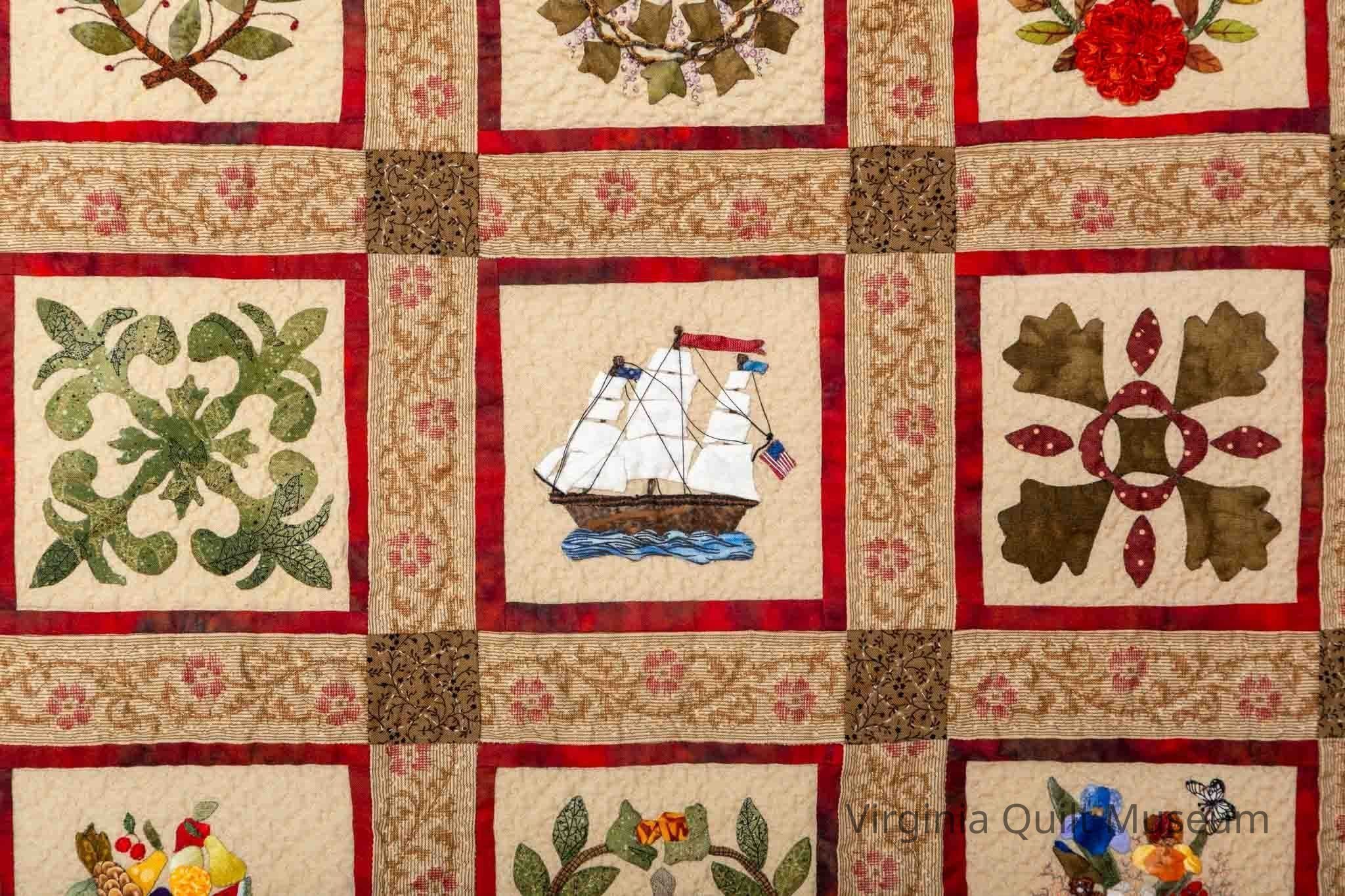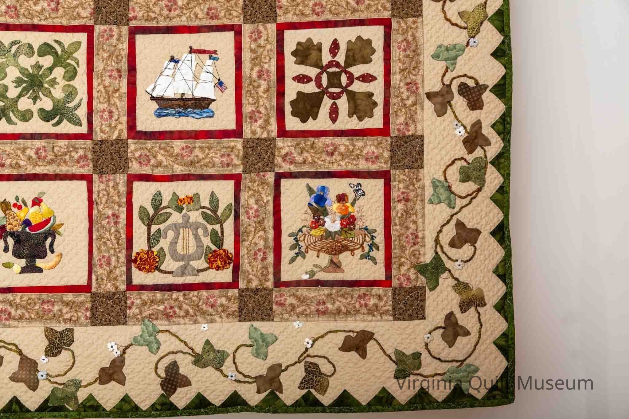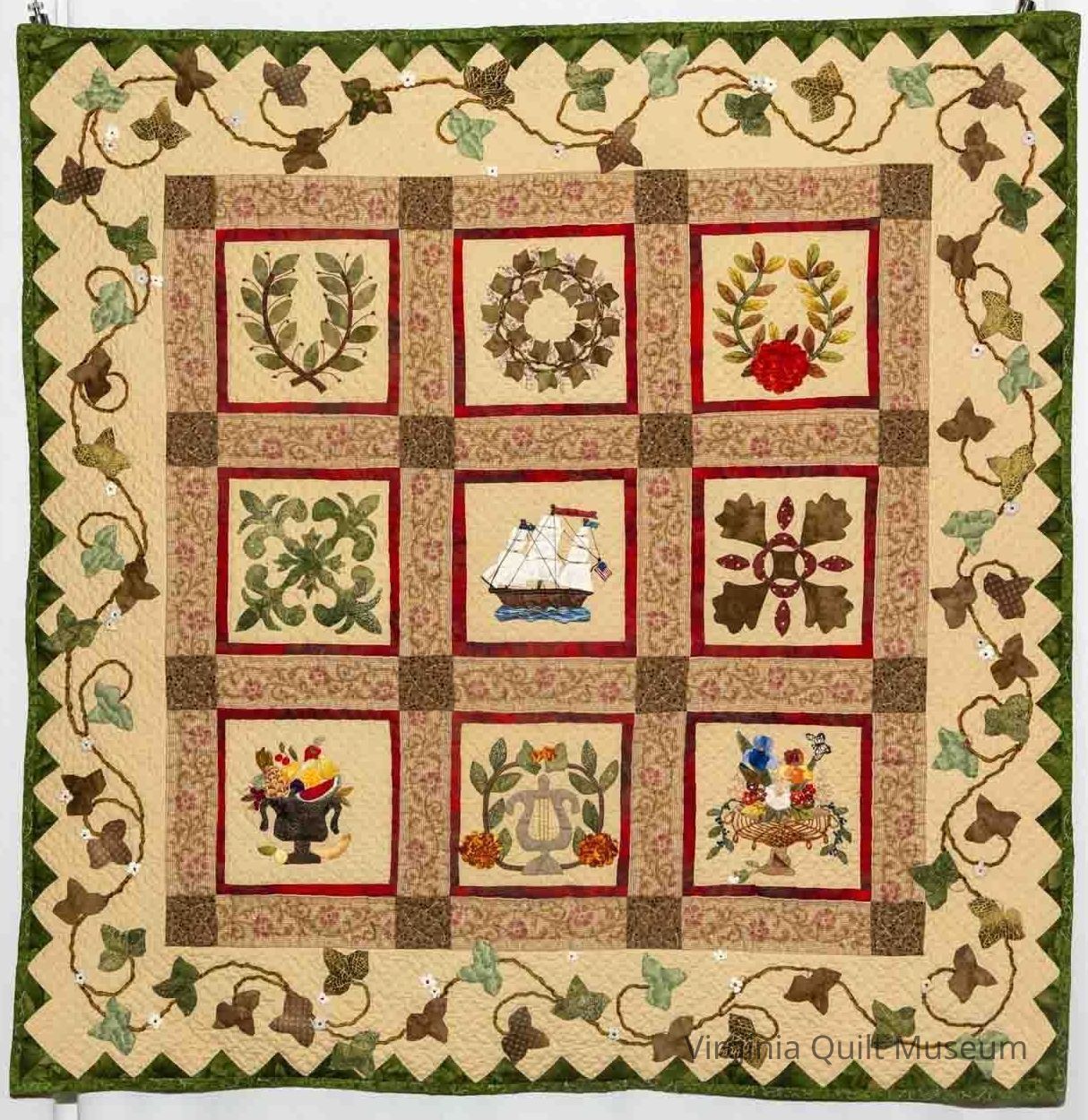 Nine Baltimore Album blocks are set side by side into a 3x3 configuration with 1 1/4 inch sashing and dark brown cornerstones. Each block is bordered with 1/4 inch red. There are 9 unique blocks that include a ship, wreaths and urns of flowers. These blocks feature traditional applique, reverse applique, fabric manipulation, stuffed work, and hand embroidery. Each of the 9 blocks are set ingot a grid pattern with tan 1 1/4'' sashing. The sashing is quilted to pattern in fussy cut fabric. The border is 3 1/2'' wide and features an undulating vine of ivy leaves with floral buttons. The vine is couched wool. The quilt is finished with a pieced sawtooth. Th edge is 1/4 inch wide applied green cotton with mitered corners.