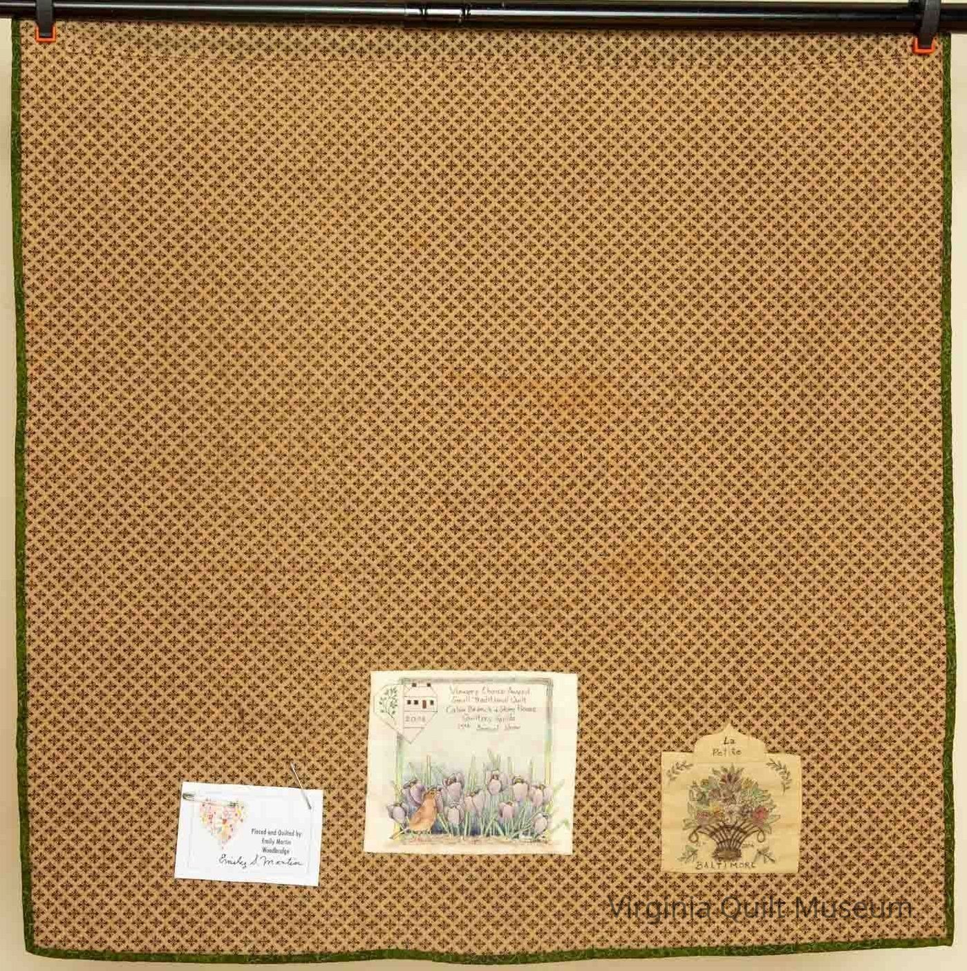 Finely hand quilted by Emily Martin (maker). Blocks and border feature 1/4 inch crosshatch. Crossed pumpkin seeds are quilted in the cornerstones. Stitches measure 8 stitches per inch and used single, cotton, cream thread.Acquisition