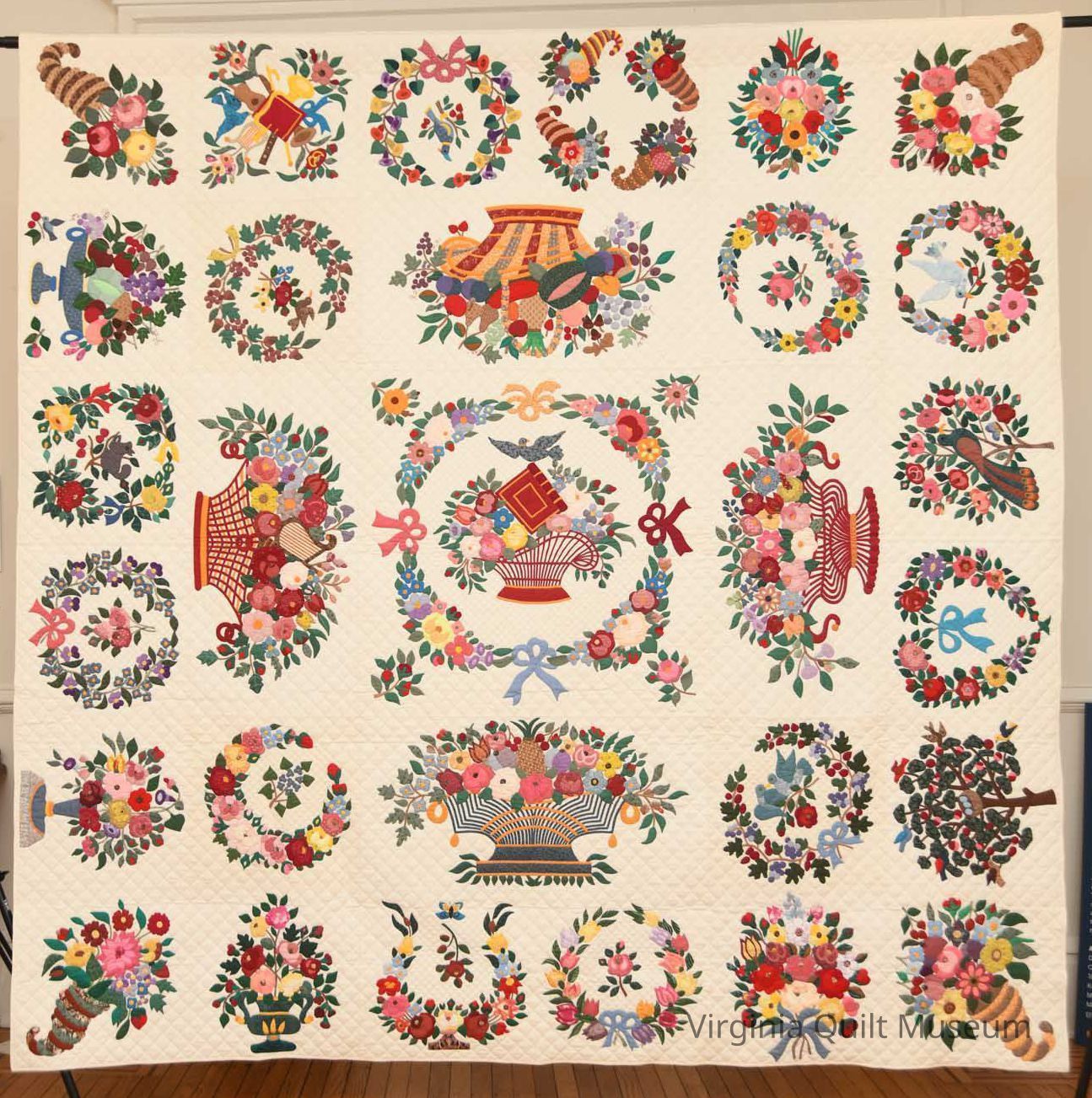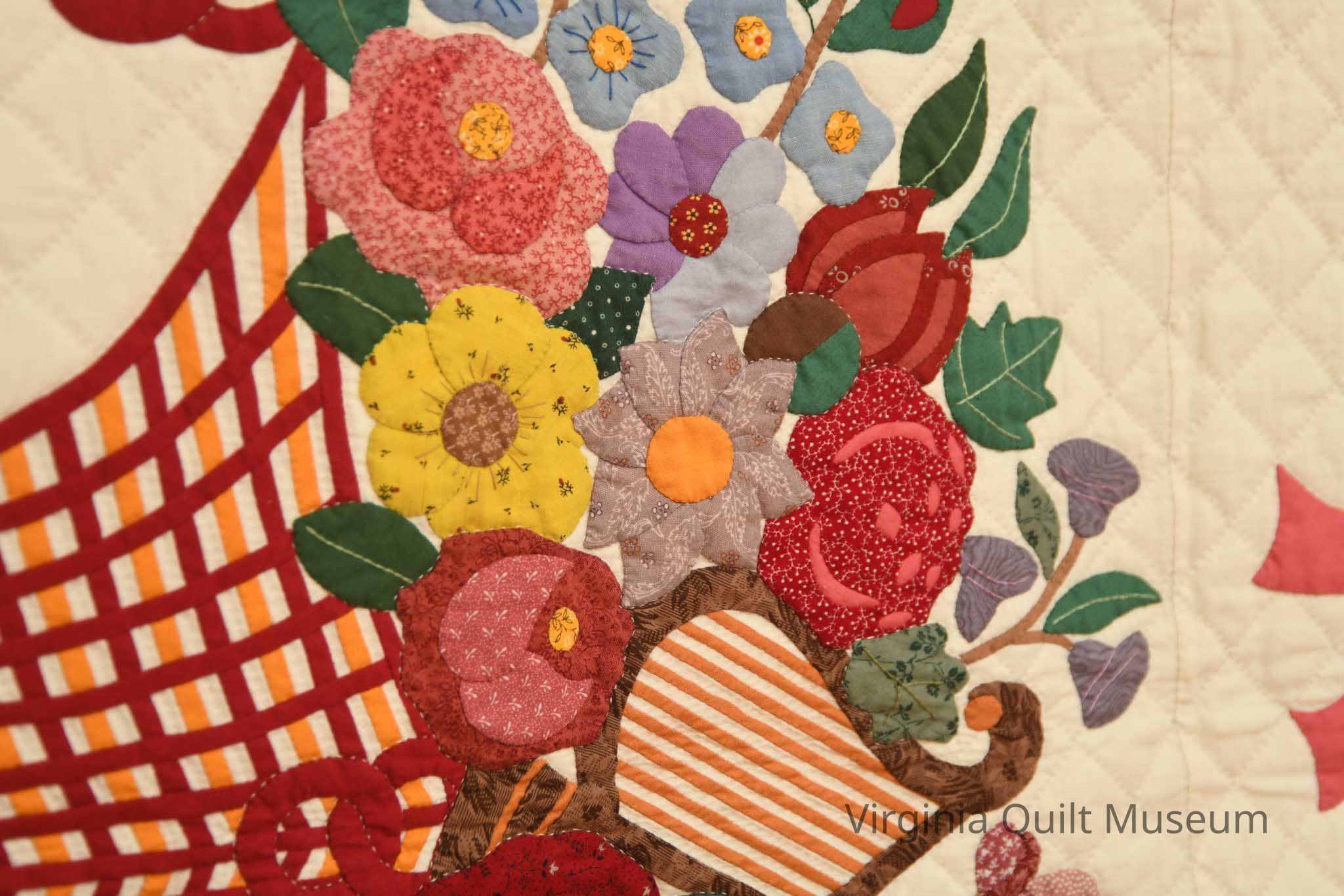 Baltimore Album quilt hand appliquéd and hand quilted. The quilting is all extremely even with about 9 stiches per inch. It uses a single cotton, white thread. The quilting itself is a grid pattern about 1/2'' to an 1'' apart. It also incorporates inking and embroidery throughout.