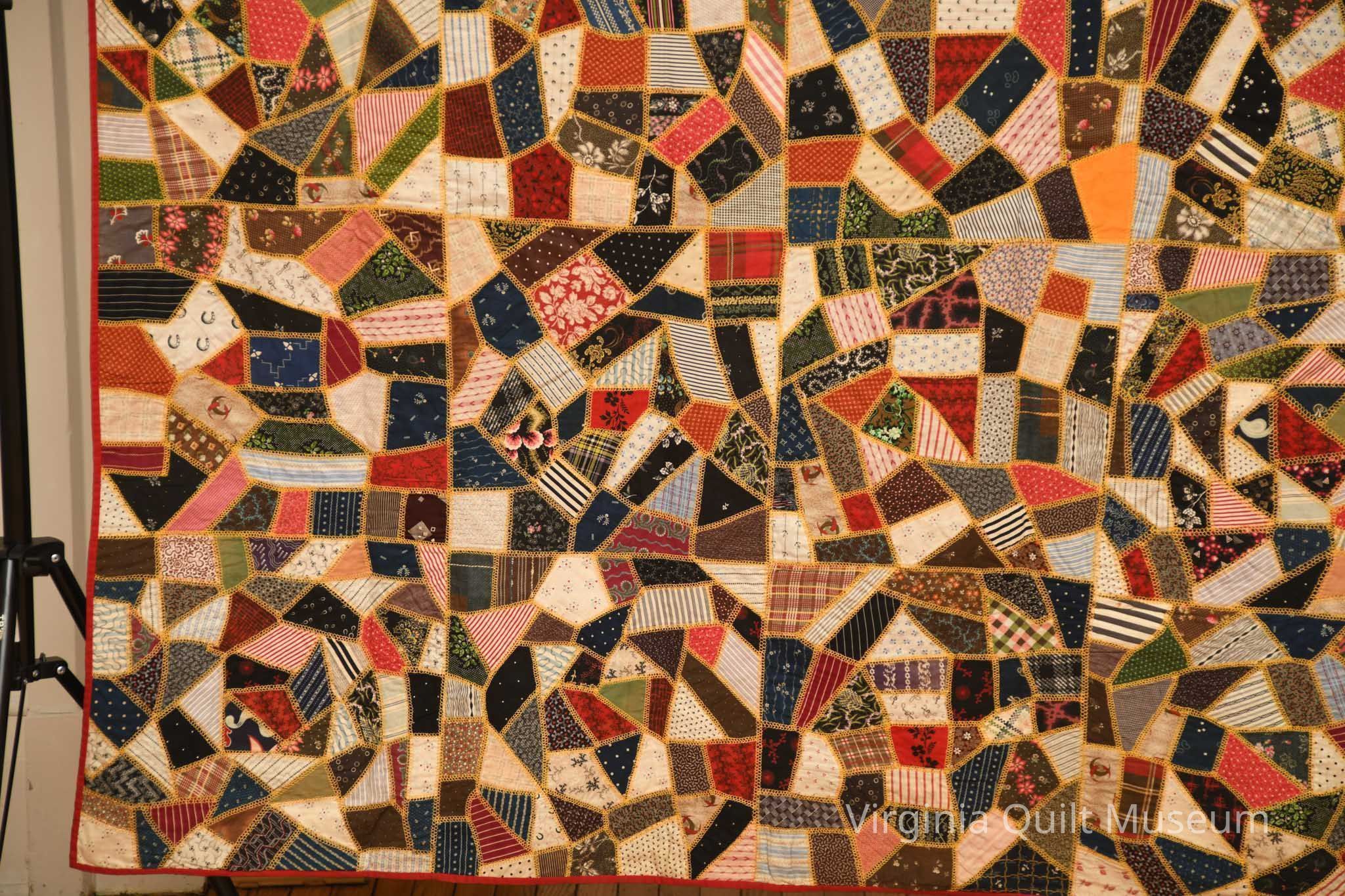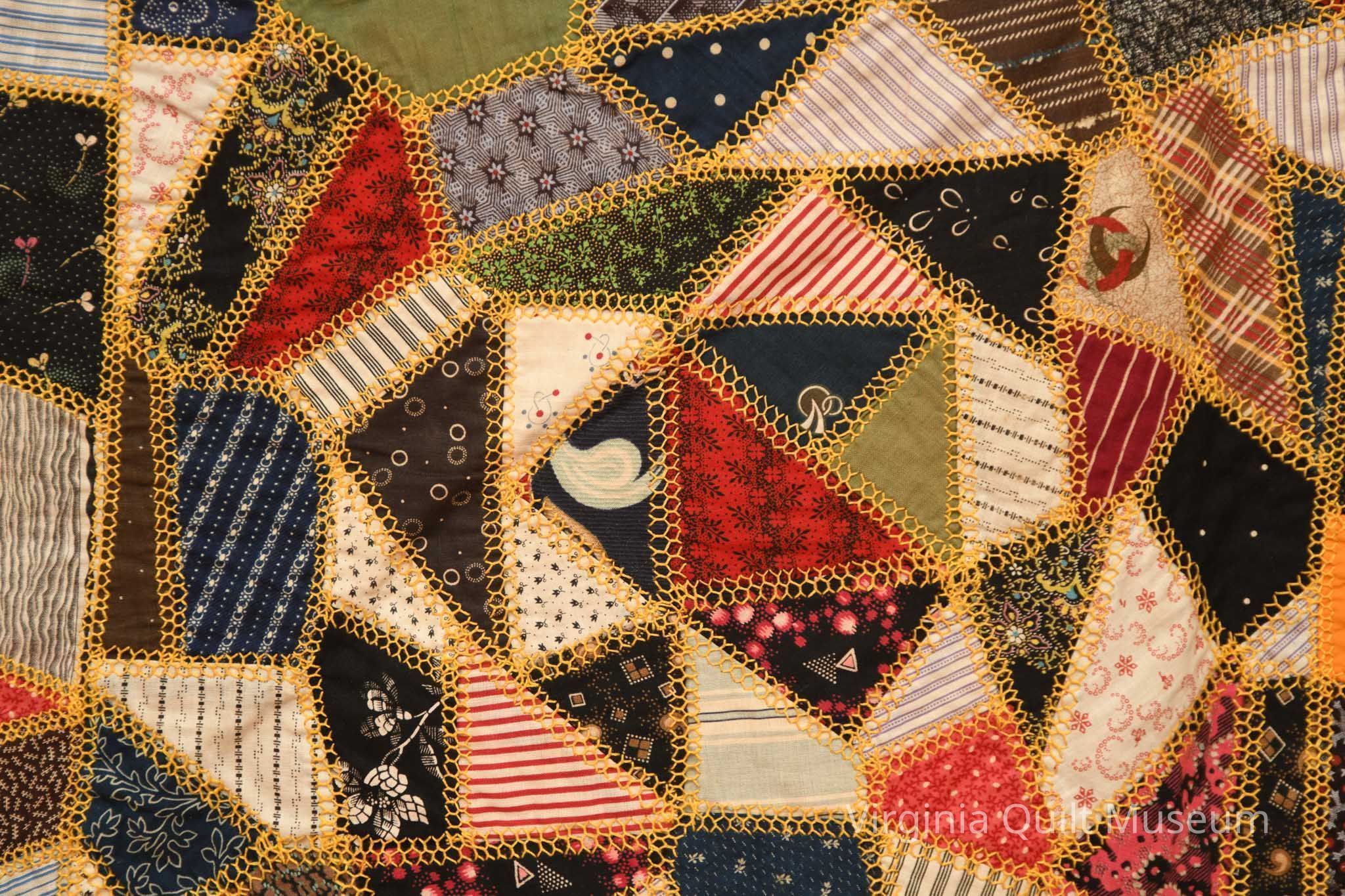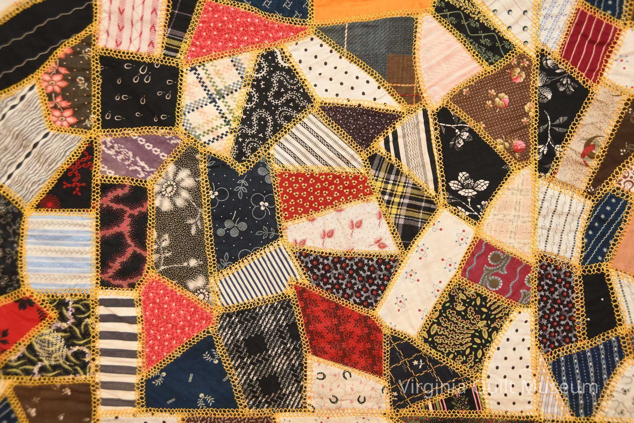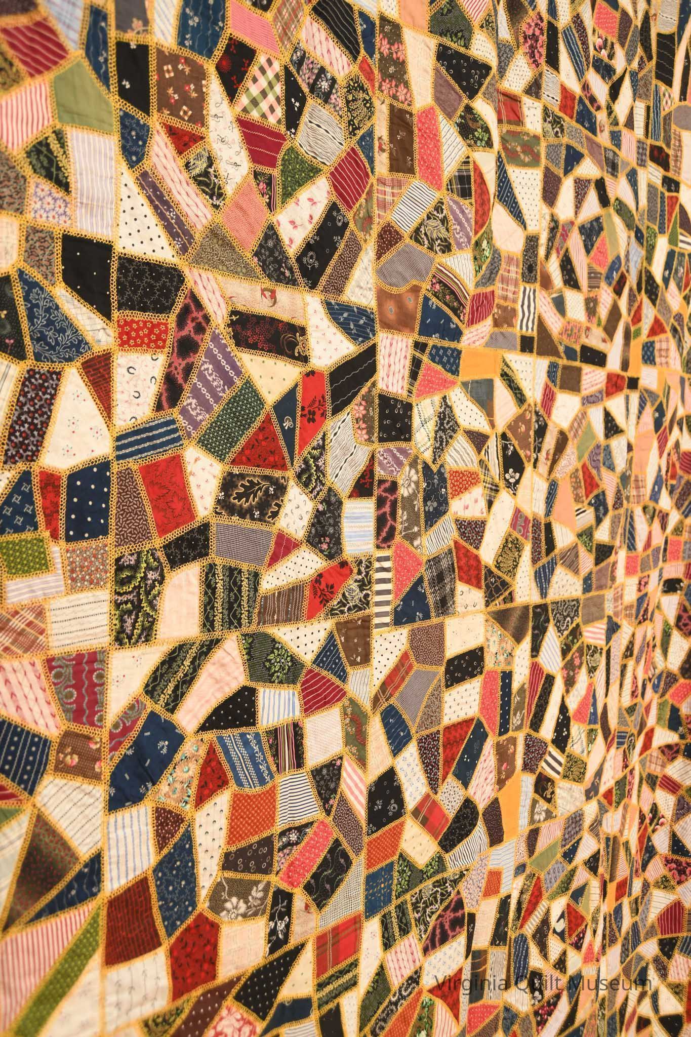 30 blocks (5 columns by 6 rows) set sides edge to edge. Random cuts of fabric set abstractly within blocks. Likely made from old/scrap fabric. Each piece is outlined in yellow embroidery. All the embroidery uses 1 strand of cotton thread or embroidery floss.