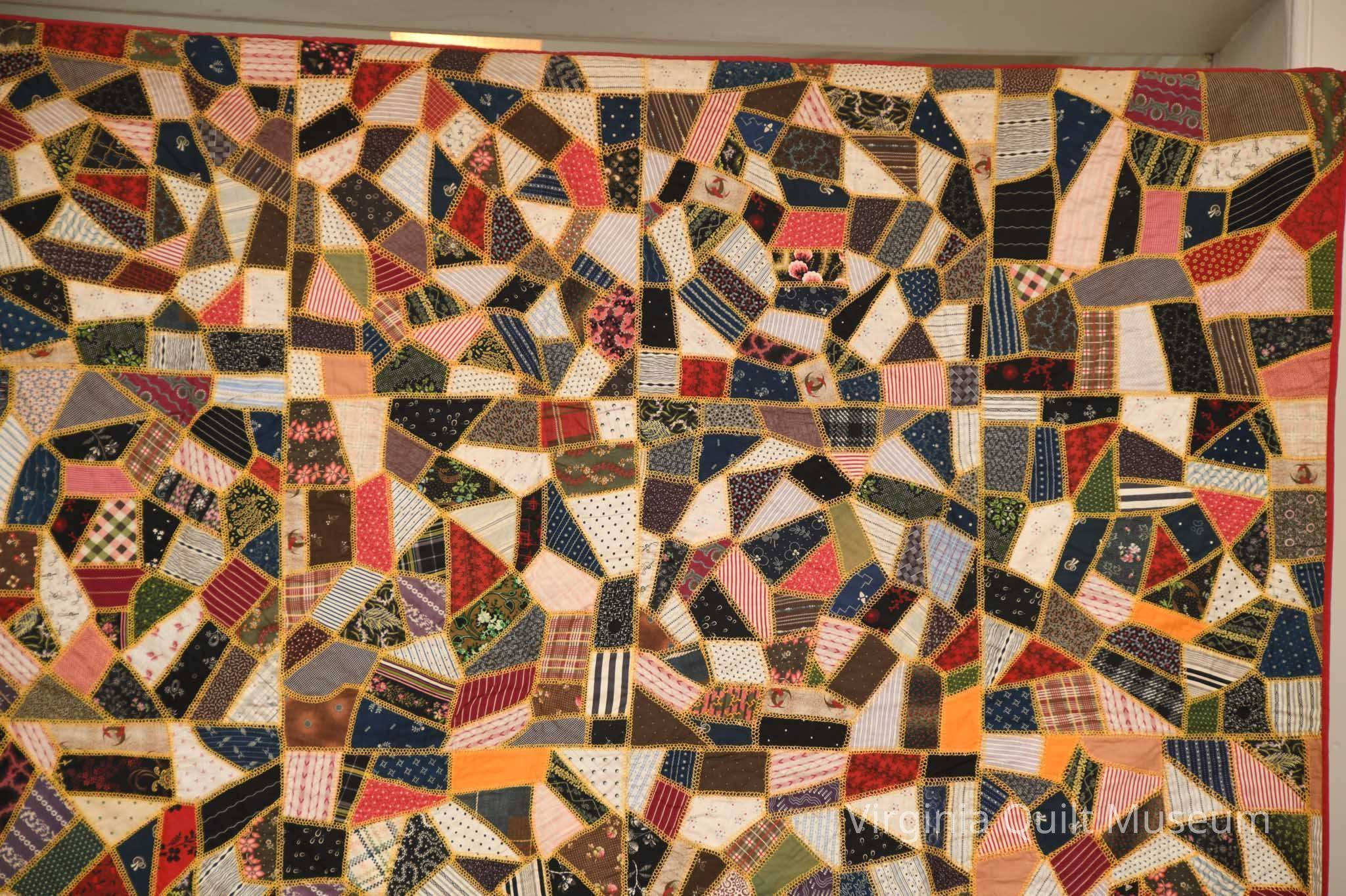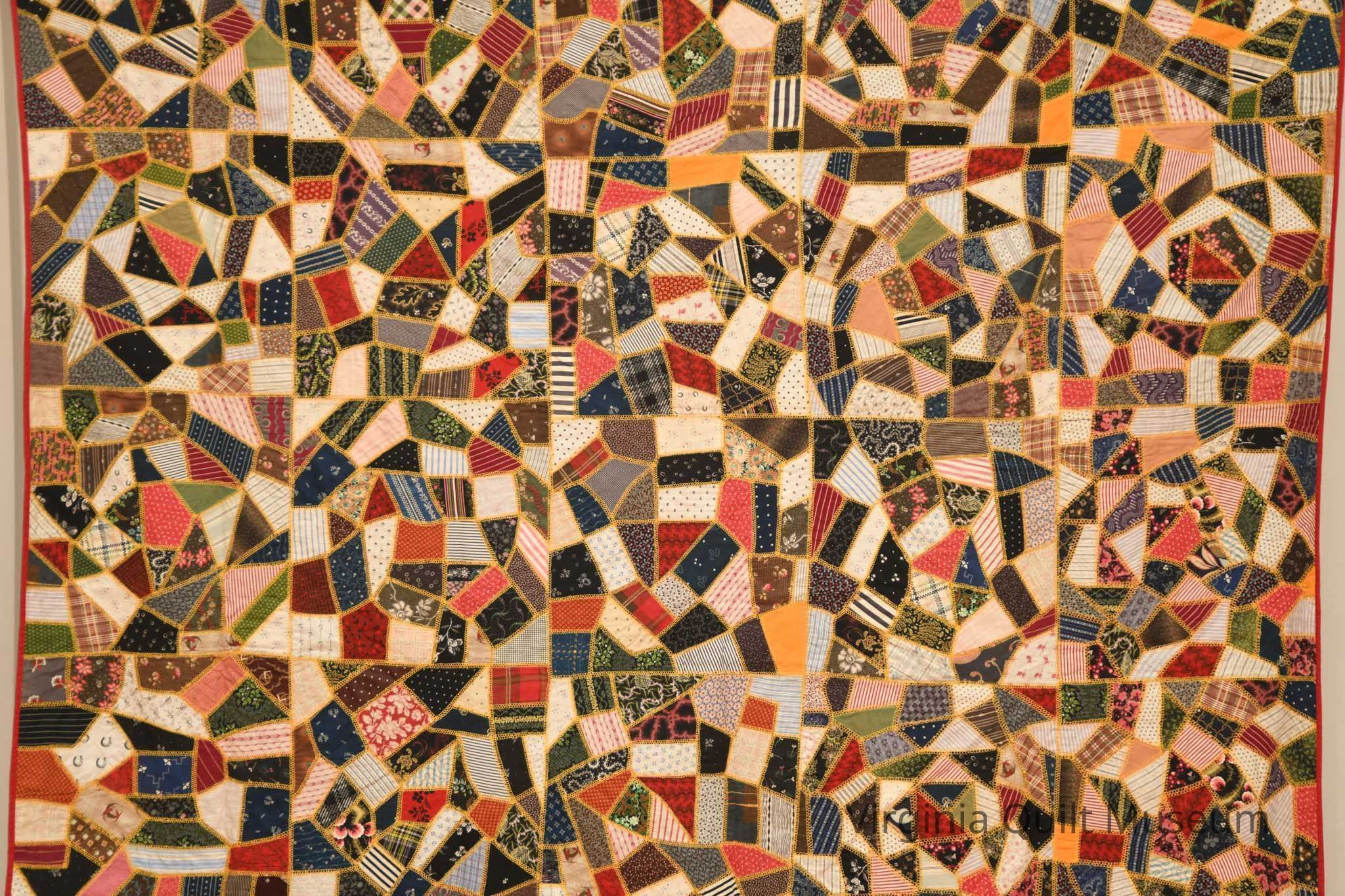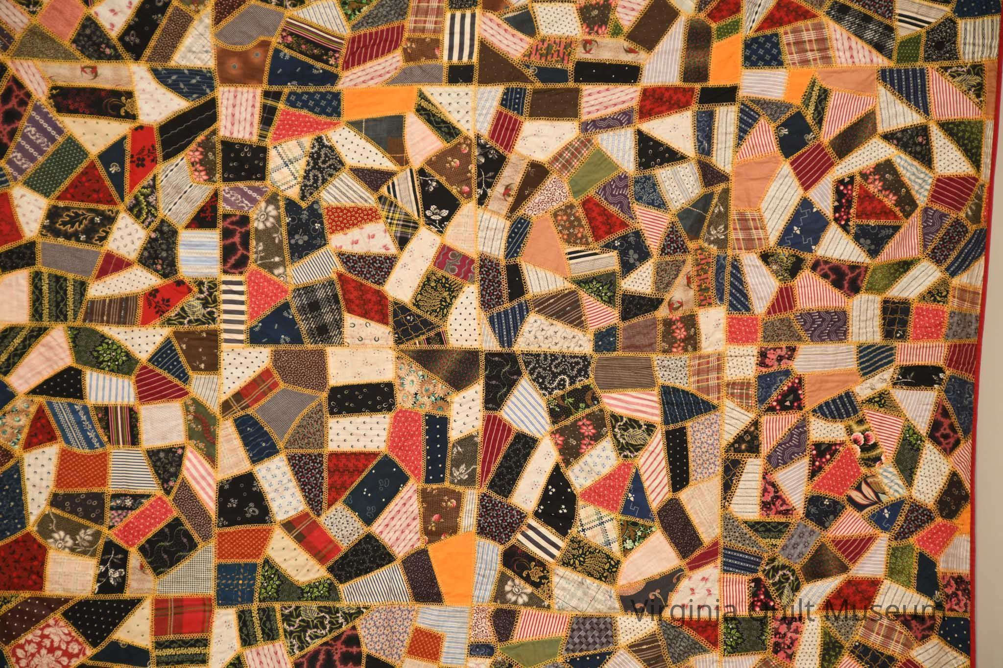 30 blocks (5 columns by 6 rows) set sides edge to edge. Random cuts of fabric set abstractly within blocks. Likely made from old/scrap fabric. Each piece is outlined in yellow embroidery. All the embroidery uses 1 strand of cotton thread or embroidery floss.