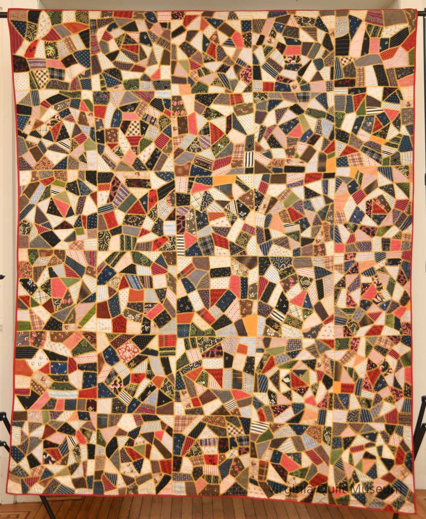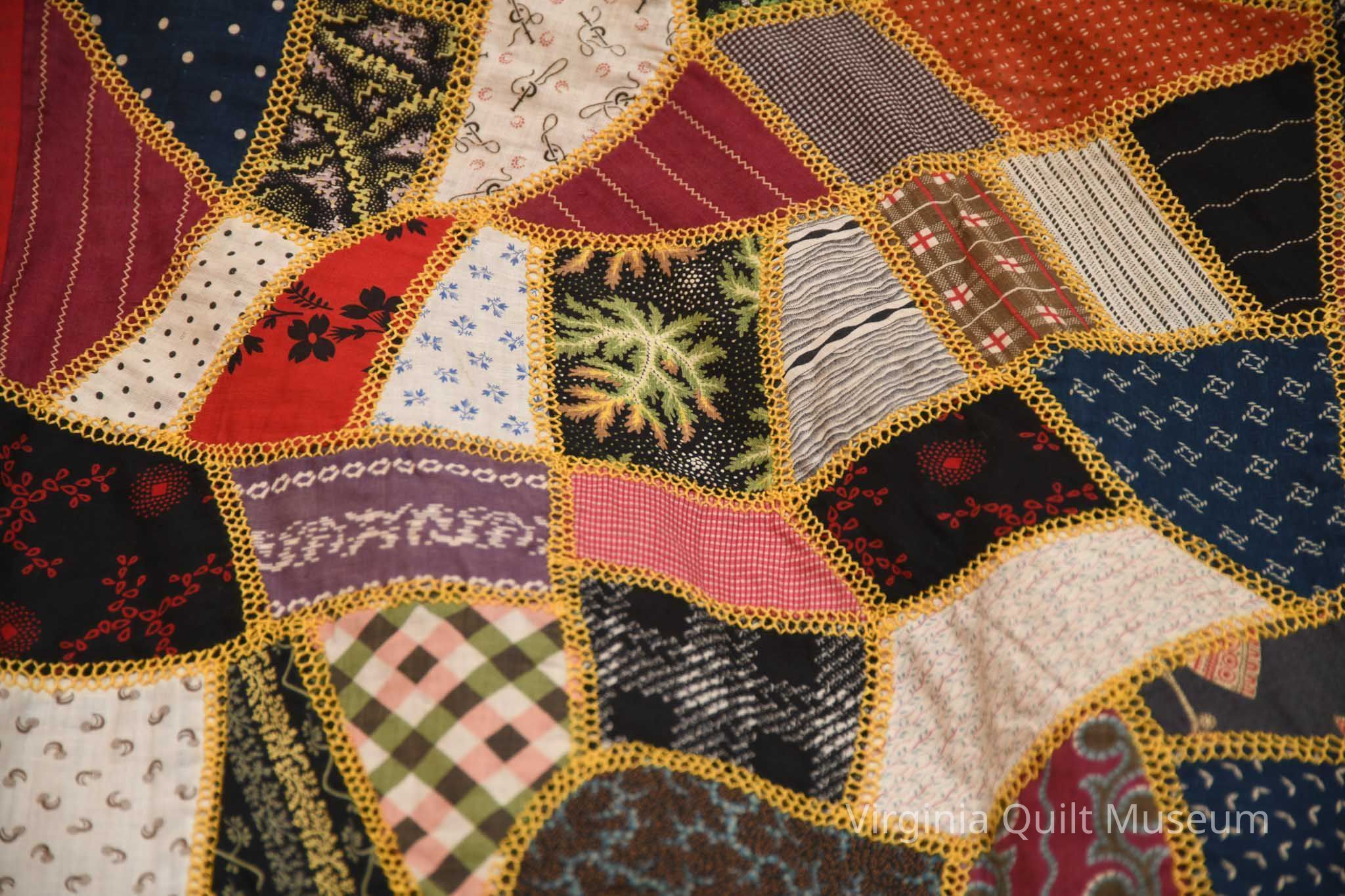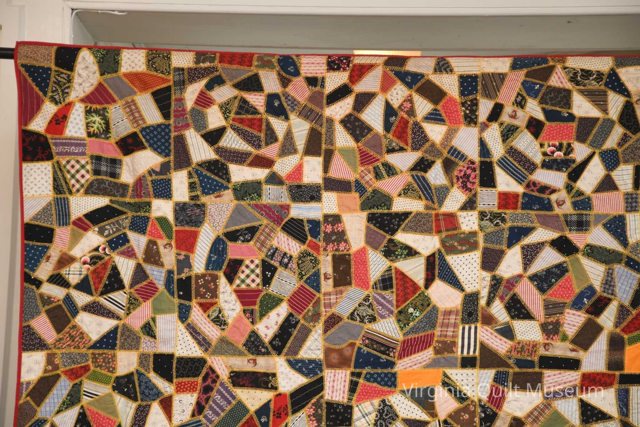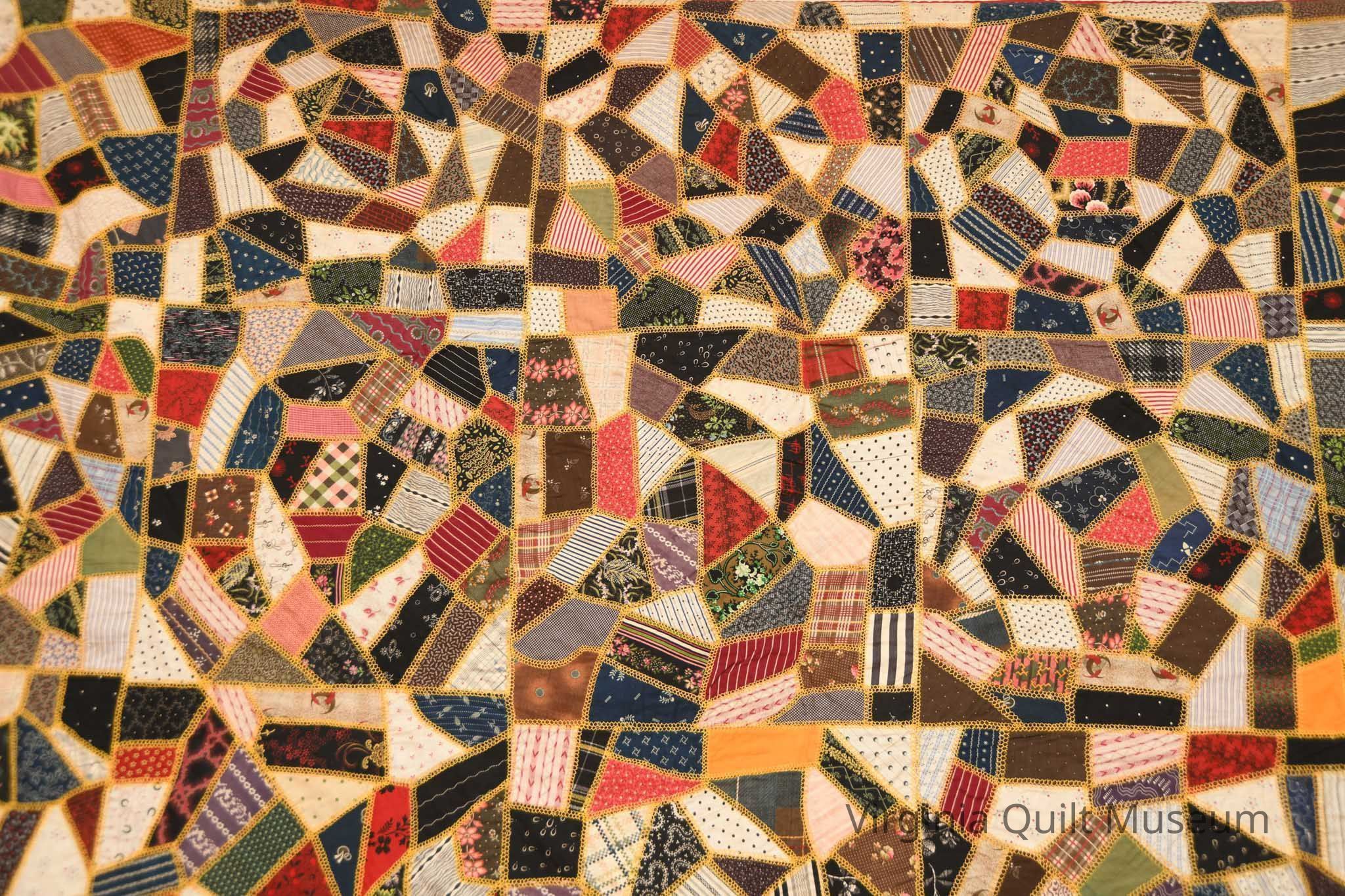 30 blocks (5 columns by 6 rows) set sides edge to edge. Random cuts of fabric set abstractly within blocks. Likely made from old/scrap fabric. Each piece is outlined in yellow embroidery. All the embroidery uses 1 strand of cotton thread or embroidery floss.
