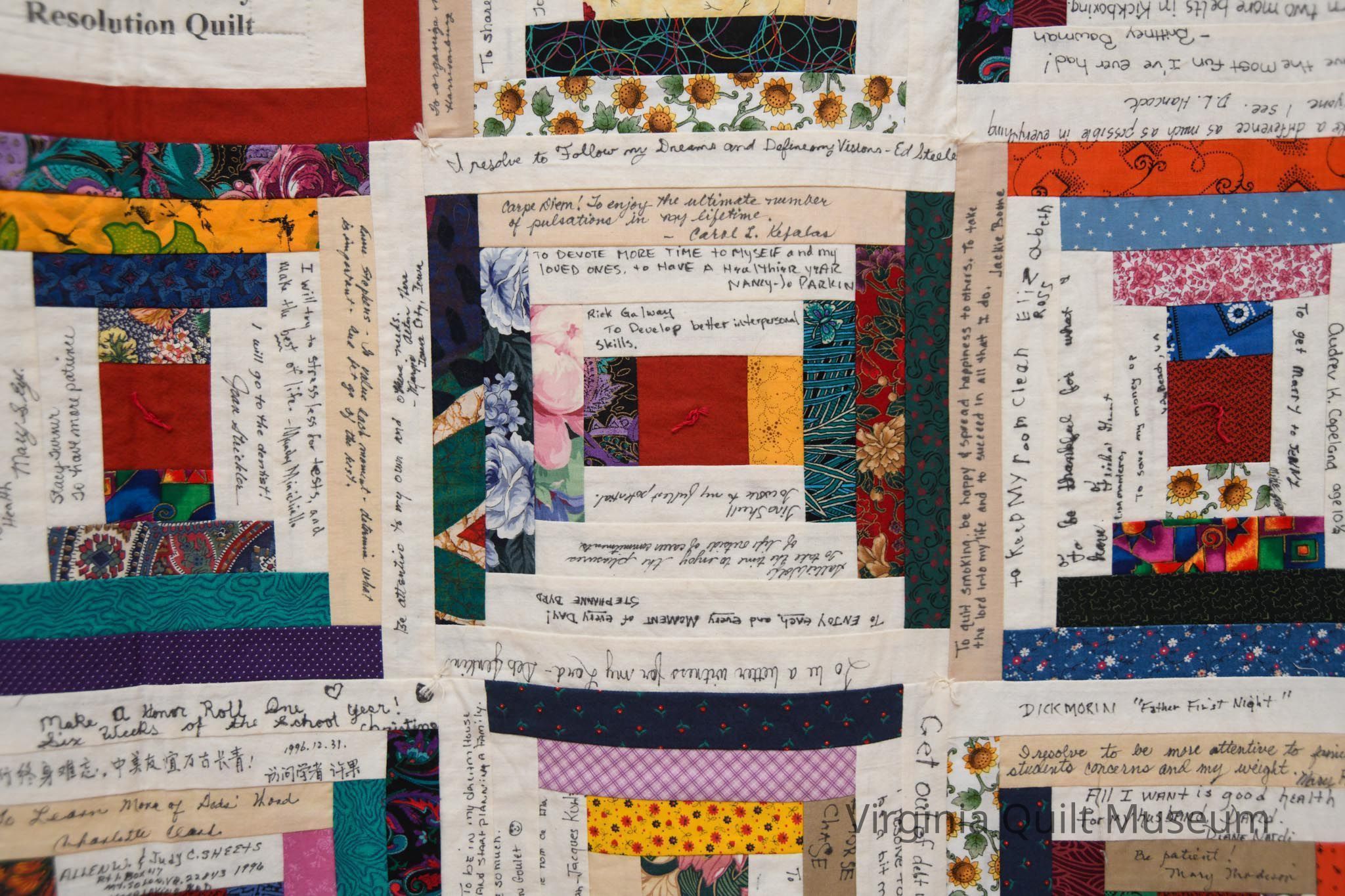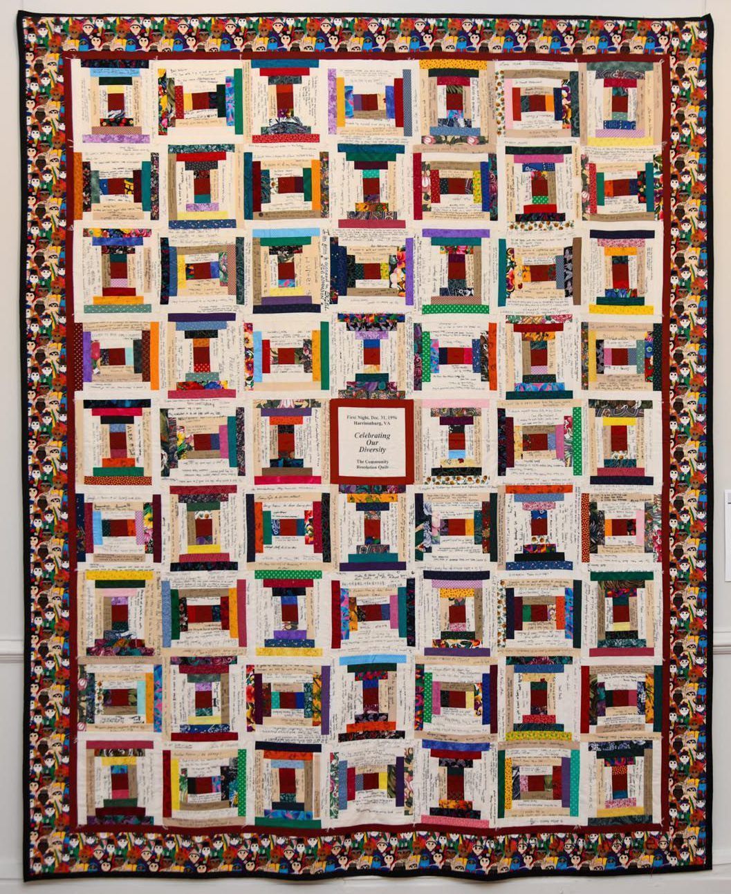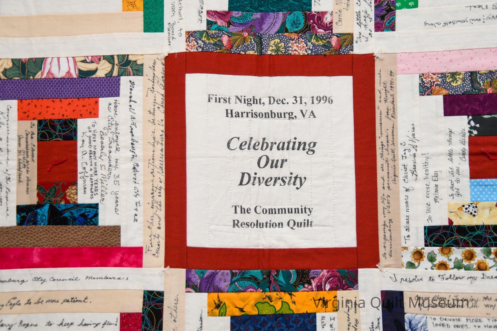 In 1996, people at the Harrisonburg First Night Celebration were invited to inscribe their name and New Years resolutions on the lighter strips of this quilt. The theme for the year was diversity in the community. The quilt was then assembled and tied during the following year. It was displayed on New Year's eve 1997, with many of the signers returning recalling if they had kept their resolutions.