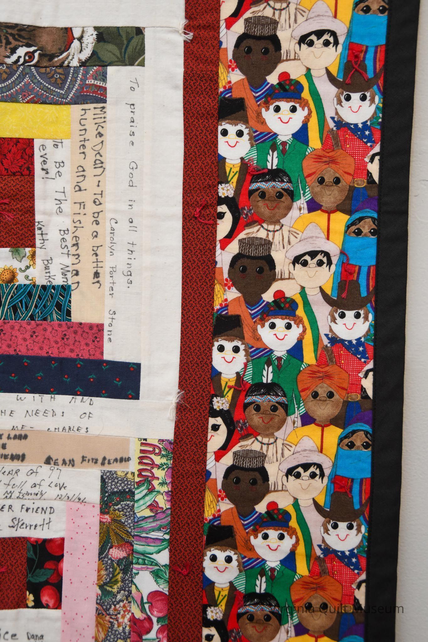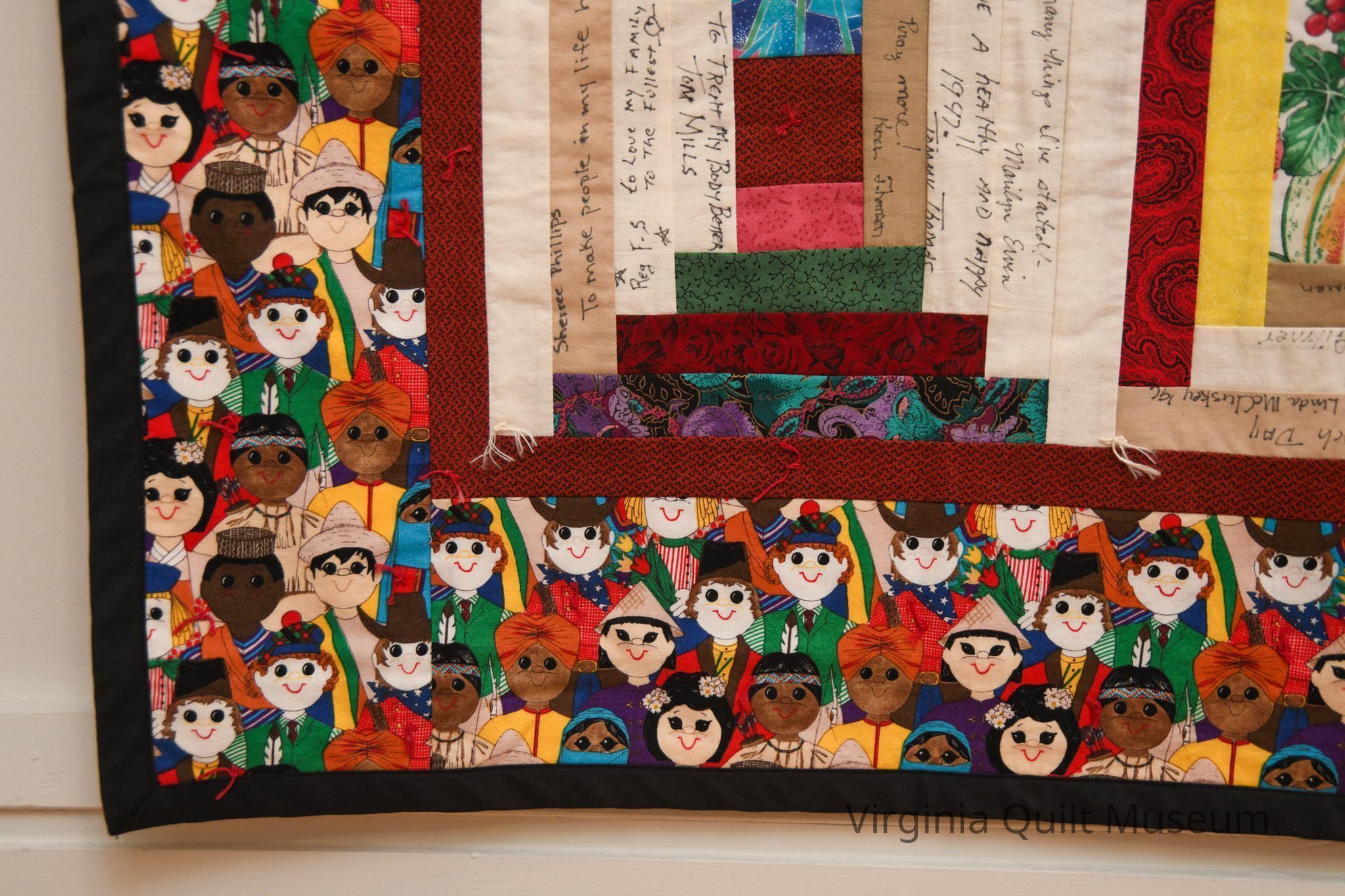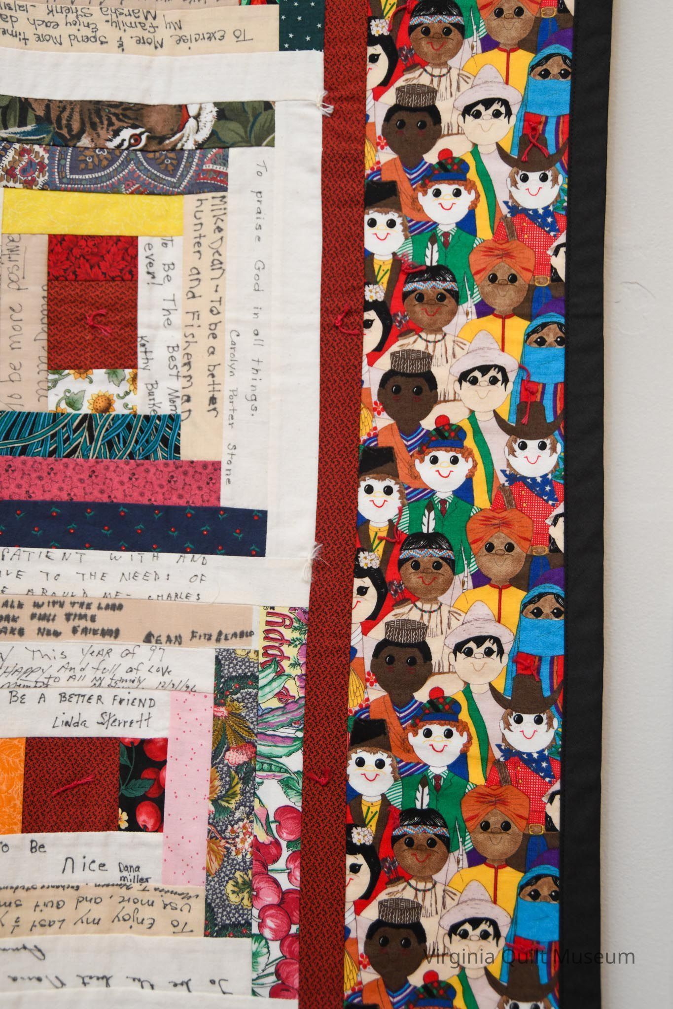 In 1996, people at the Harrisonburg First Night Celebration were invited to inscribe their name and New Years resolutions on the lighter strips of this quilt. The theme for the year was diversity in the community. The quilt was then assembled and tied during the following year. It was displayed on New Year's eve 1997, with many of the signers returning recalling if they had kept their resolutions.