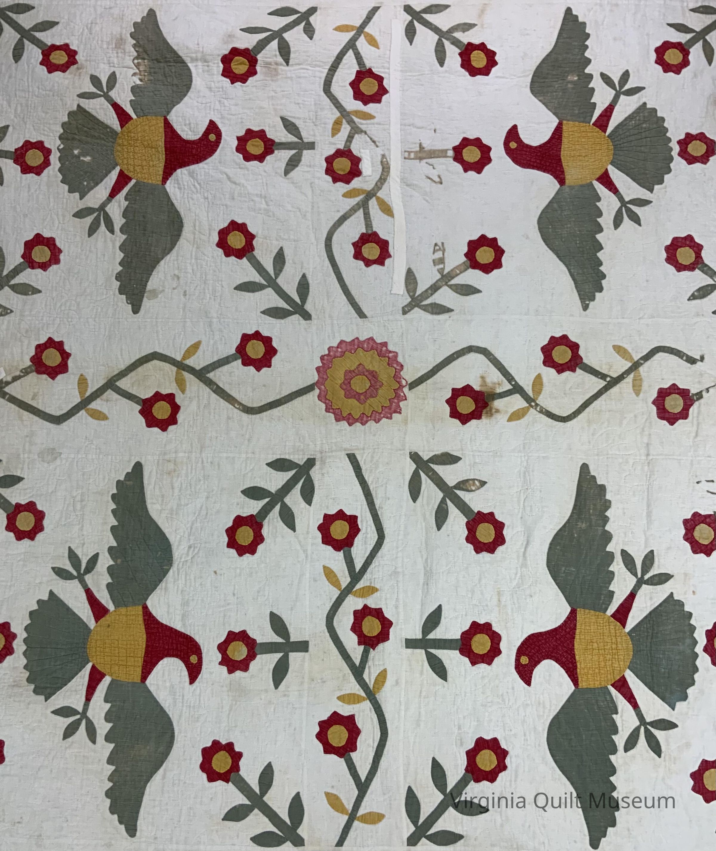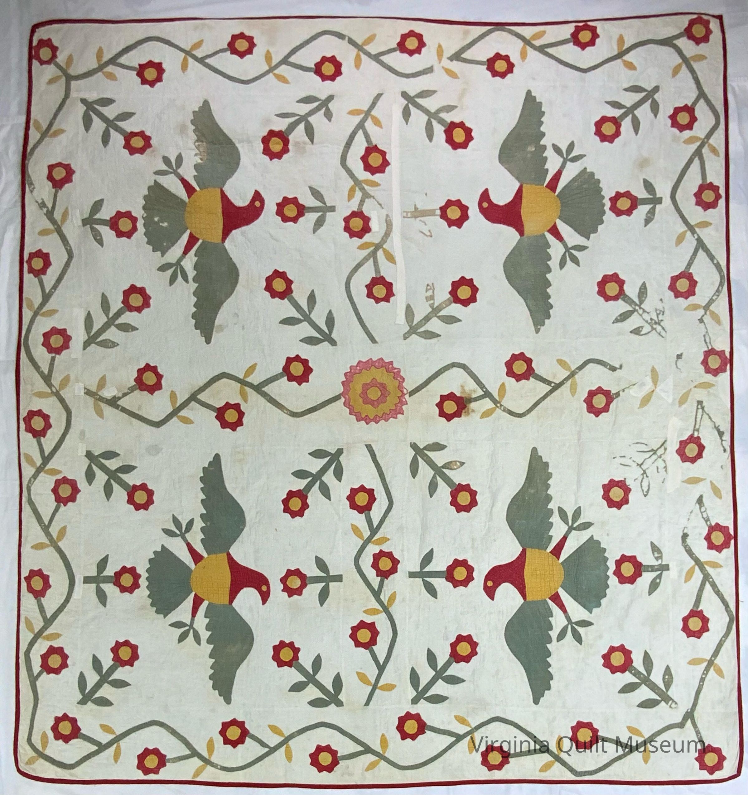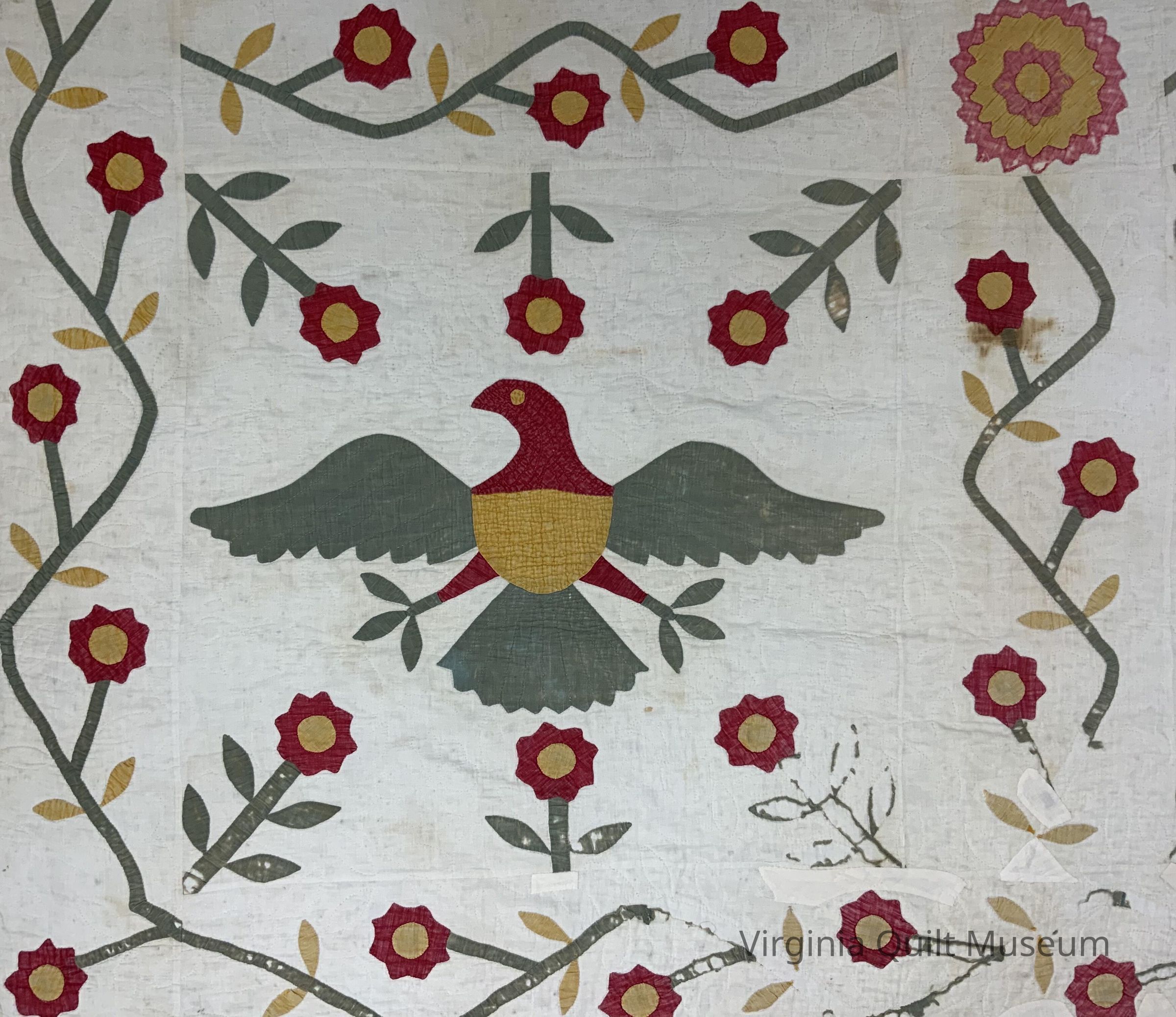 Hannah Kelley Guthrie made this quilt in the 1870's in Preston County, West Virginia. It was then passed on to her son Frank Guthrie, who passed it on to Helen Guthrie. After Helen, it was passed to Terry Guthrie Slaubaugh who donated it to the Virginia Quilt Museum in 2016. In each of the family units that interred it, it was mended or added to by the women of the family. The theme of four eagles spread-winged is commonly referred to as "Union Quilts" and were popular around the time of the Civil War.Collection