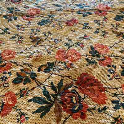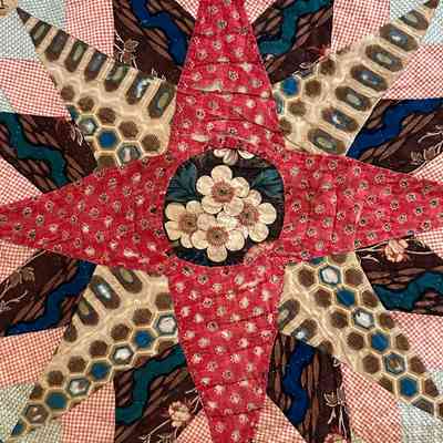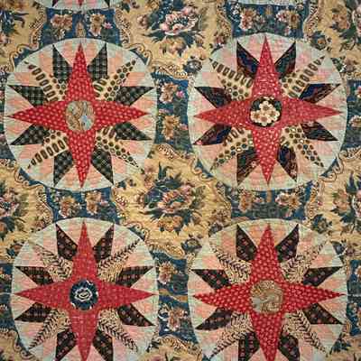 This quilt features 12 full Mariner's Compass blocks and 18 half/partial blocks. Each block features a turkey red print and fussy cut centers. There is sashing composed of a blue floral Chintz fabric, which is also included in the border. The entire back is Chintz fabric as well. The entire quilt is hand quilted with singular white cotton thread and arranged into circular lines/echo quilting design.