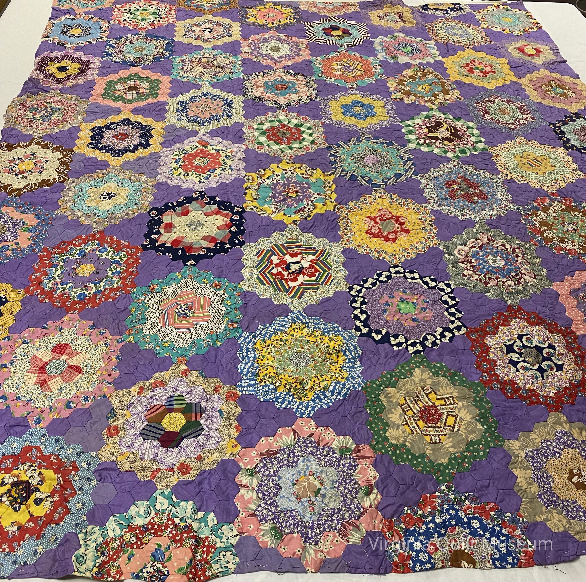 Flowers are made of hexagons with the center being a print followed by four rows of prints. Six plain-dyed purple hexagons form a triangle that separates each flower.  The top was pieced using black thread with the English method.