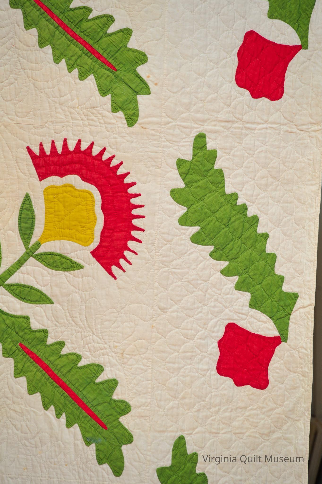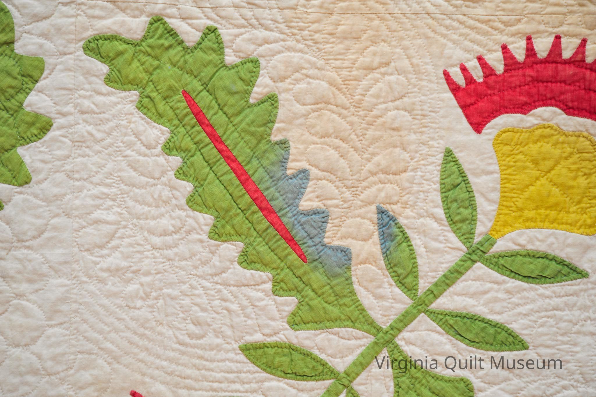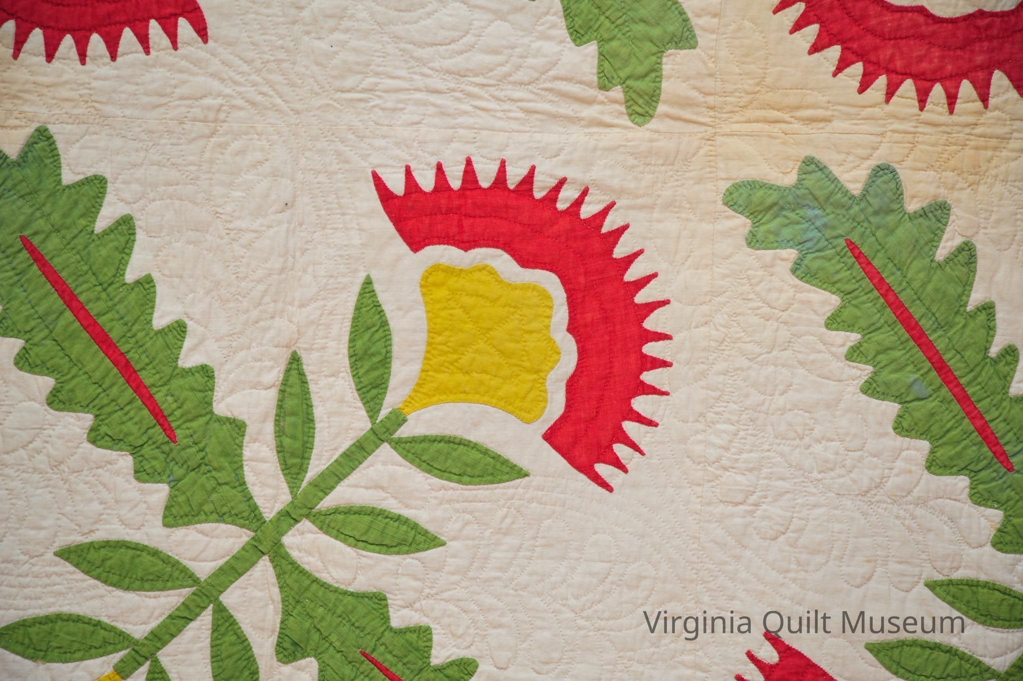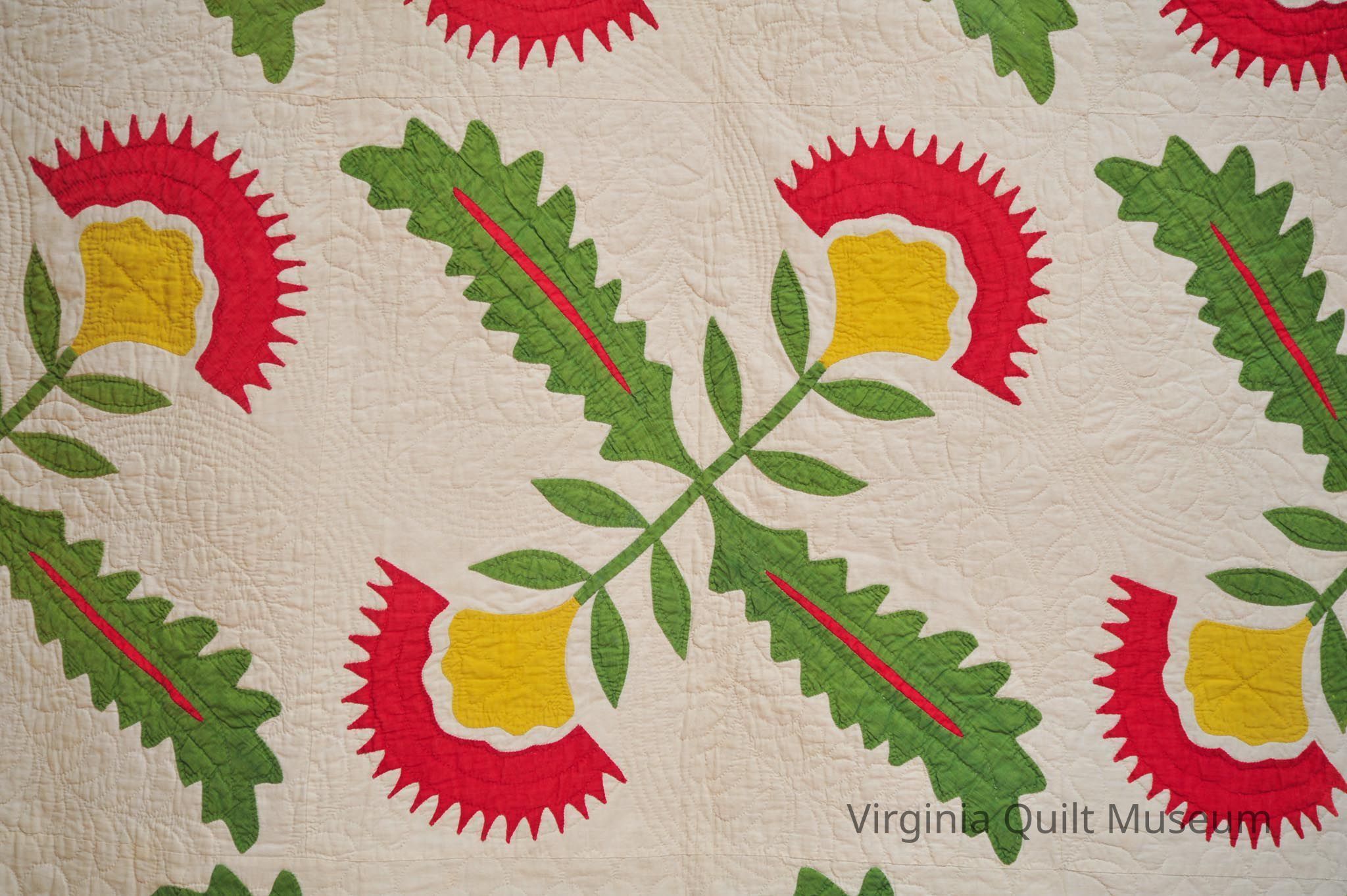 Binding is back over front. There are a total of 12 Cockscomb Variation blocks, which feature reverse applique in the leaves.