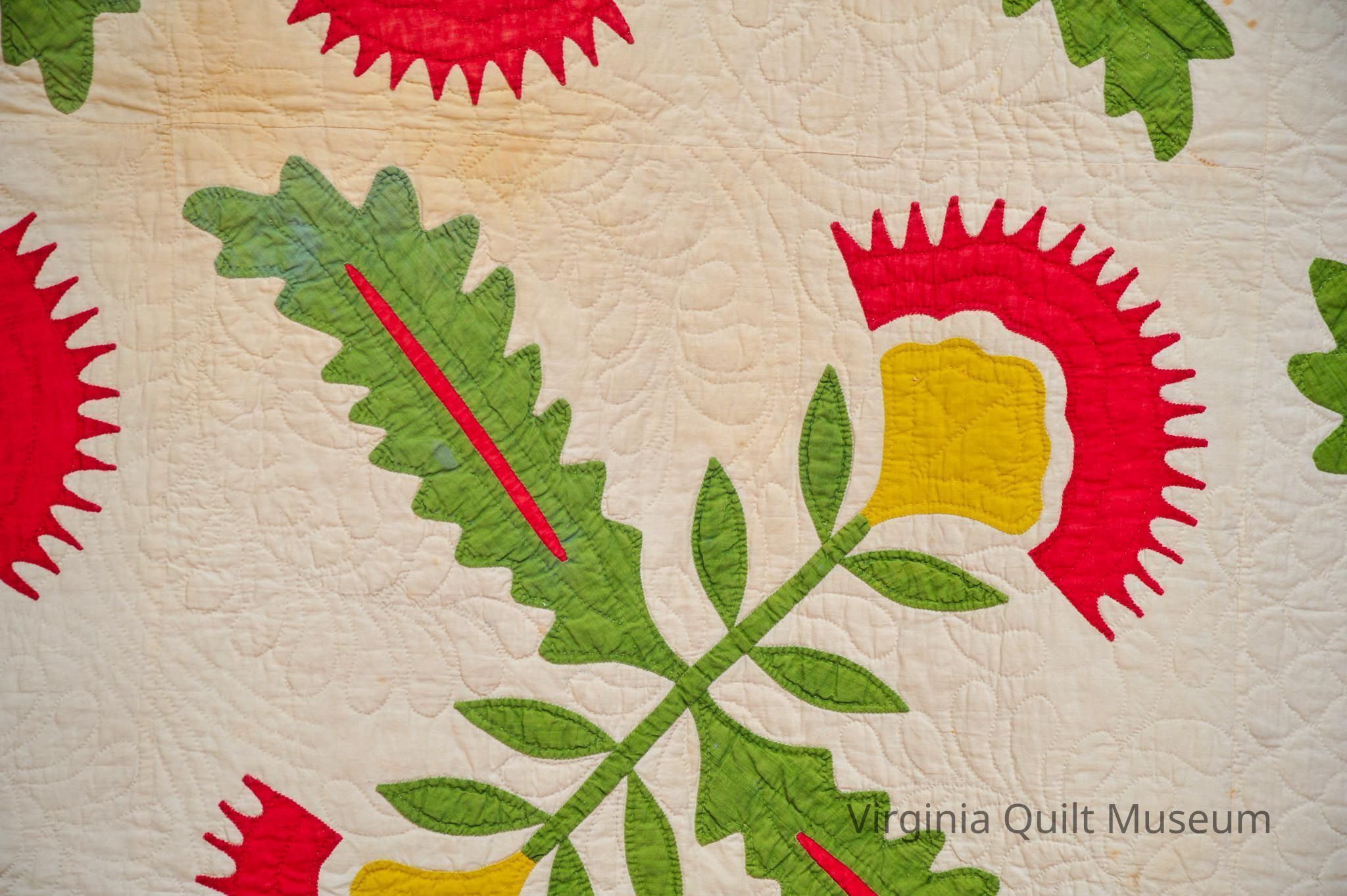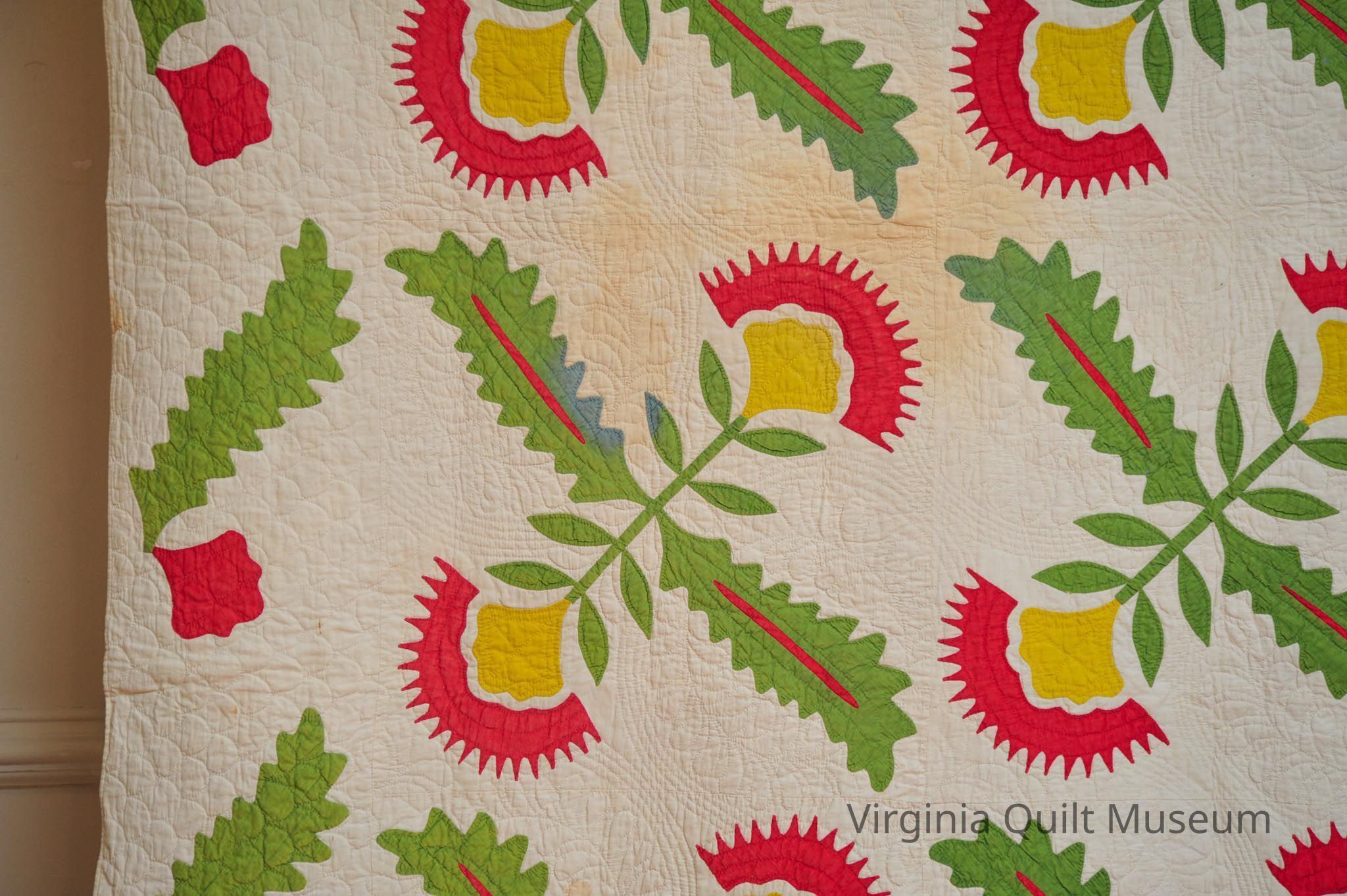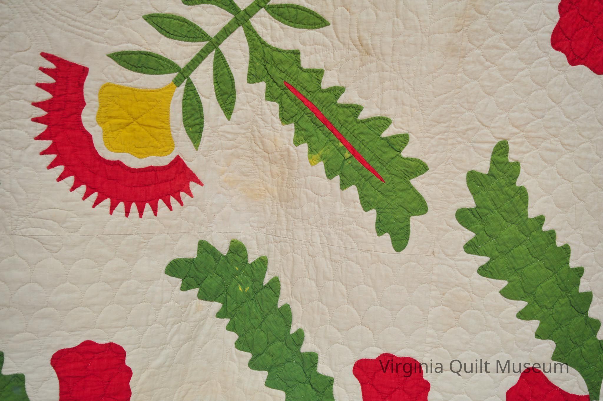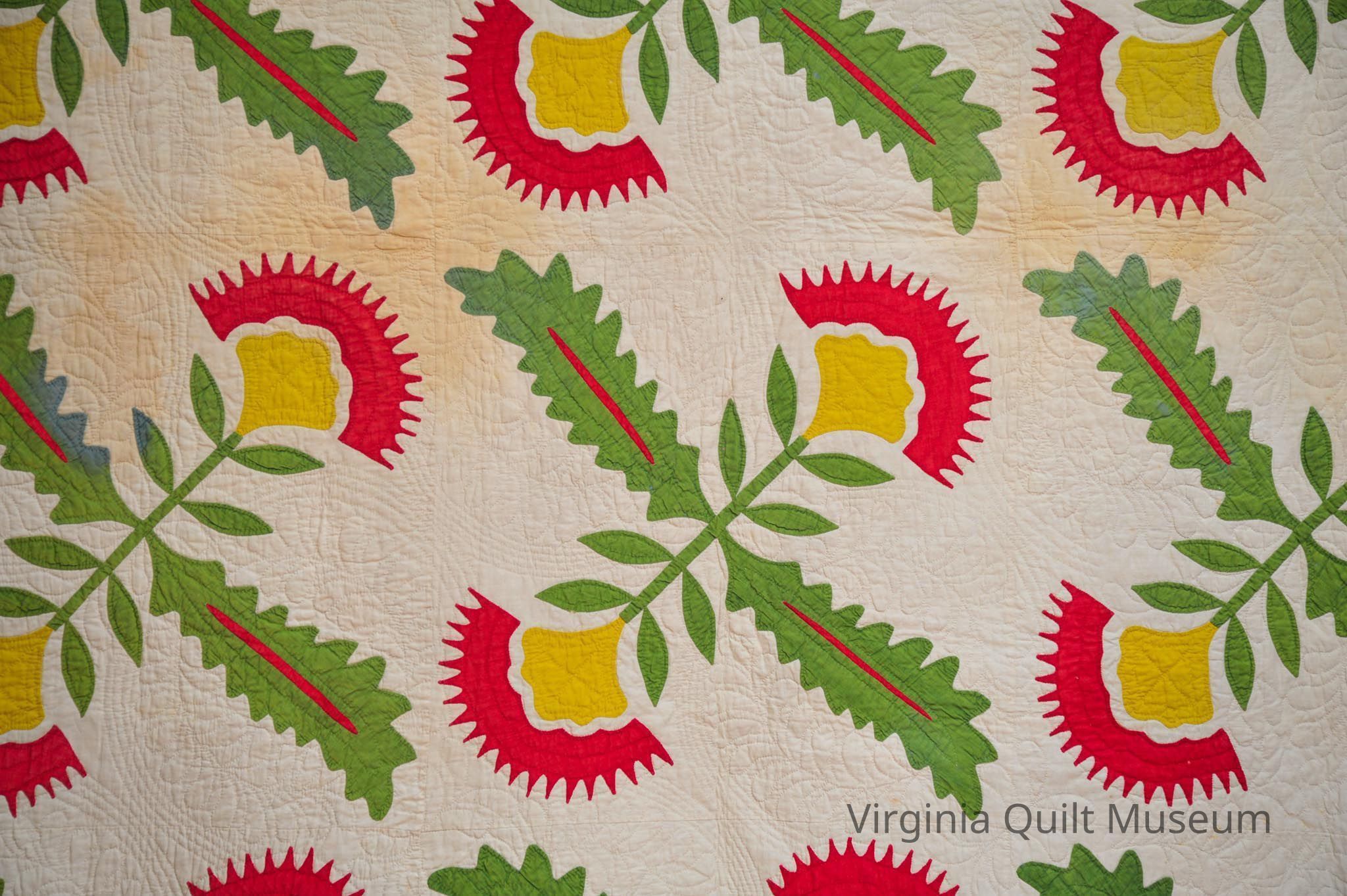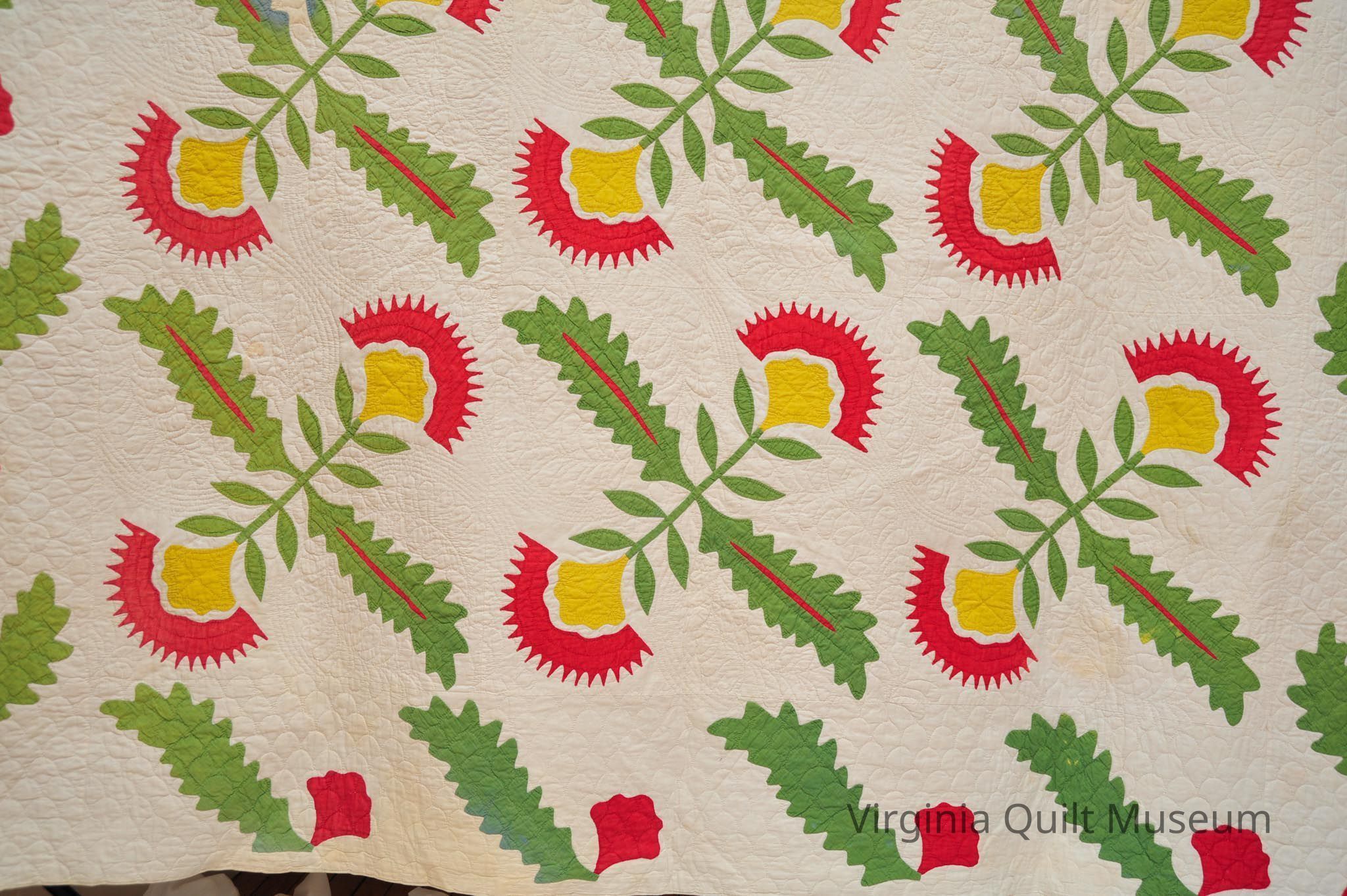 Binding is back over front. There are a total of 12 Cockscomb Variation blocks, which feature reverse applique in the leaves.