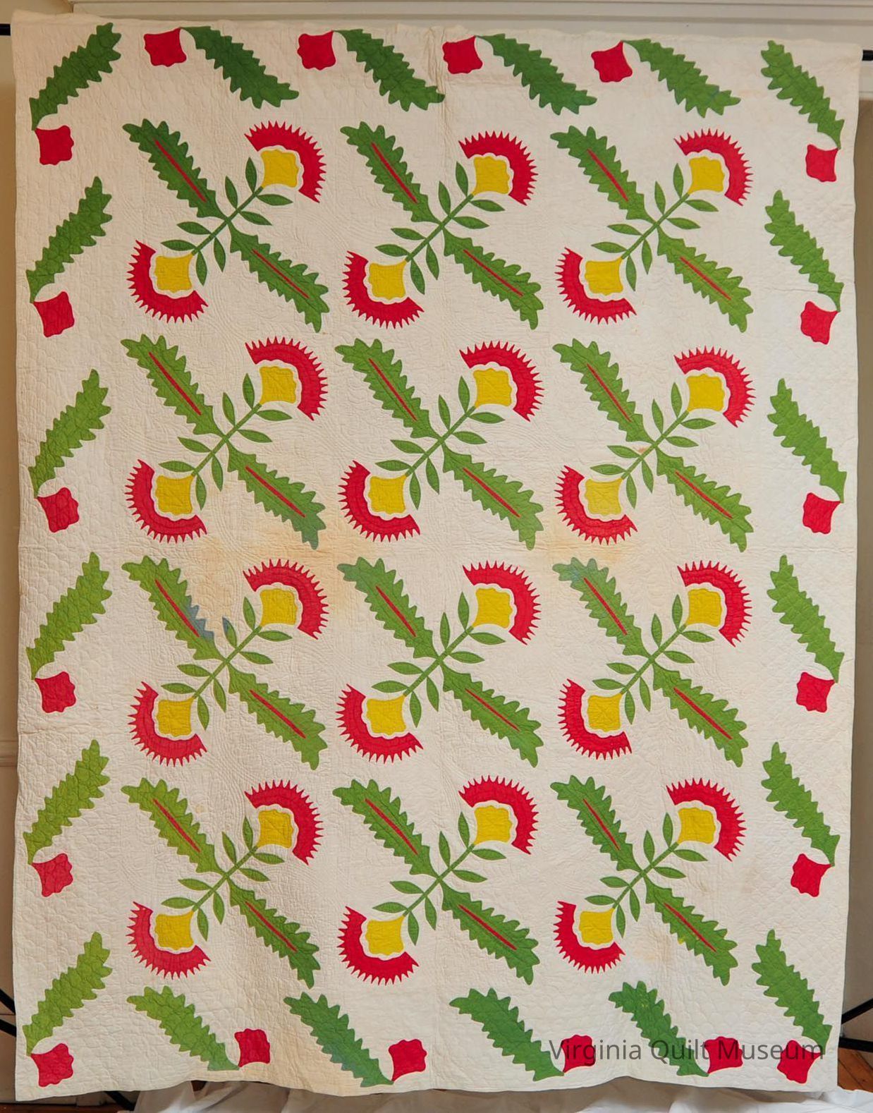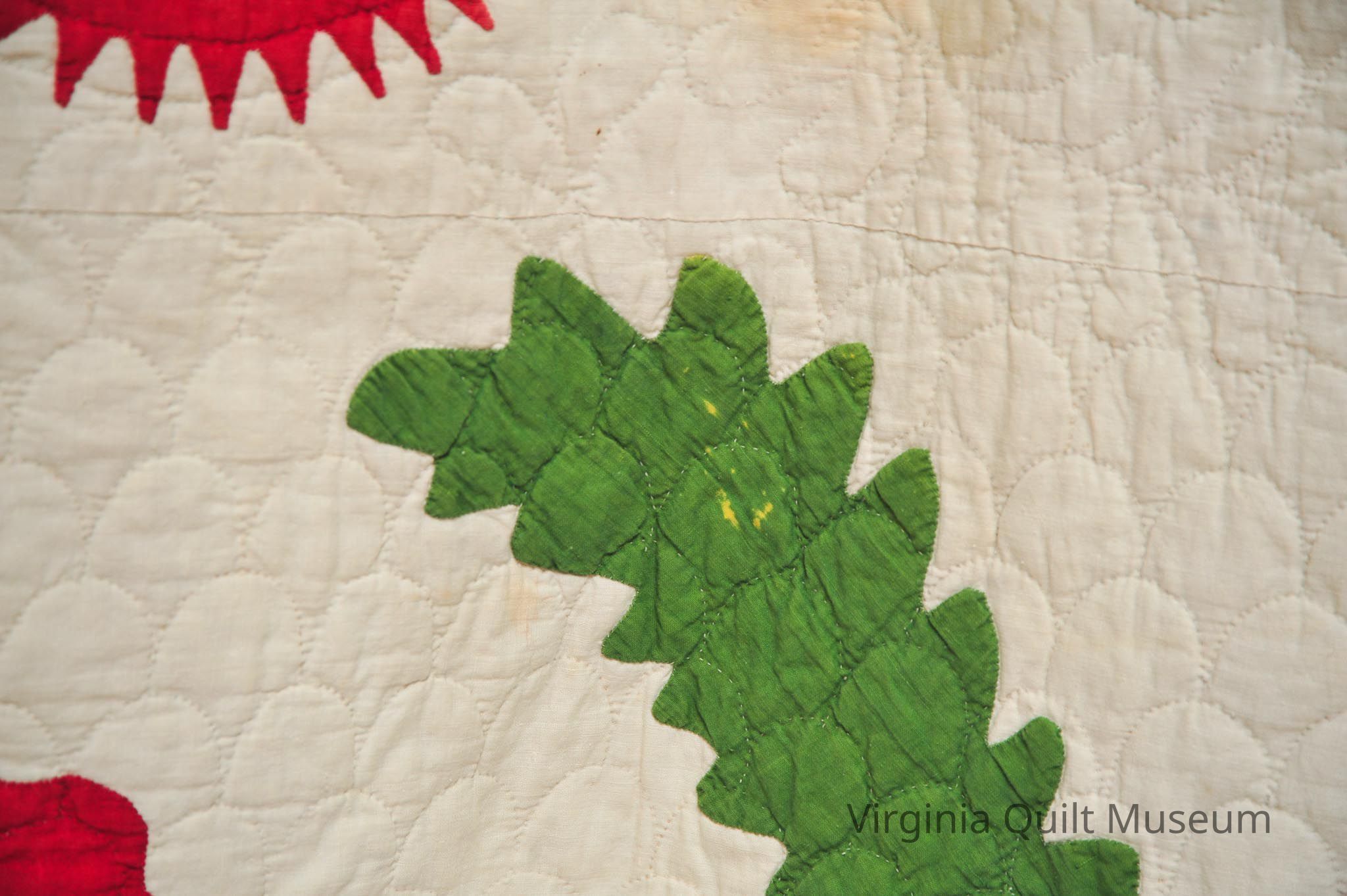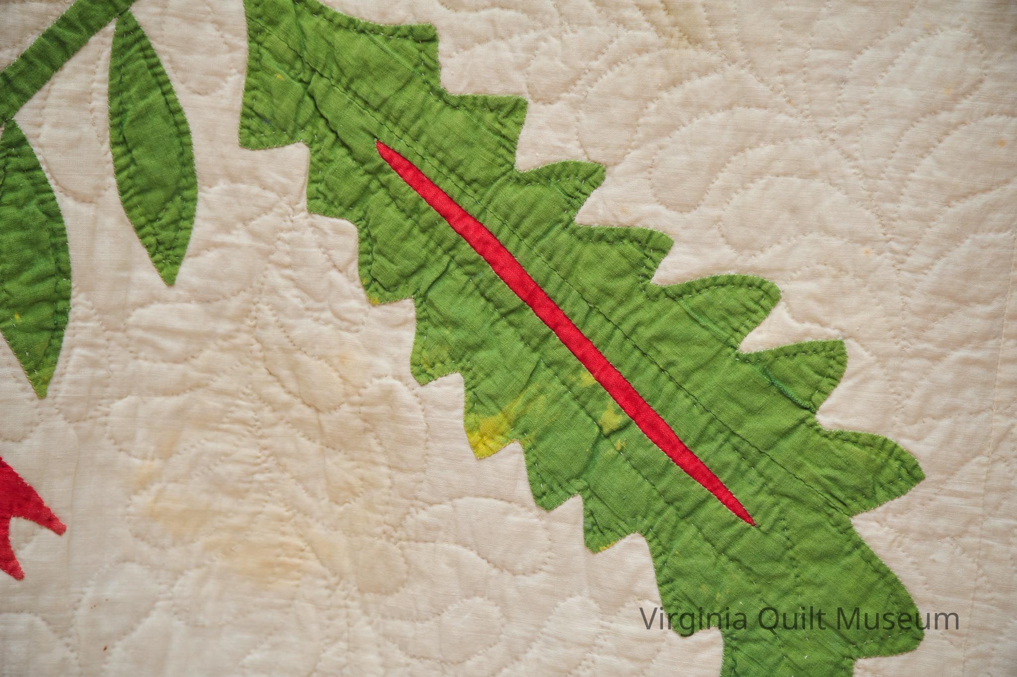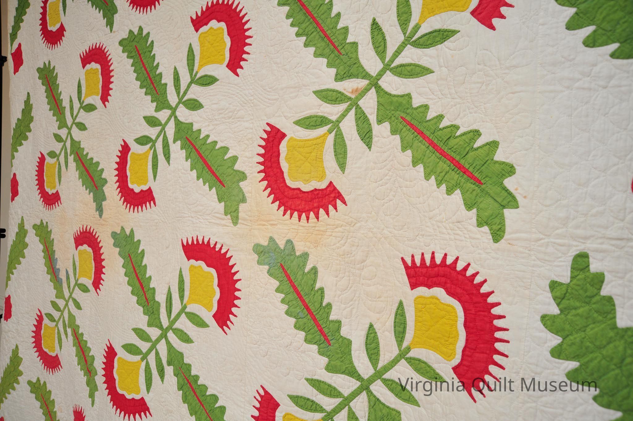 Binding is back over front. There are a total of 12 Cockscomb Variation blocks, which feature reverse applique in the leaves.