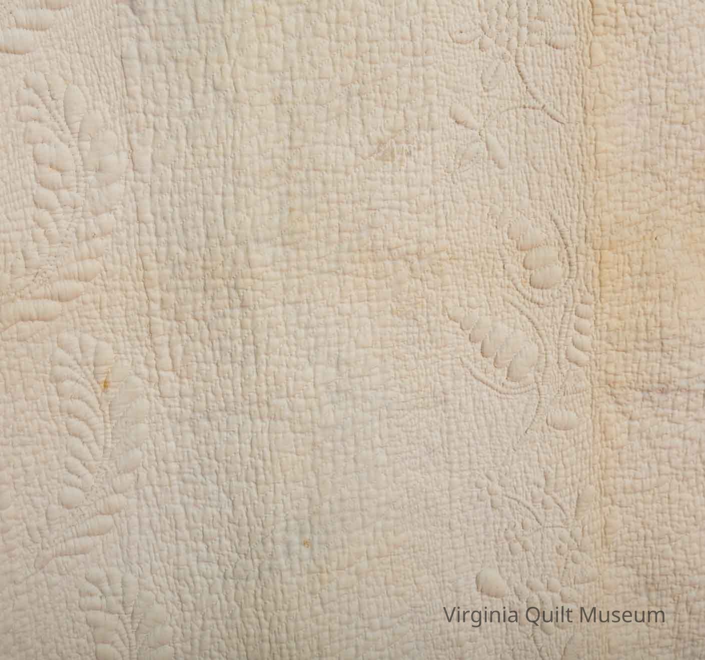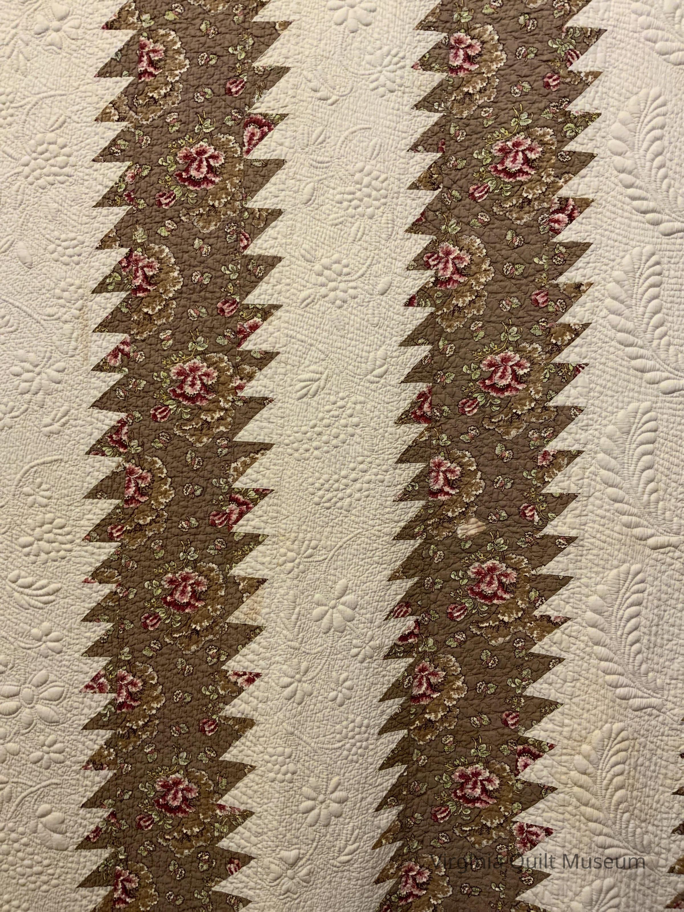 A single, pieced 2'' border of half square triangles surrounds the quilt. It is made up of the same fabric as the rest of the quilt. Extensive trapunto feather swags and floral motifs make up the white sashing. The rest of the quilt is hand quilted at 9 stitches per inch in straight diagonal lines (changes direction along the top).