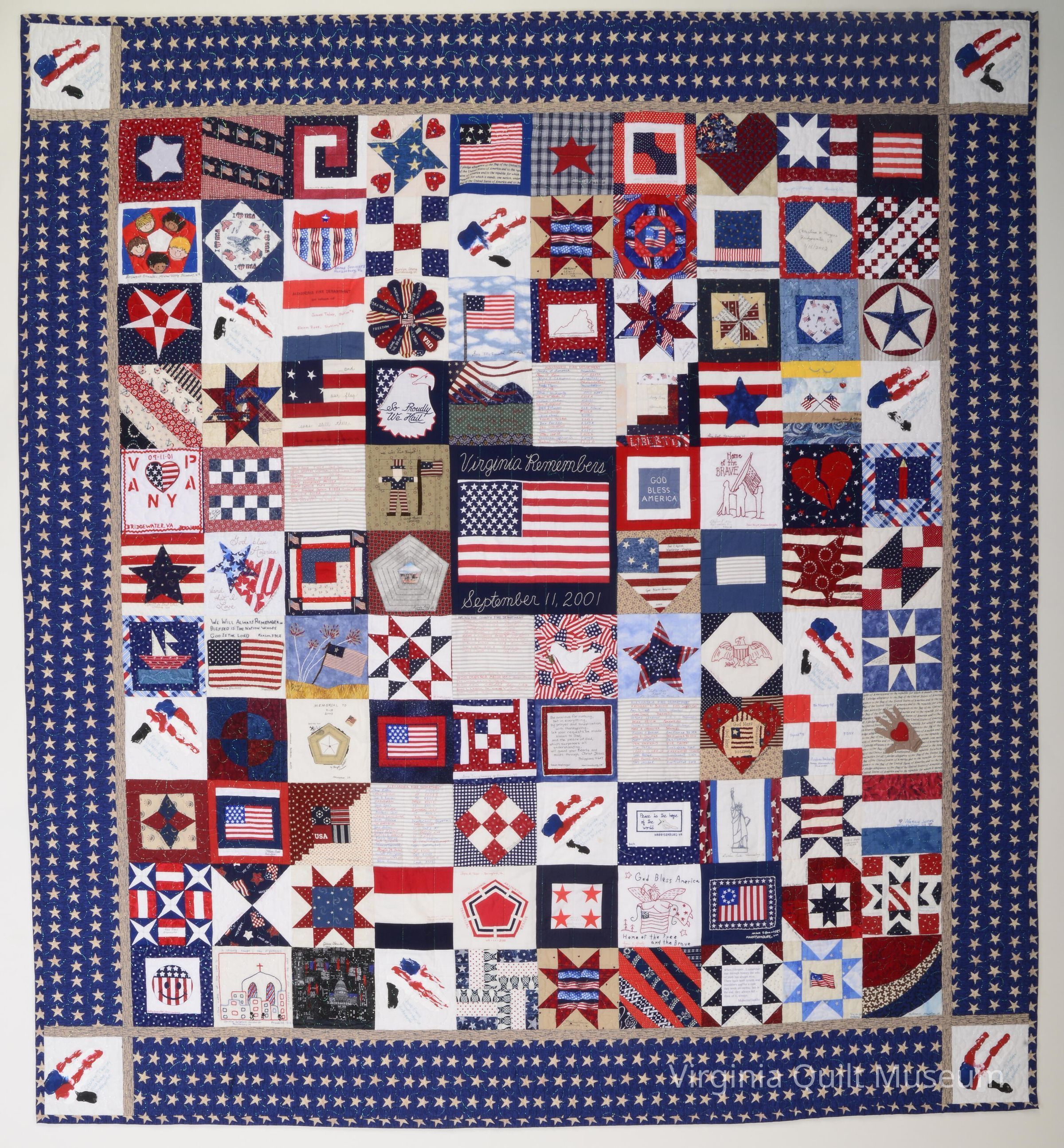 206 individual blocks of red, white, and blue fabrics. Patriotic theme and motifs with 6 inch star print fabric all around. Hand prints in paint on each corner. Machine quilted with hand embroidery, painting, cross-stitch, and photo transfer.Context