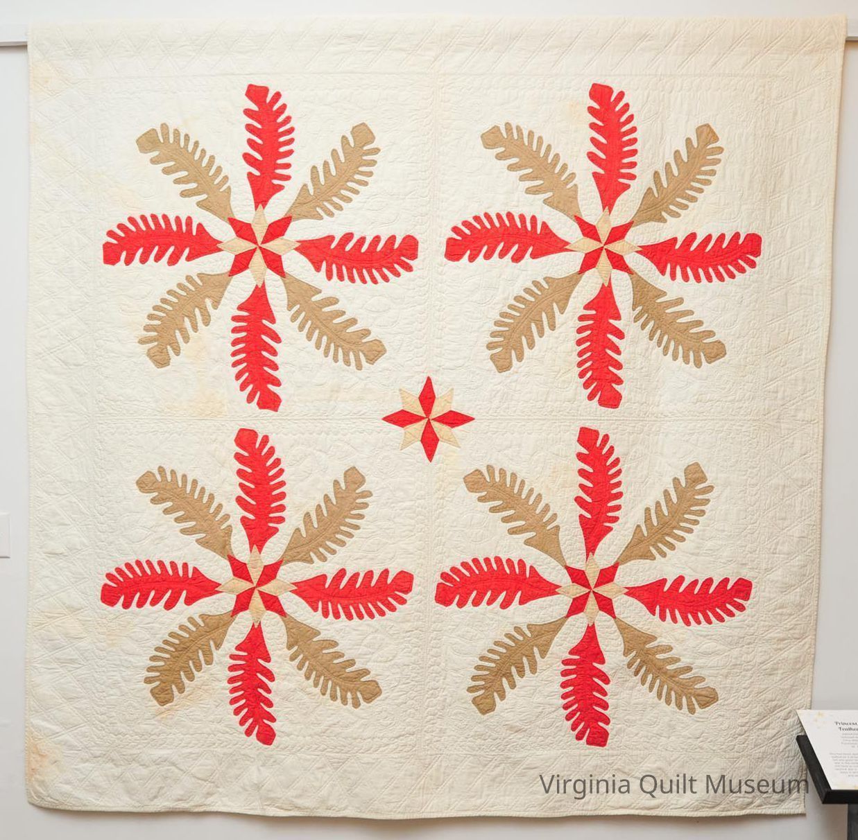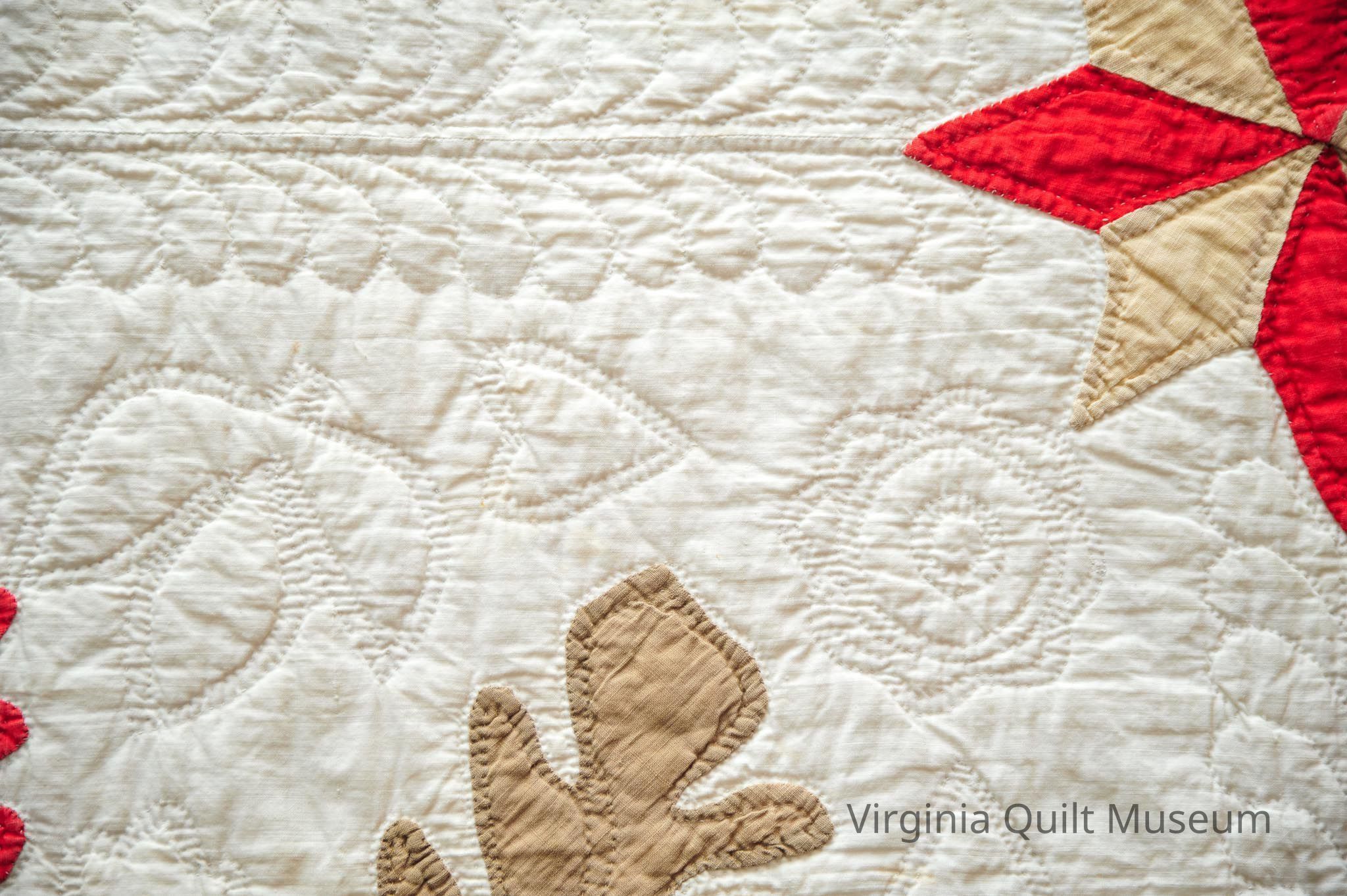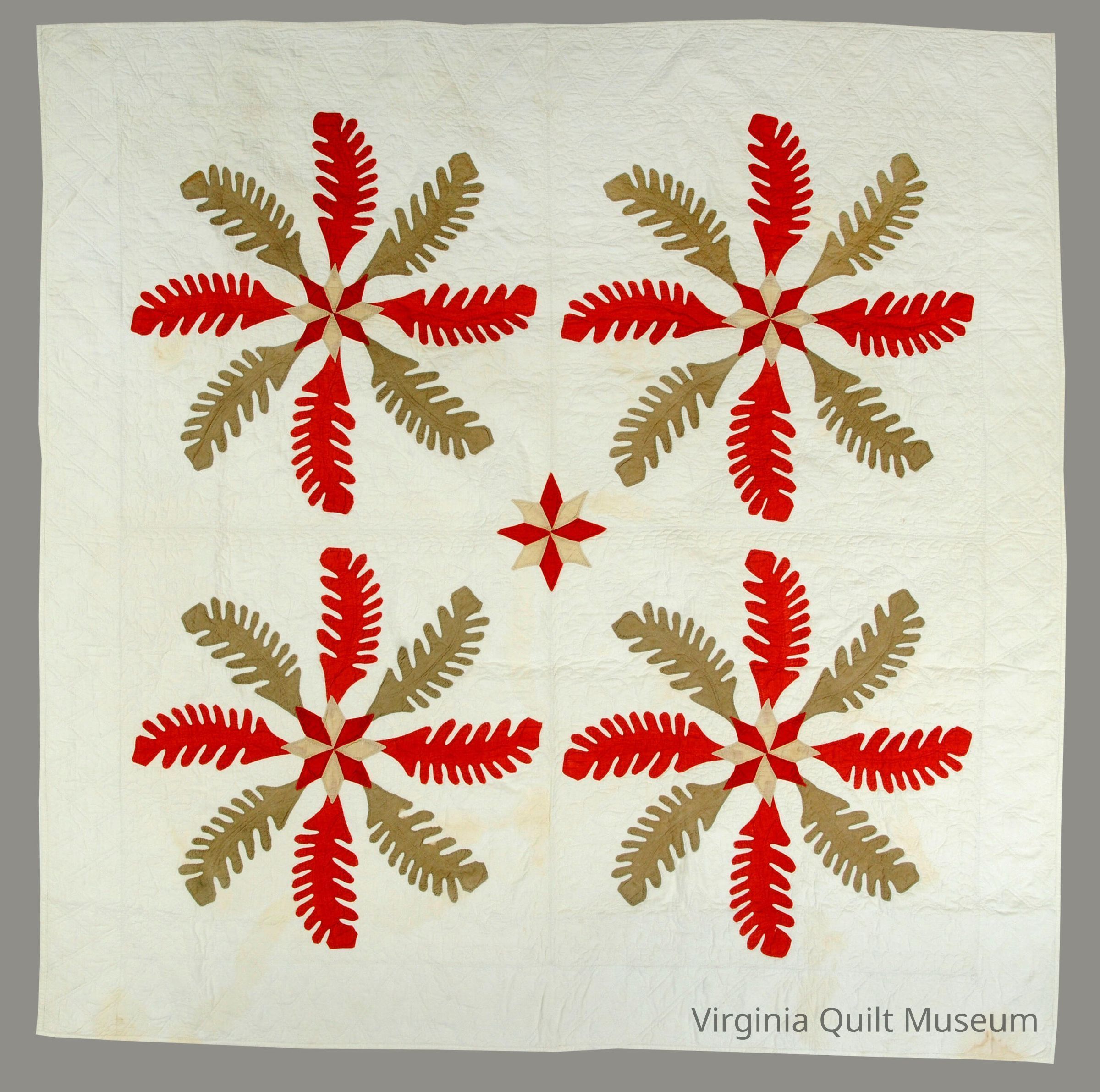 Four block appliqué on extensively quilted white field. Red and green alternating feather motif arranged with nautical star or compass in center. Nautical star repeated in center of quilt. The four blocks form a grid pattern, where the blocks mirror each other. A single white border (6 1/2-3/4'' wide) surrounds the Princess Feather blocks. A white binding (1/2'' wide) with squared corners was applied by machine. It was likely added later and appears to possibly be bias tape.