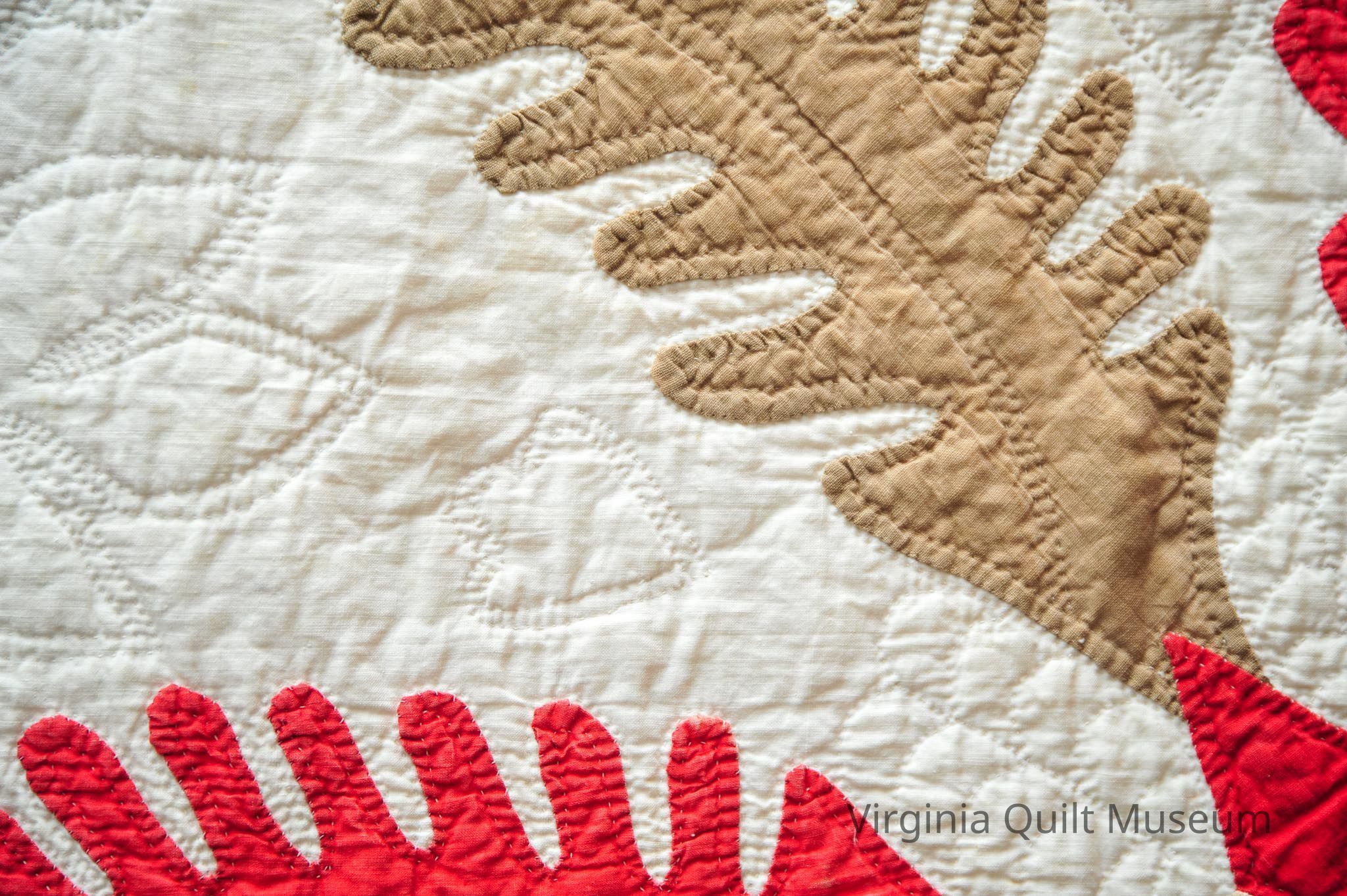 The entire quilt is hand quilted with white thread. The quilting within each block contains multiple motifs, such as flowers, hearts, and leaves. The quilting in the border contains double lines, which create diamonds set on diagonal. There are also feather plumes that frame each block.