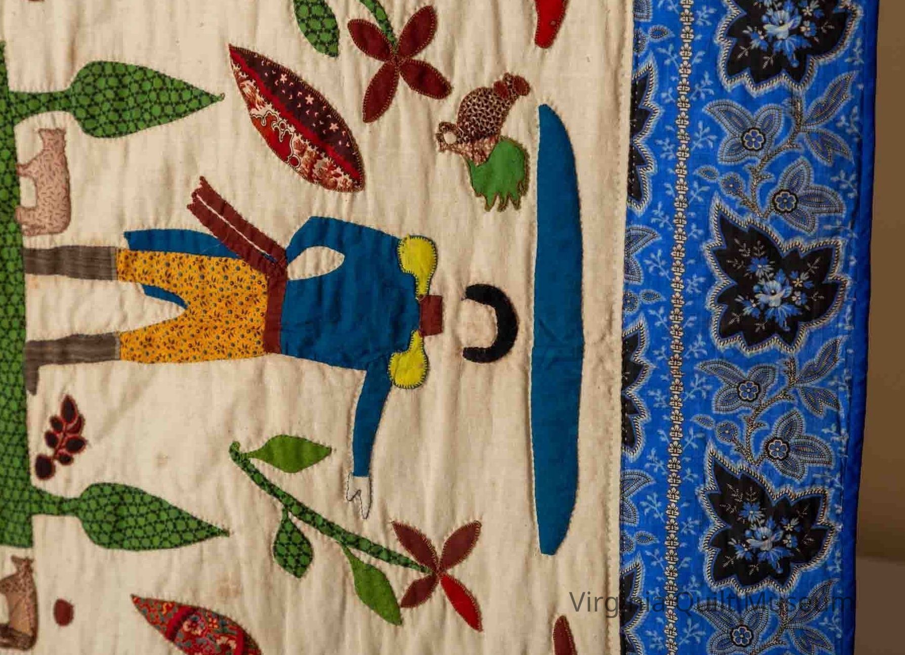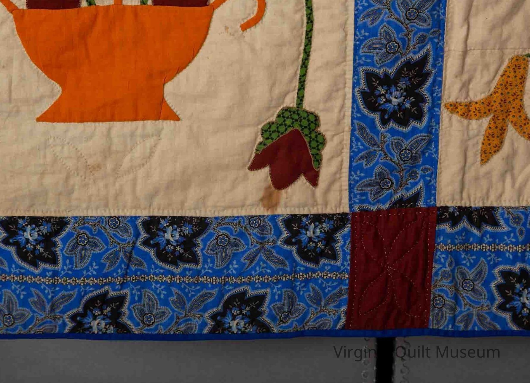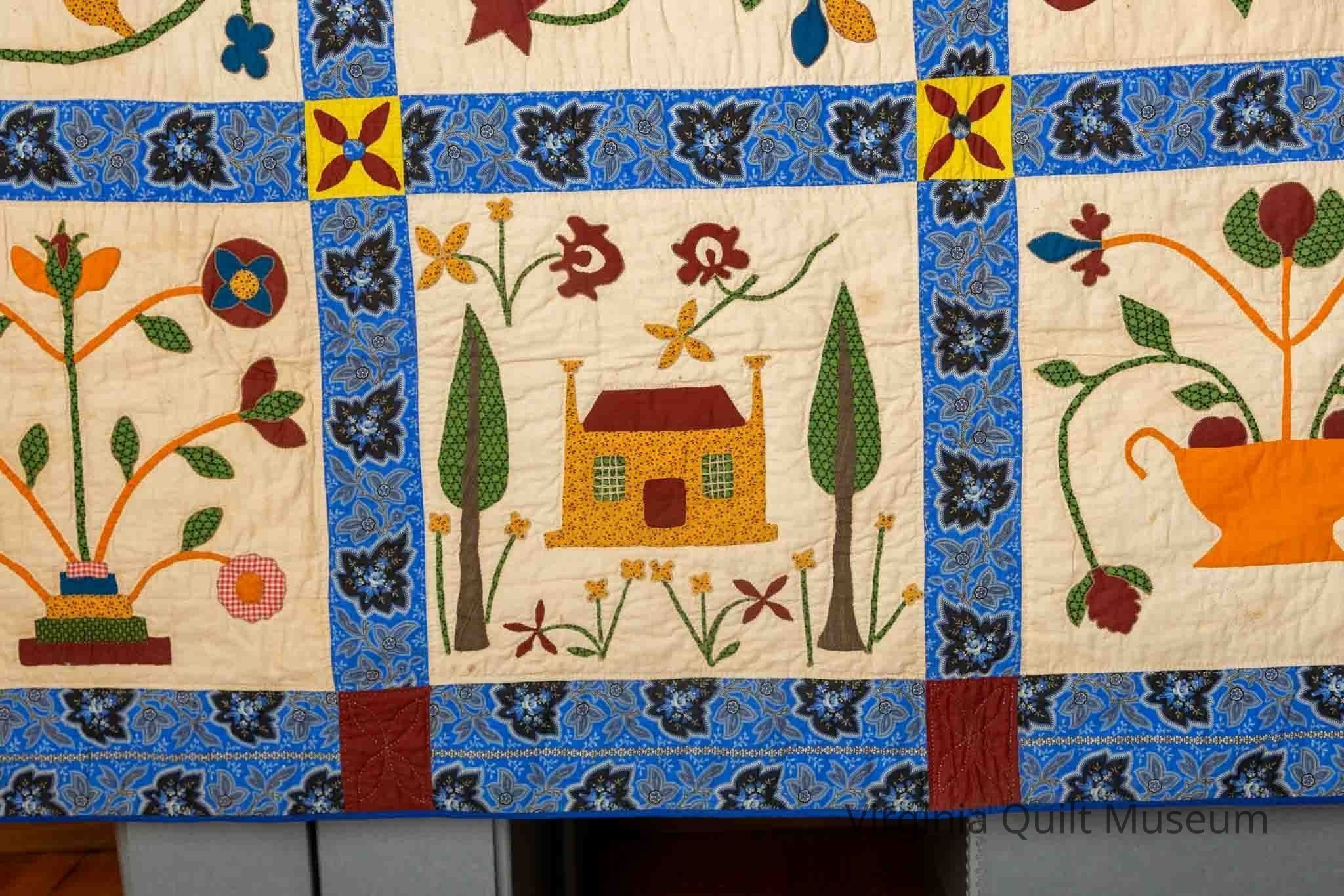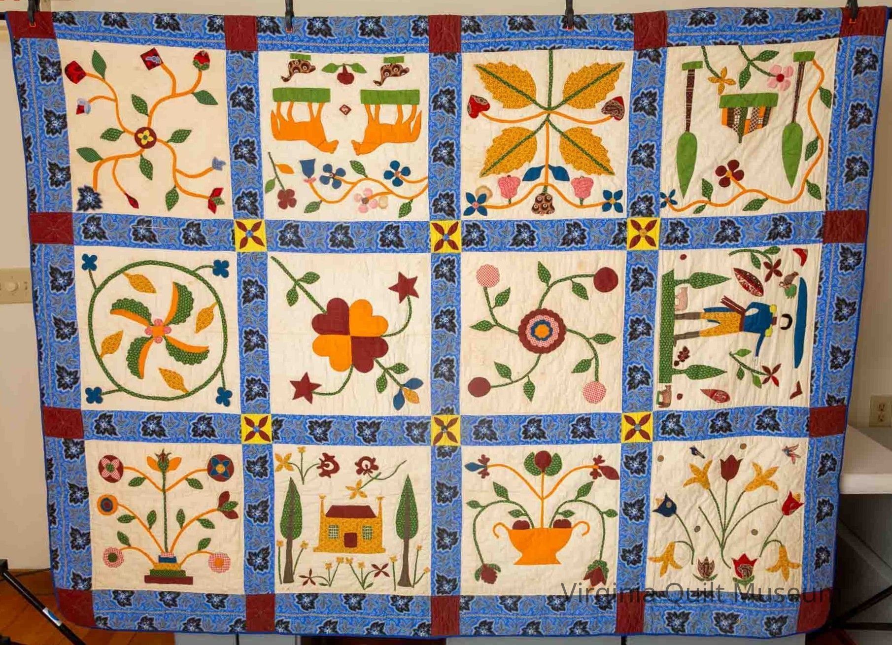 Twelve album blocks are set side by side into a 4x3 configuration with a 4 1/4'' sashing and yellow cornerstones with a red and blue floral design. There are 12 unique blocks that include a house, a man, various animals and floral motifs. These blocks feature traditional applique and hand embroidery with buttonhole stitches. The border and sashing is composed of a blue paisley printed fabric (possibly 1920s) and dark red cornerstones. The binding is a 1/4'' wide, royal blue, applied binding with straight edges and rounded corners.