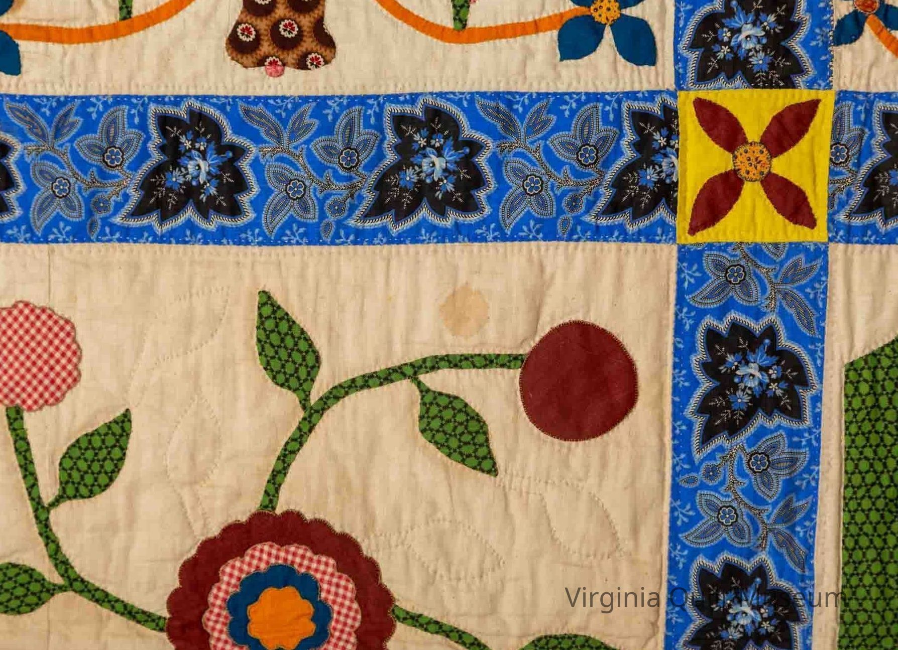 Some staining and age throughout. Replacement of fabric on flower applique.Overall Condition