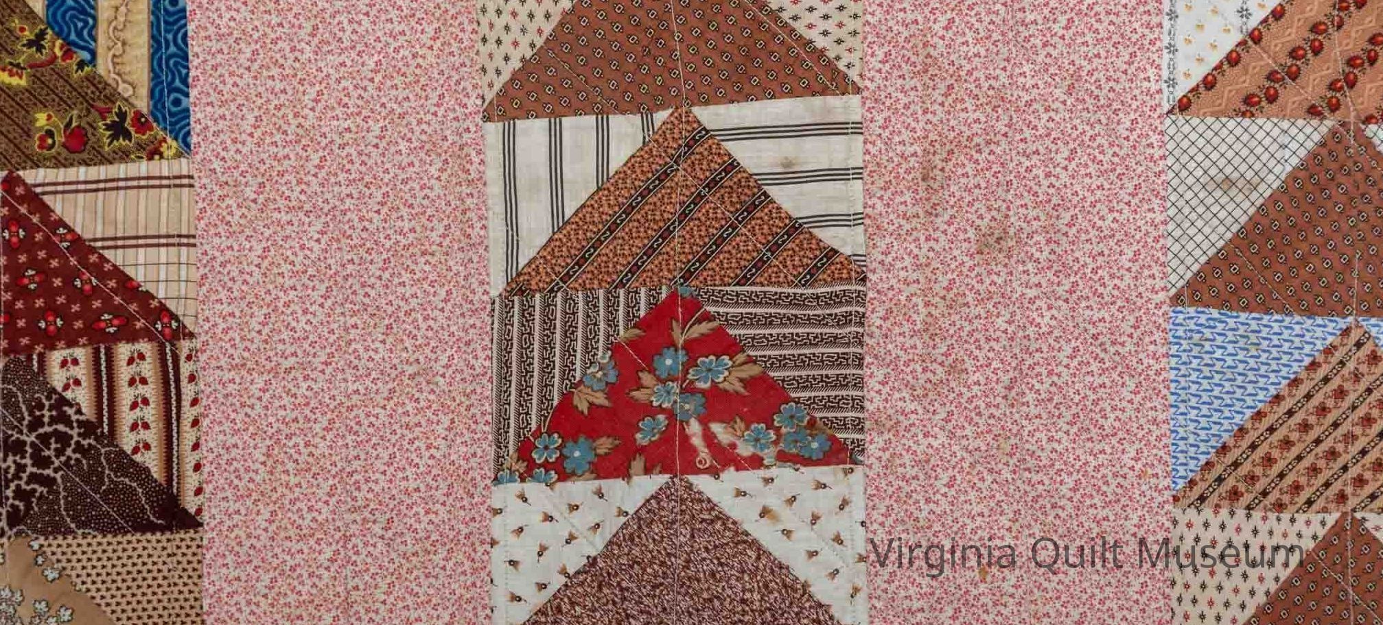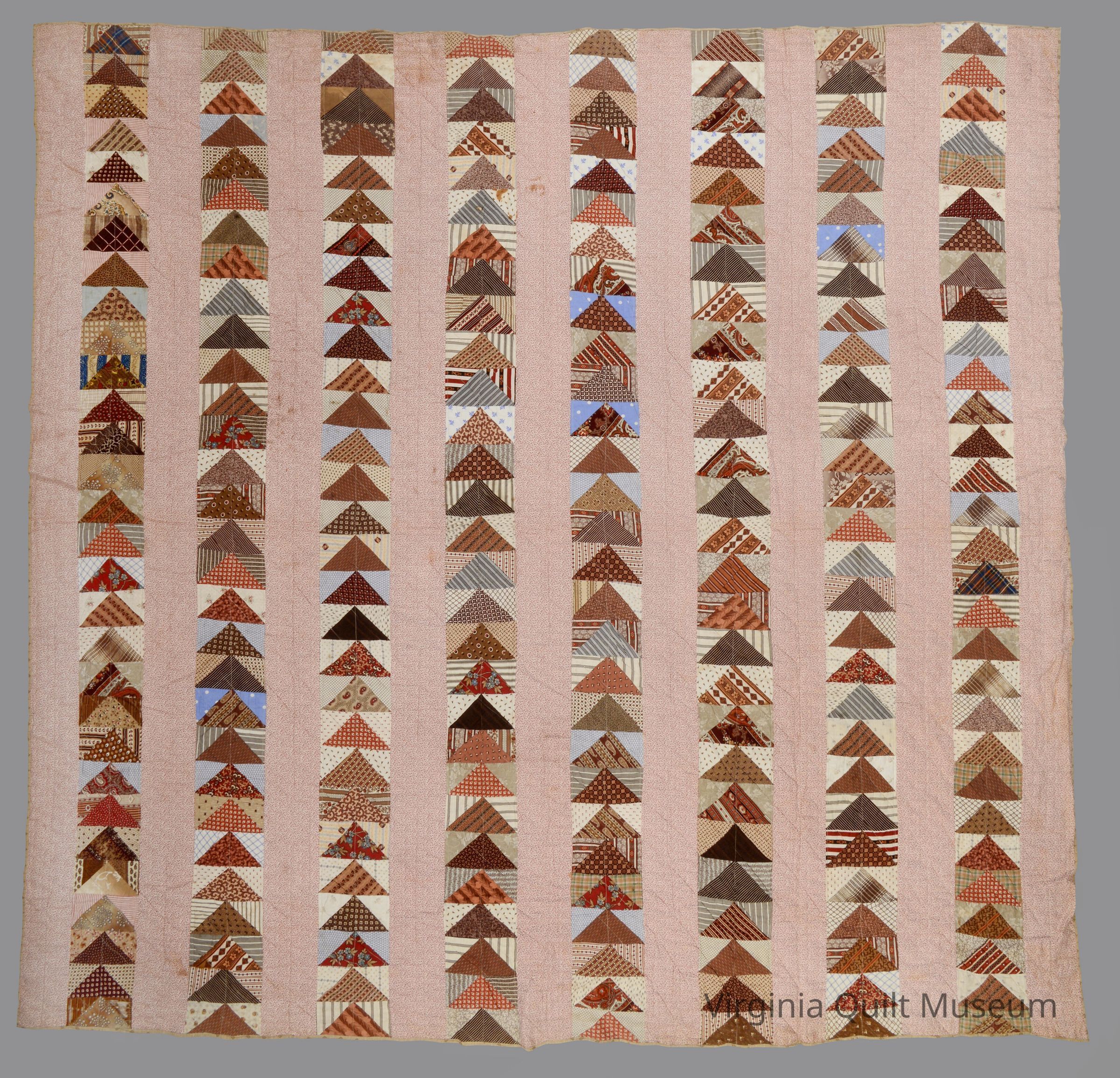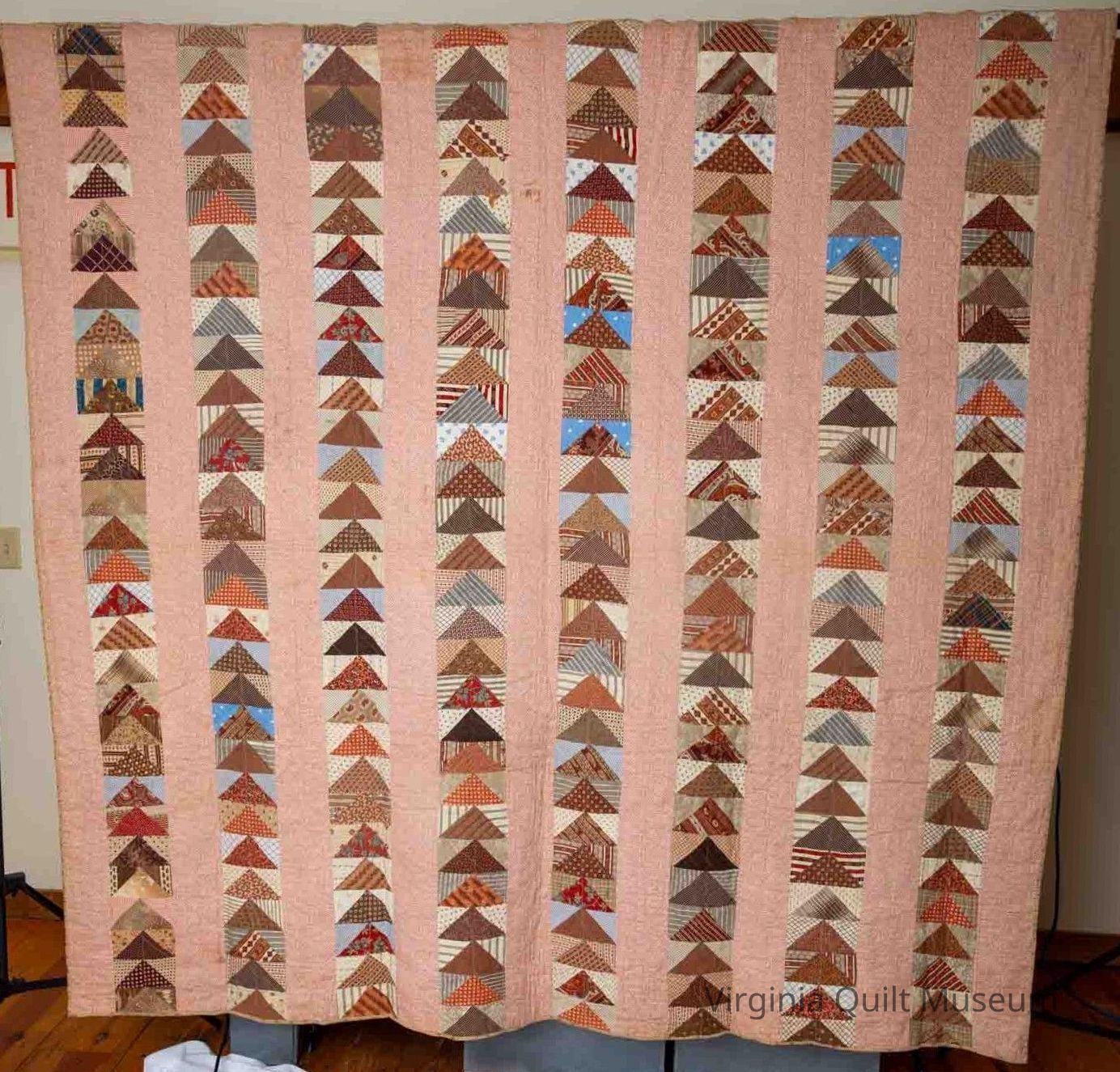 Pieced flying geese blocks in colors of blue, brown, rust, black, white, tan, and pink. Set in strips with alternating sashing strips. Cotton batting, machine quilted in straight lines and crosshatch design.
