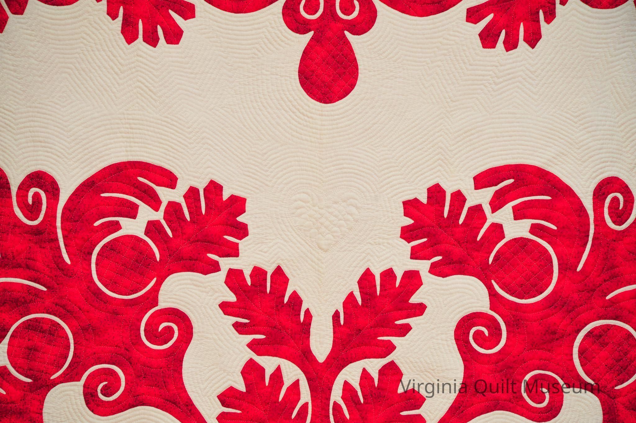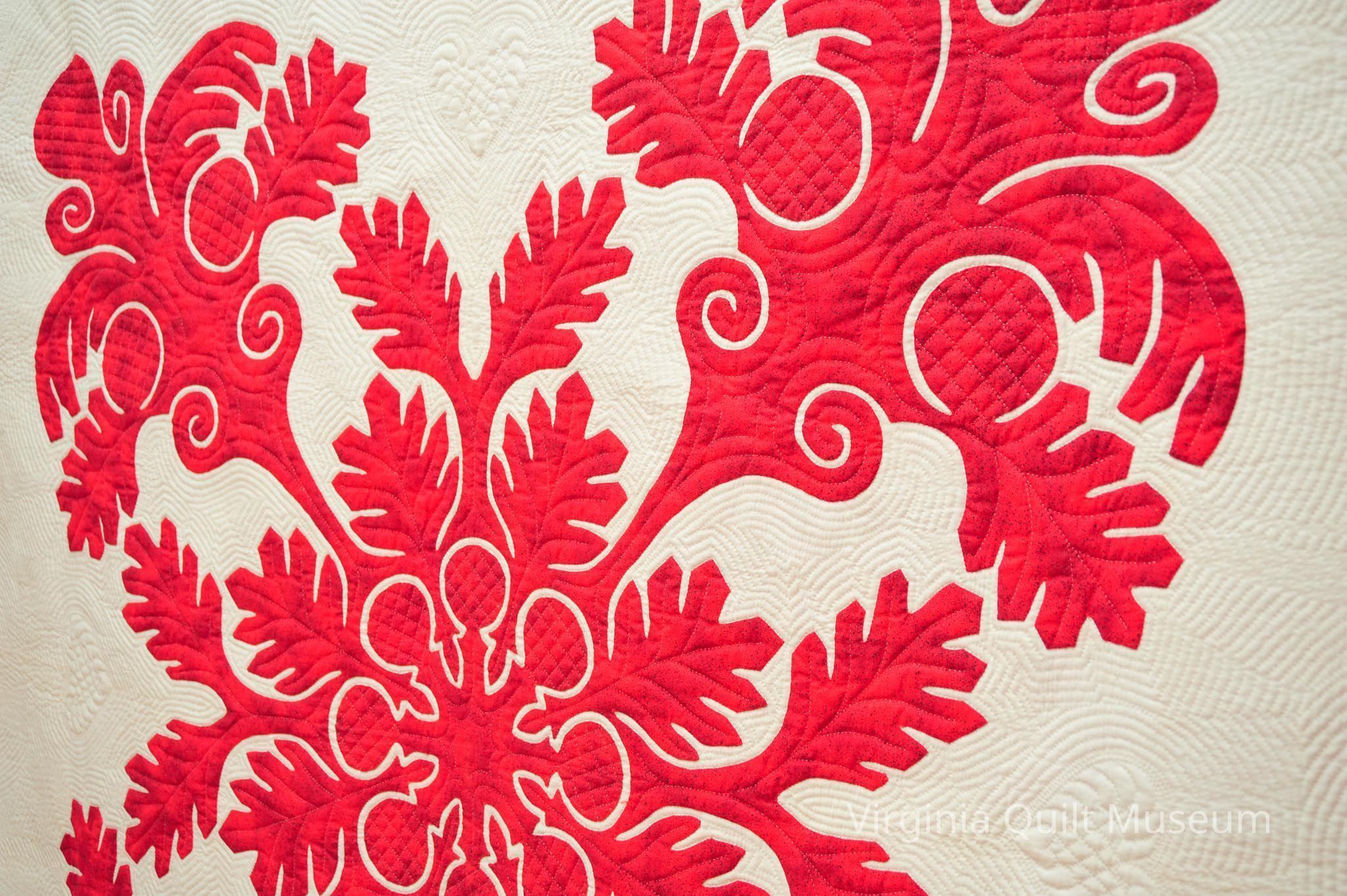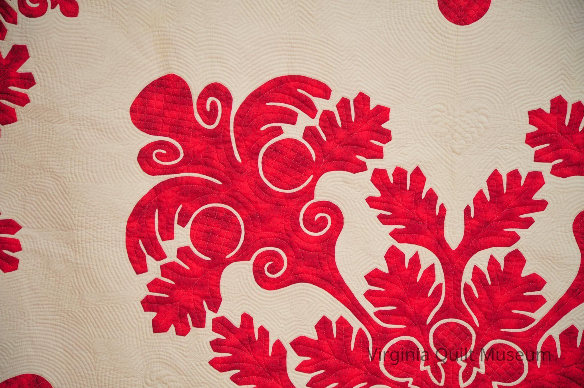 This quilt is has a papercut botanical design in center in red fabric. There are leaves that border all around in the traditional Hawaiian style. A heart quilted on white ground and piping surrounds the edges. Various quilting designs throughout quilt.Context