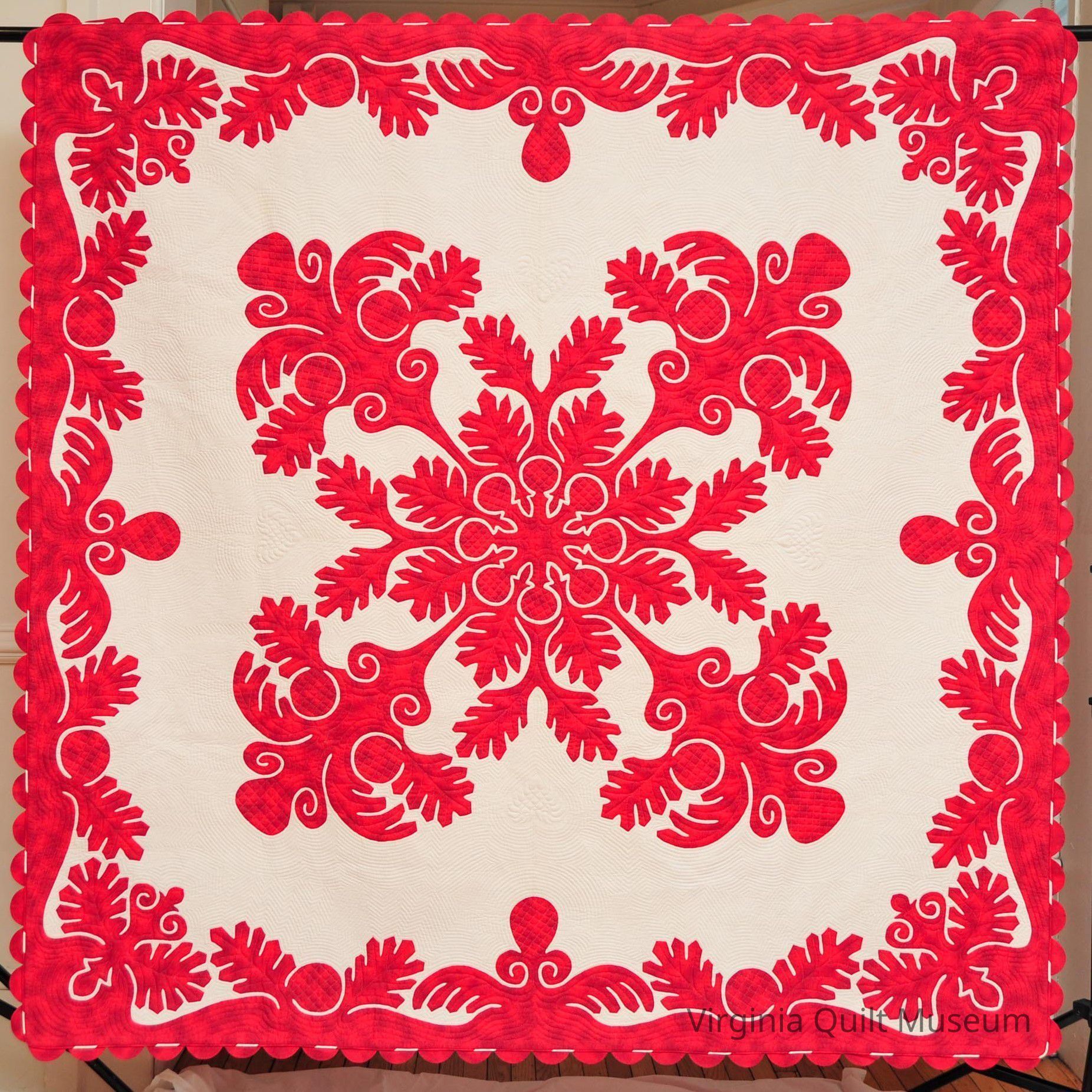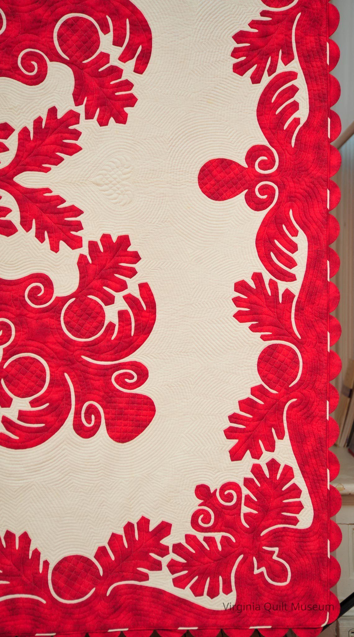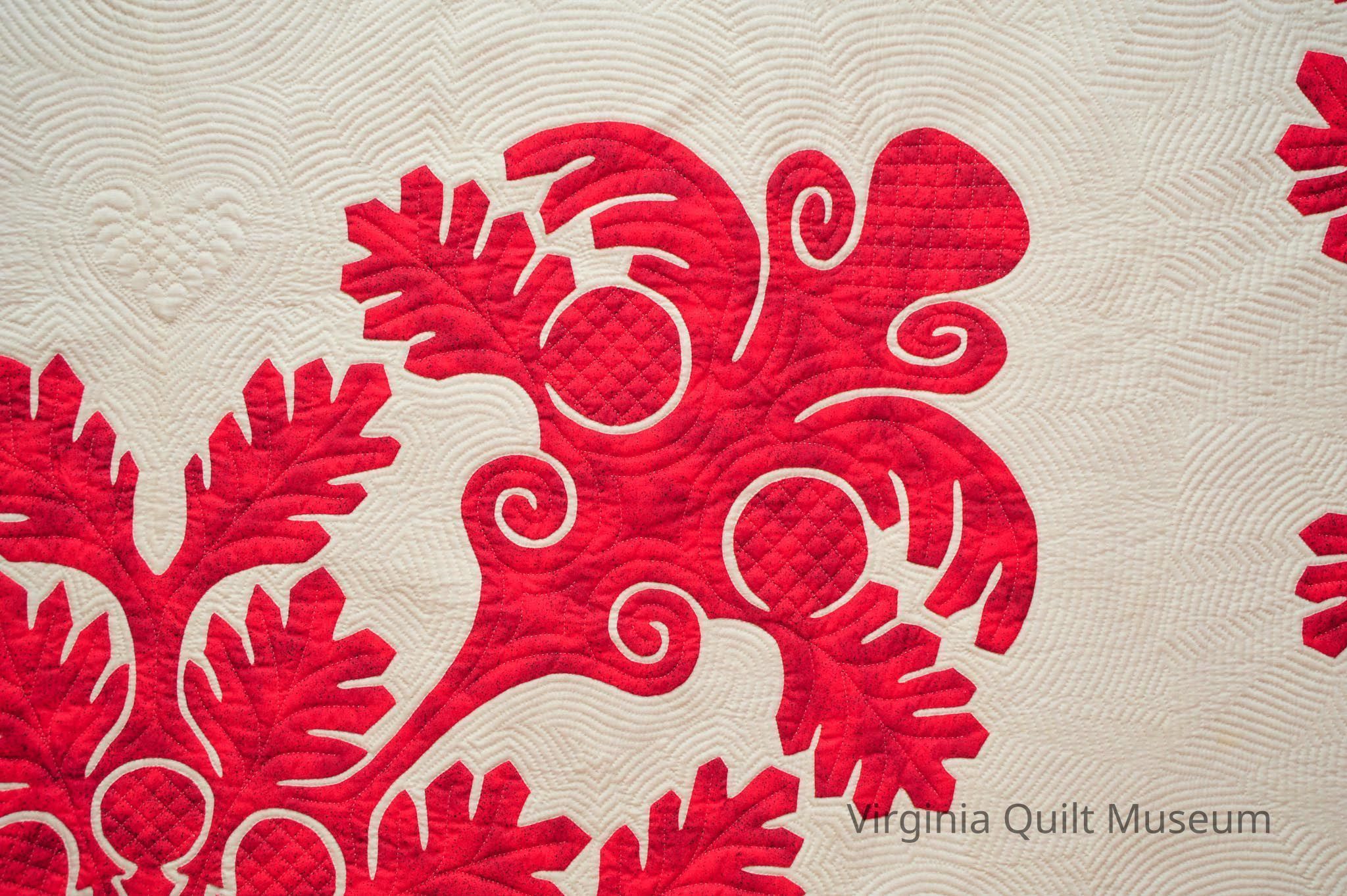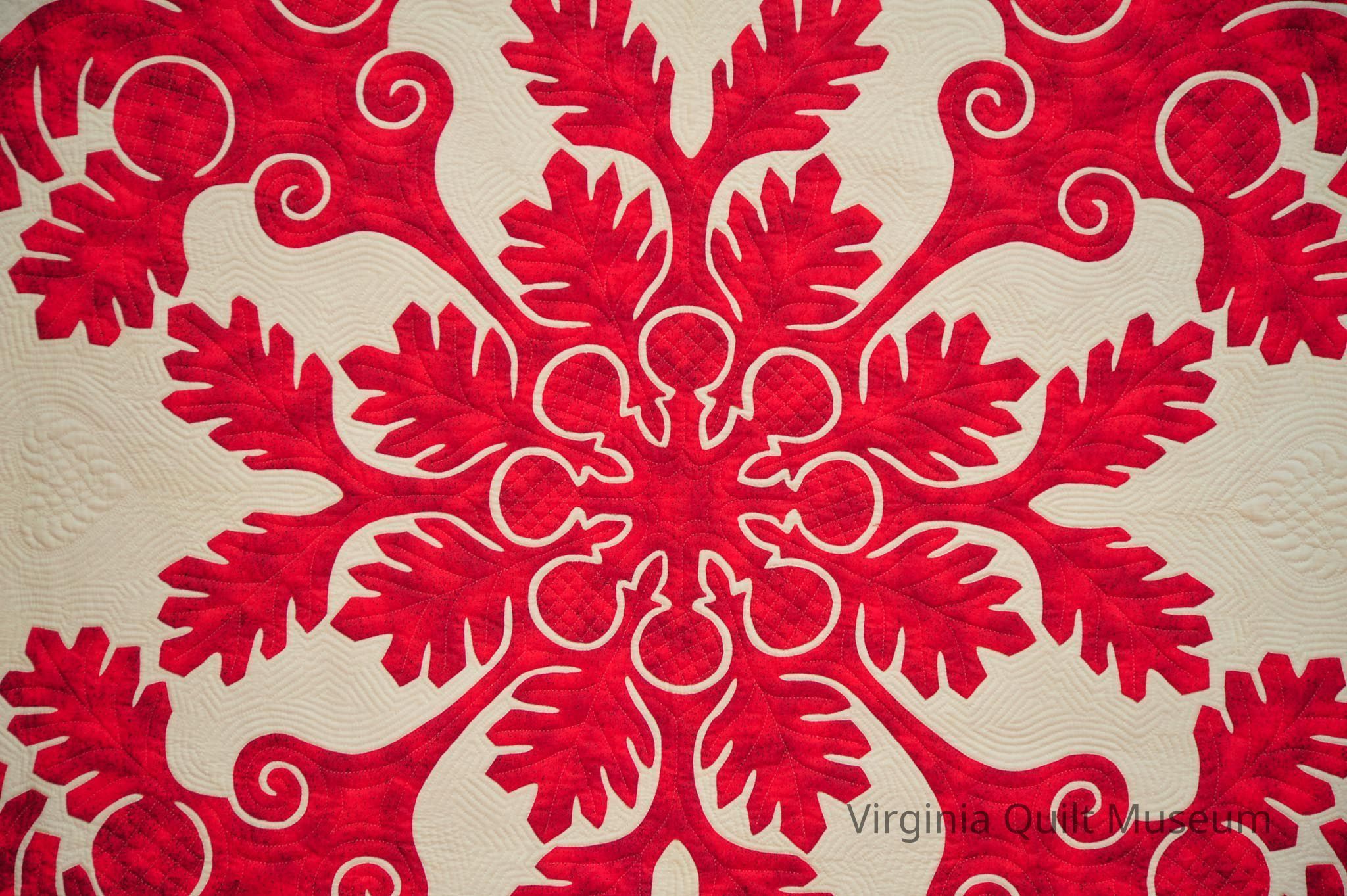 This quilt is has a papercut botanical design in center in red fabric. There are leaves that border all around in the traditional Hawaiian style. A heart quilted on white ground and piping surrounds the edges. Various quilting designs throughout quilt.Context