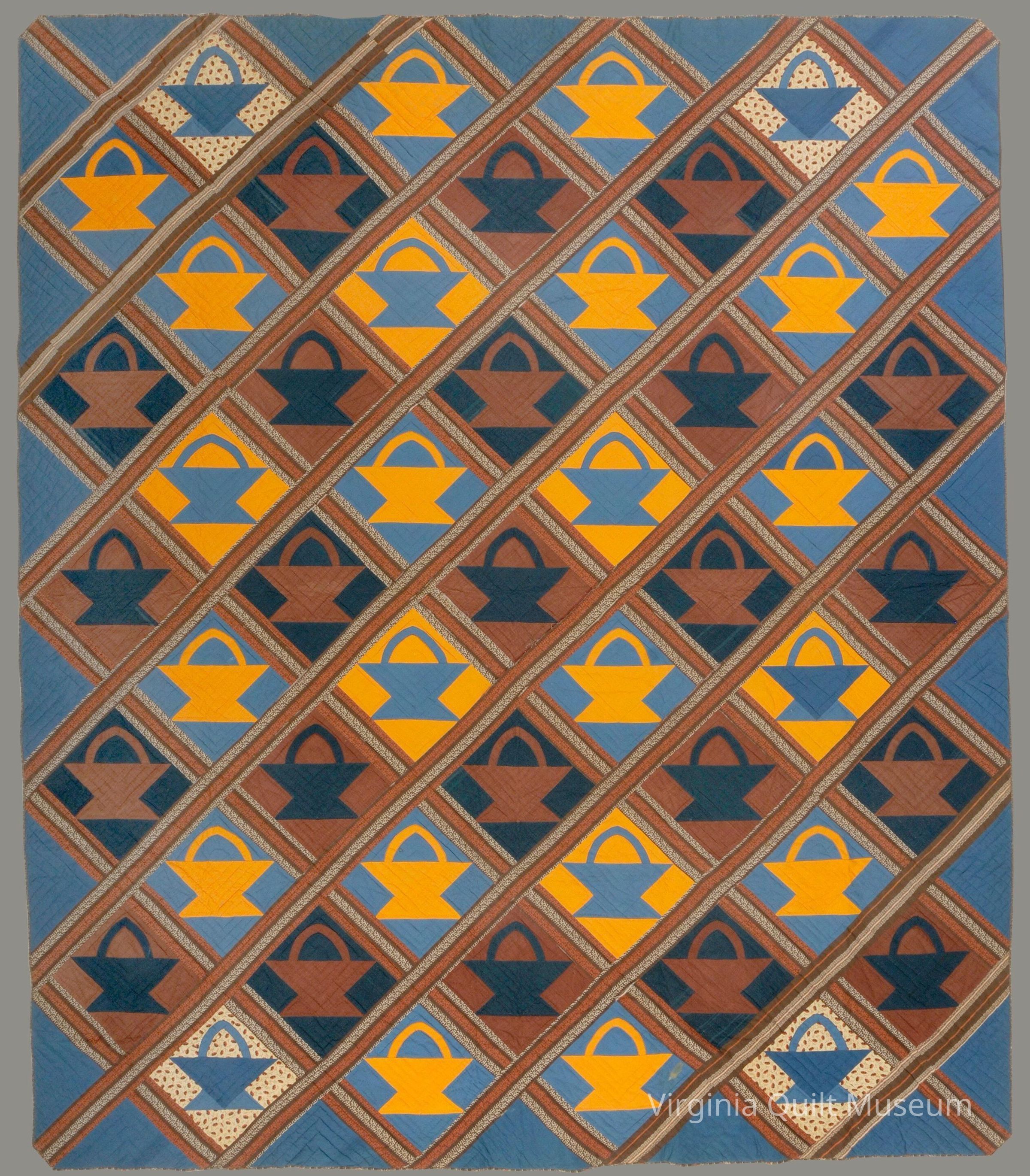 Machine pieced and appliquéd. Hand quilted using a dark thread. 45 Basket block set on diagonal in stripe printed sash. There are blue triangles around all sides. The baskets are blue, yellow, or brown, and the background are those colors as well. The color scheme alternates from dark to light.Context