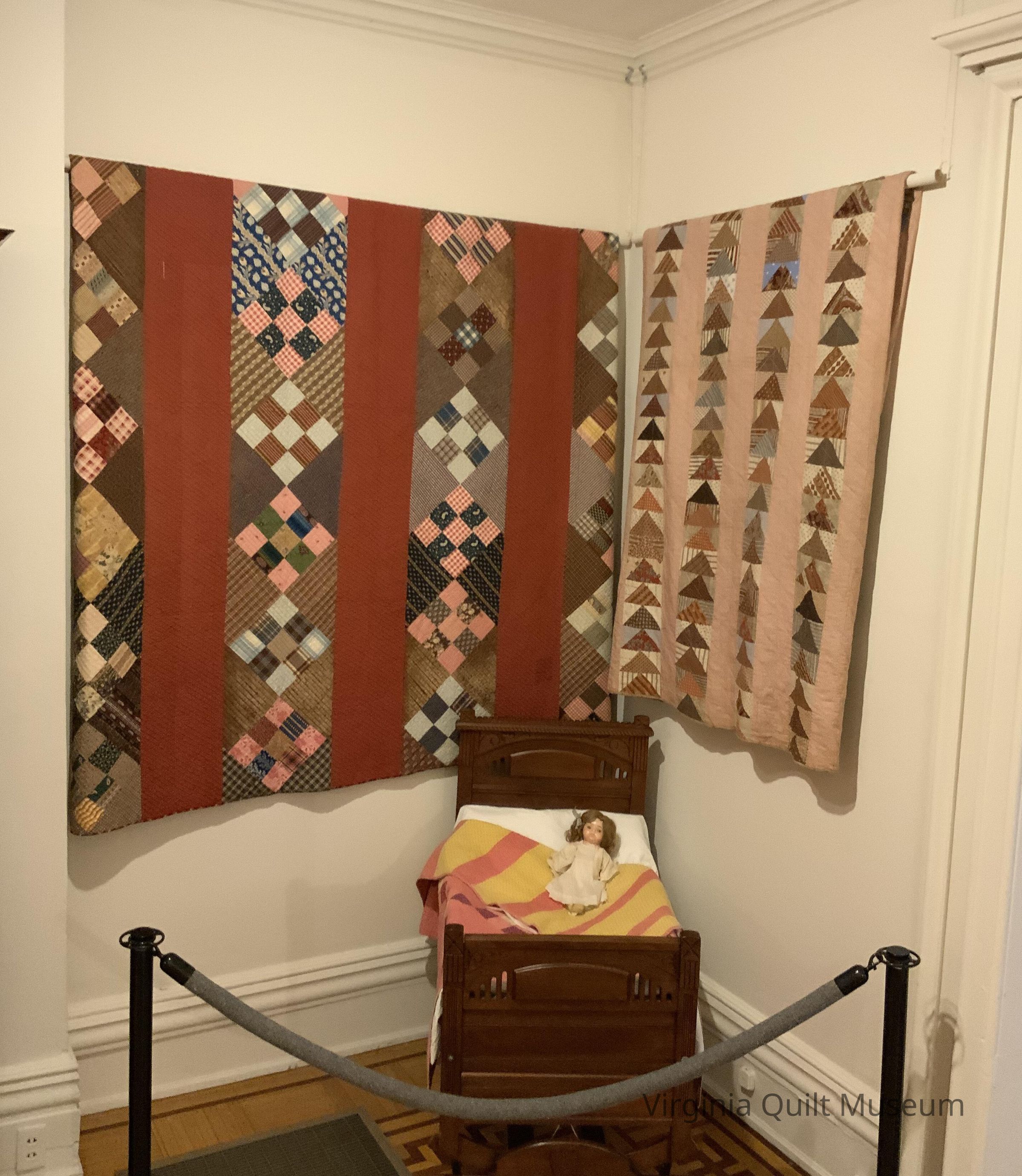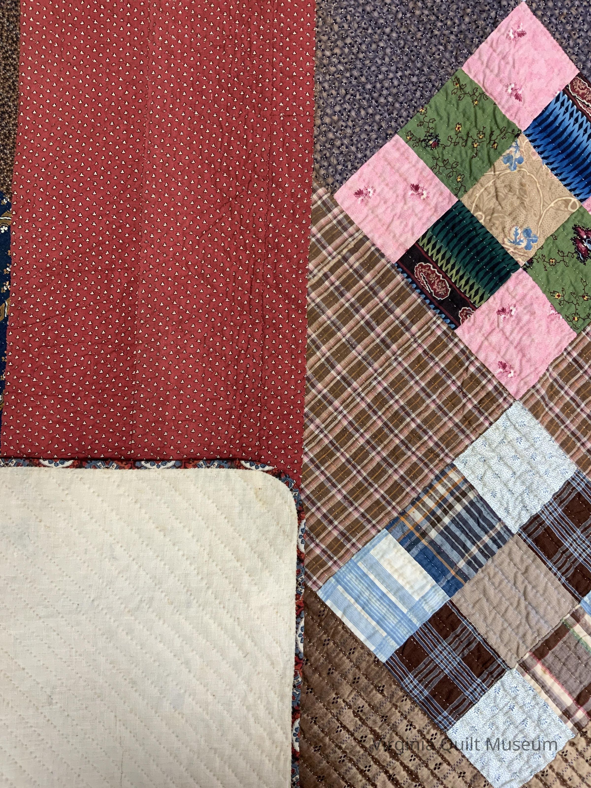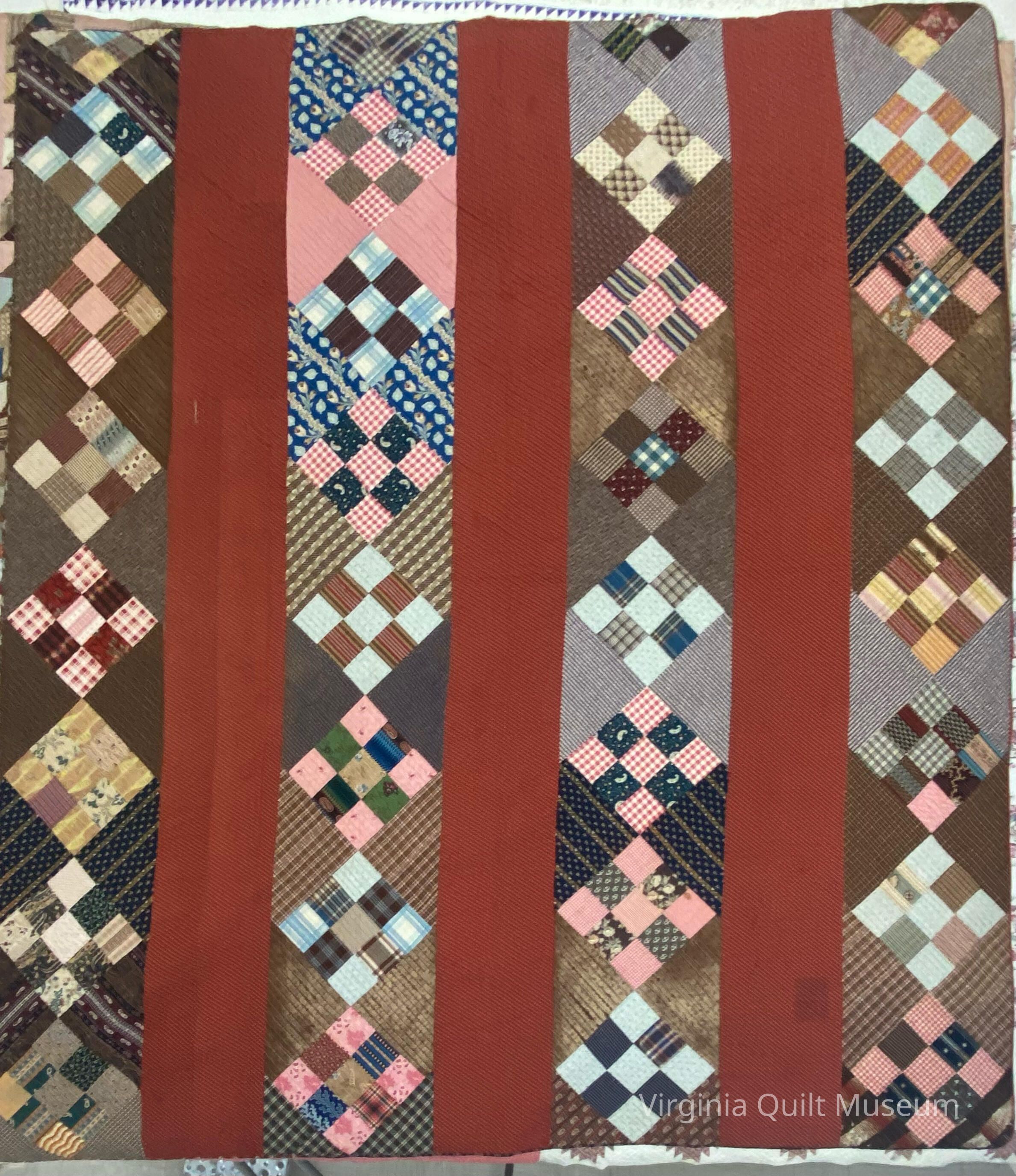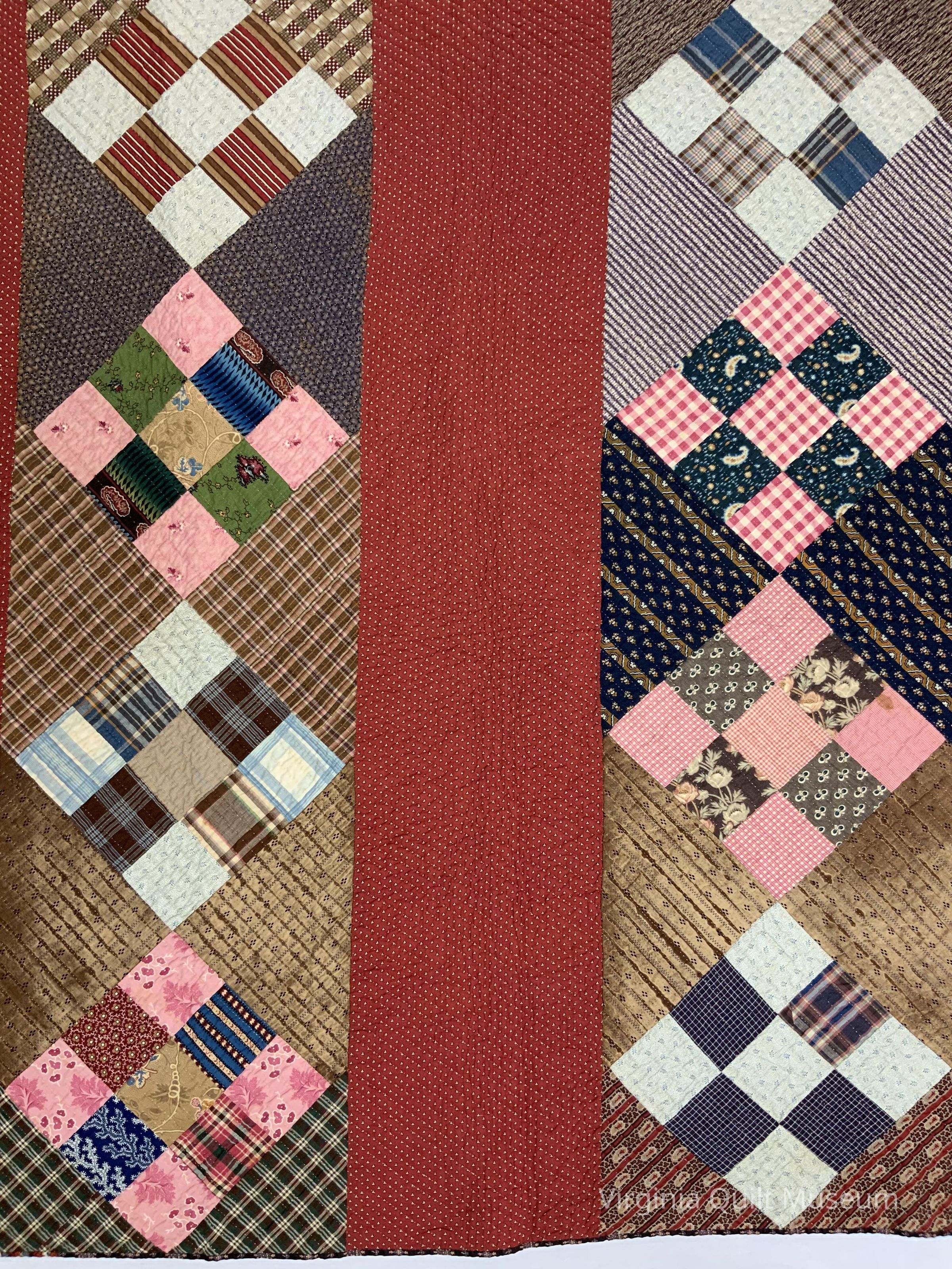 9-patch quilt set with a strip of brick red print fabric. The top is of all print fabrics from 1830s-1840s era. Off-white backing.Context