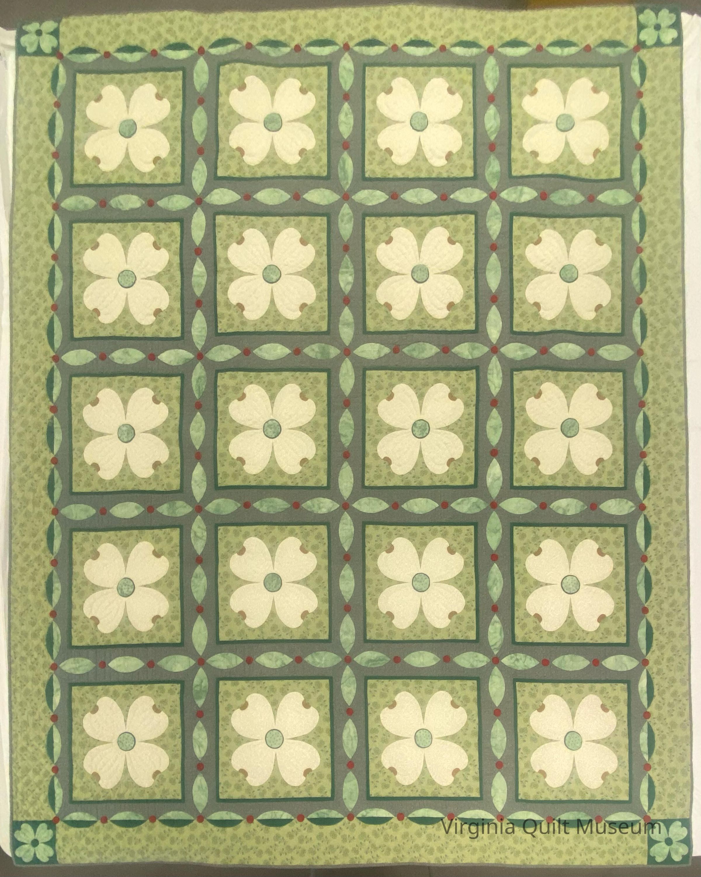 Appliquéd and pieced quilt top made by Anne Oliver, quilted by members of Quilters Unlimited. Contains twenty 13'' blocks with appliquéd dogwood blossoms, edged with a plain-dyed green strip.Context
