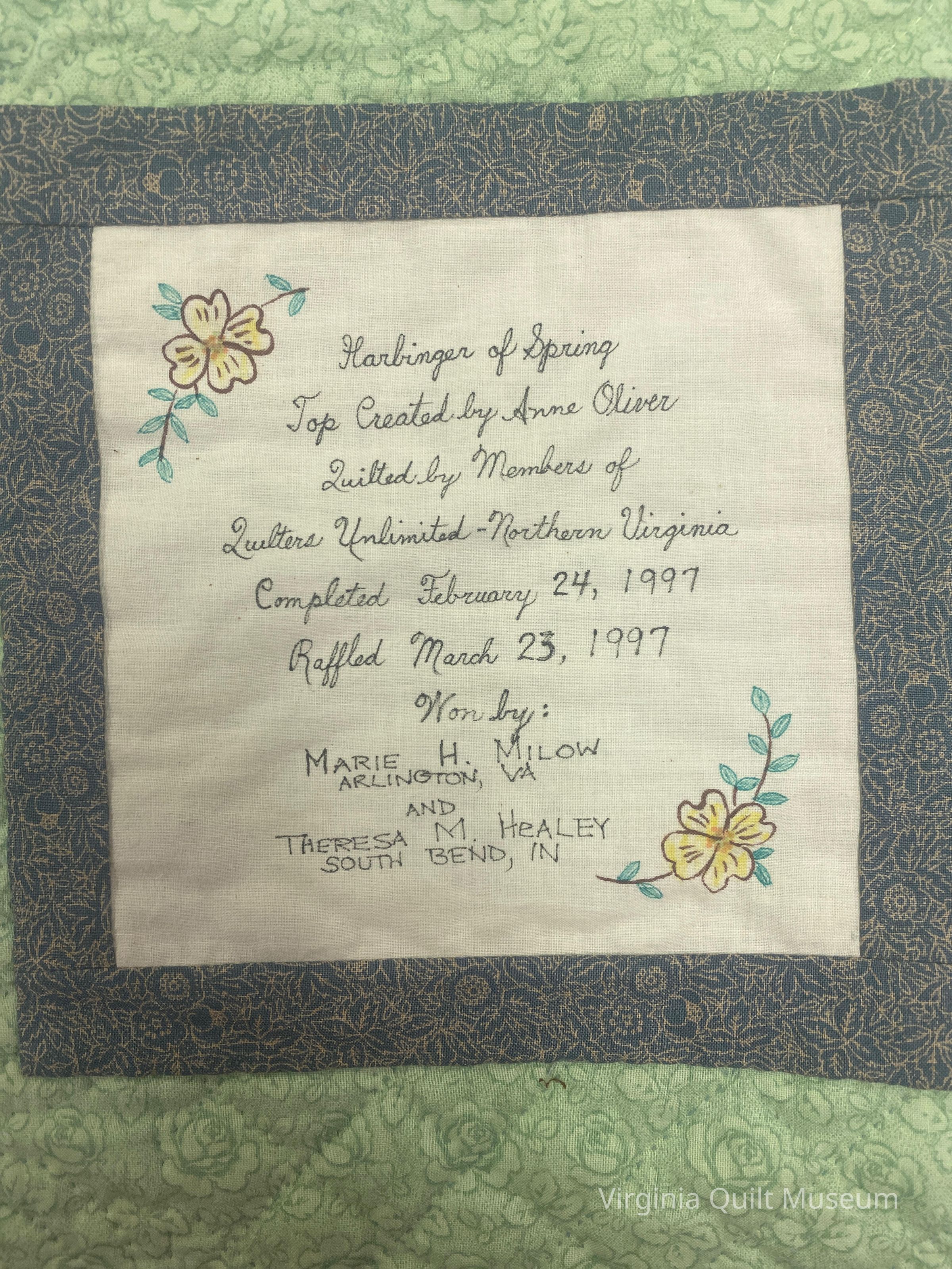 The top was made by Anne Oliver, an internationally known quilter. Members of the organization composed a logbook, making comments and logging in the dates they worked on the quilt. The quilt was raffled at the Northern Virginia Community College and won by Marie Milow, the donor.Collection