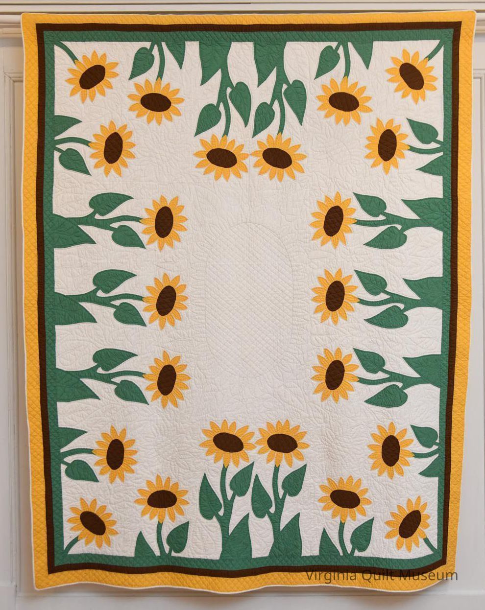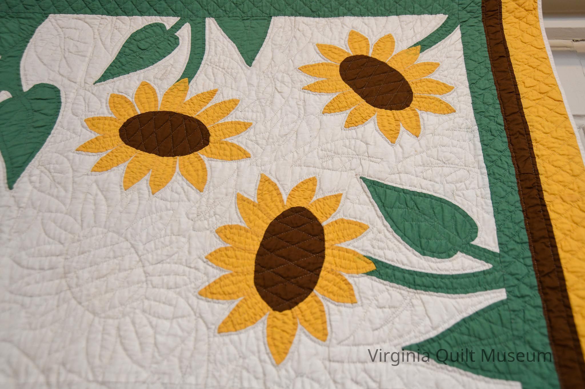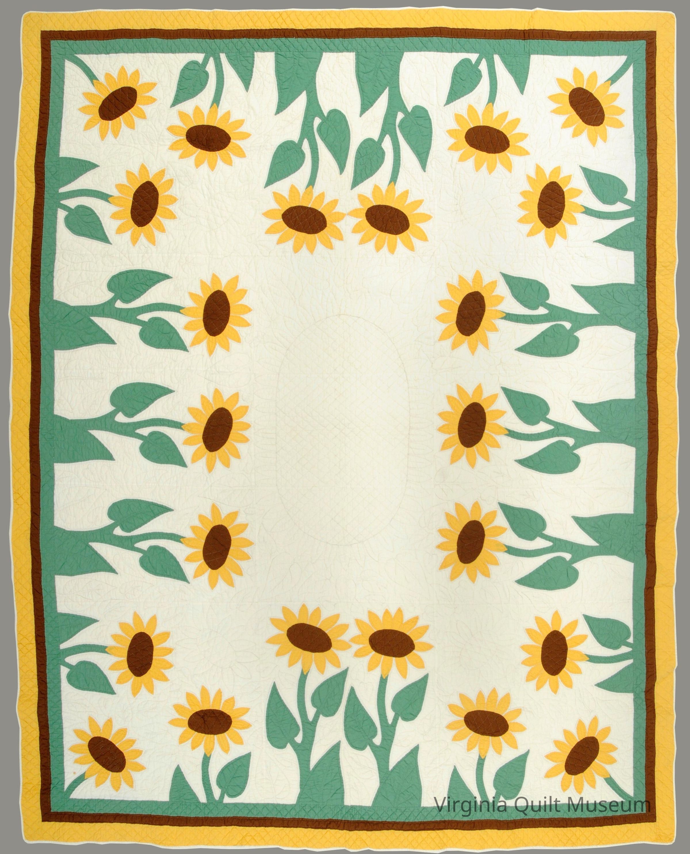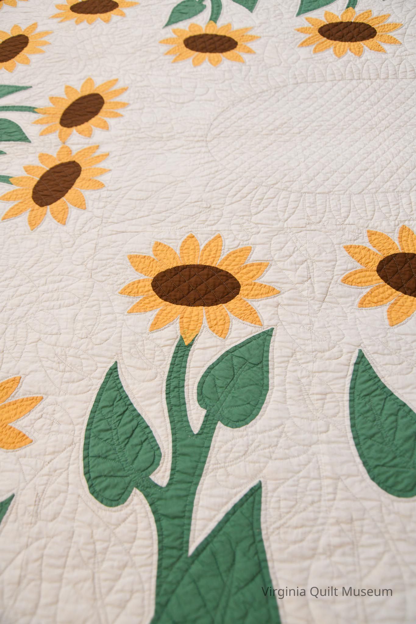 22 large sunflowers hand appliquéd on a cream colored background. The yellow flowers with brown centers and green leaves are arranged around the perimeter of the quilt with the blossoms facing toward the center. The border consists of three strips of the same colors of the sunflowers. Backing is white. Hand quilted. There is a center medallion with crosshatching in the background.Context