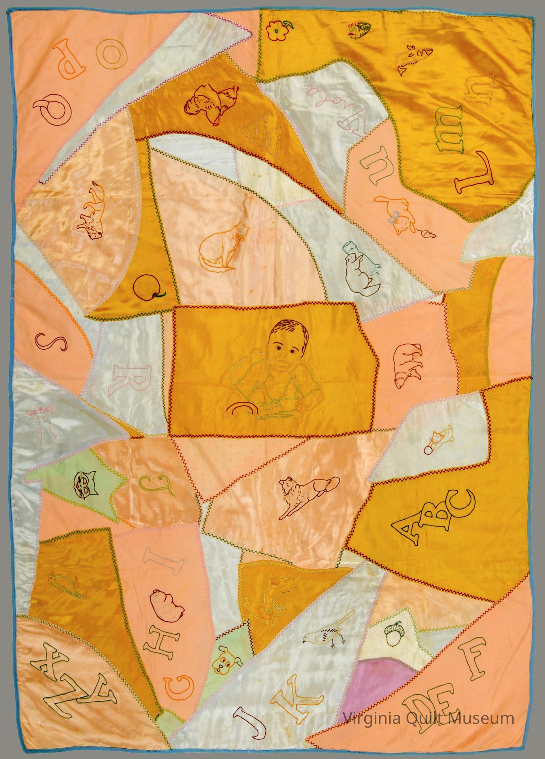 Silk crazy quilt embroidered with letters of the alphabet and motifs of animals. One large motif of a child in the center. Blue rope binding on edge.Context