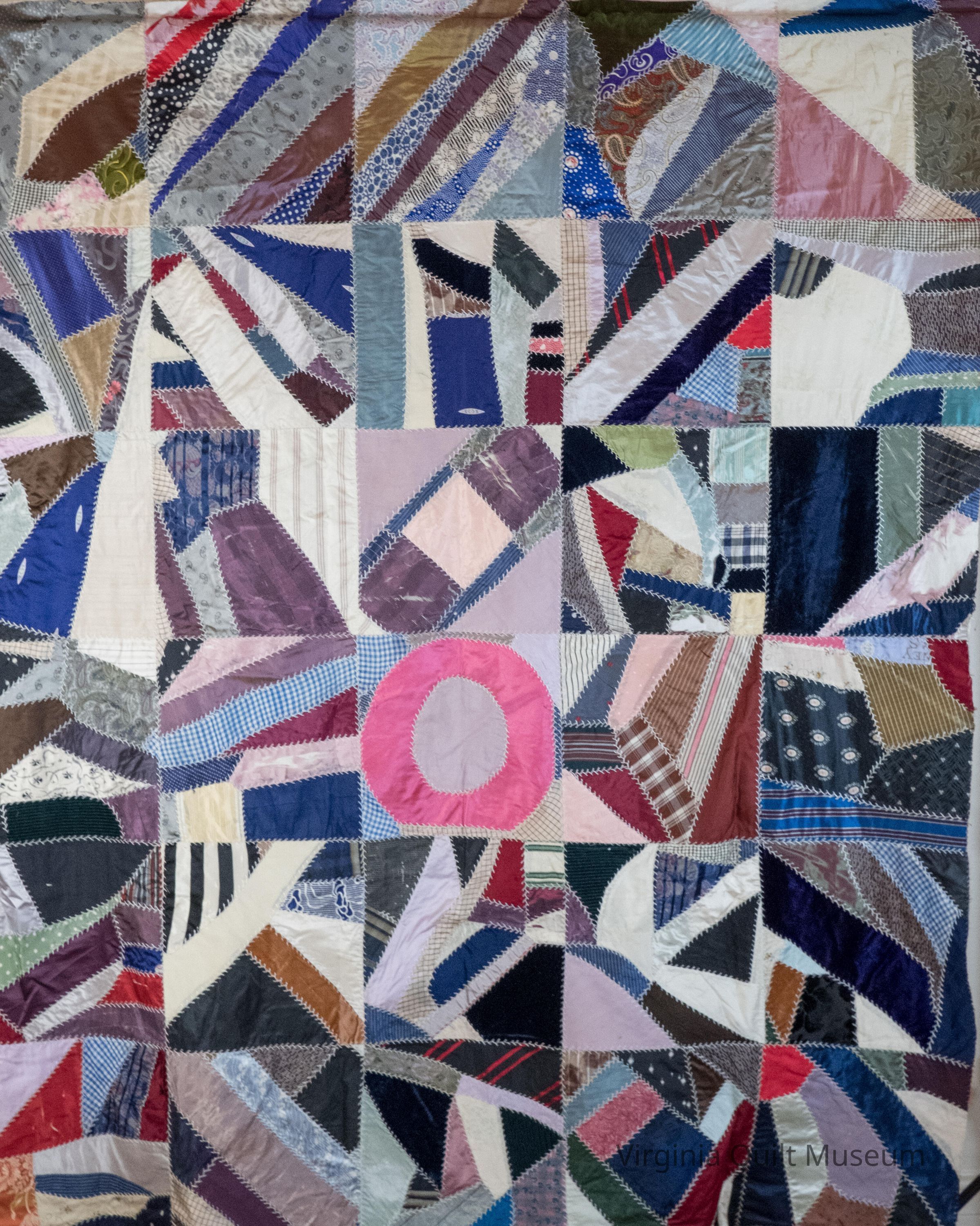 This is a Crazy Quilt top that is pieced on a foundation. There is no backing. The briar stitch is used to embellish the quilt. There is a distinctive pink circle in the top center.Context