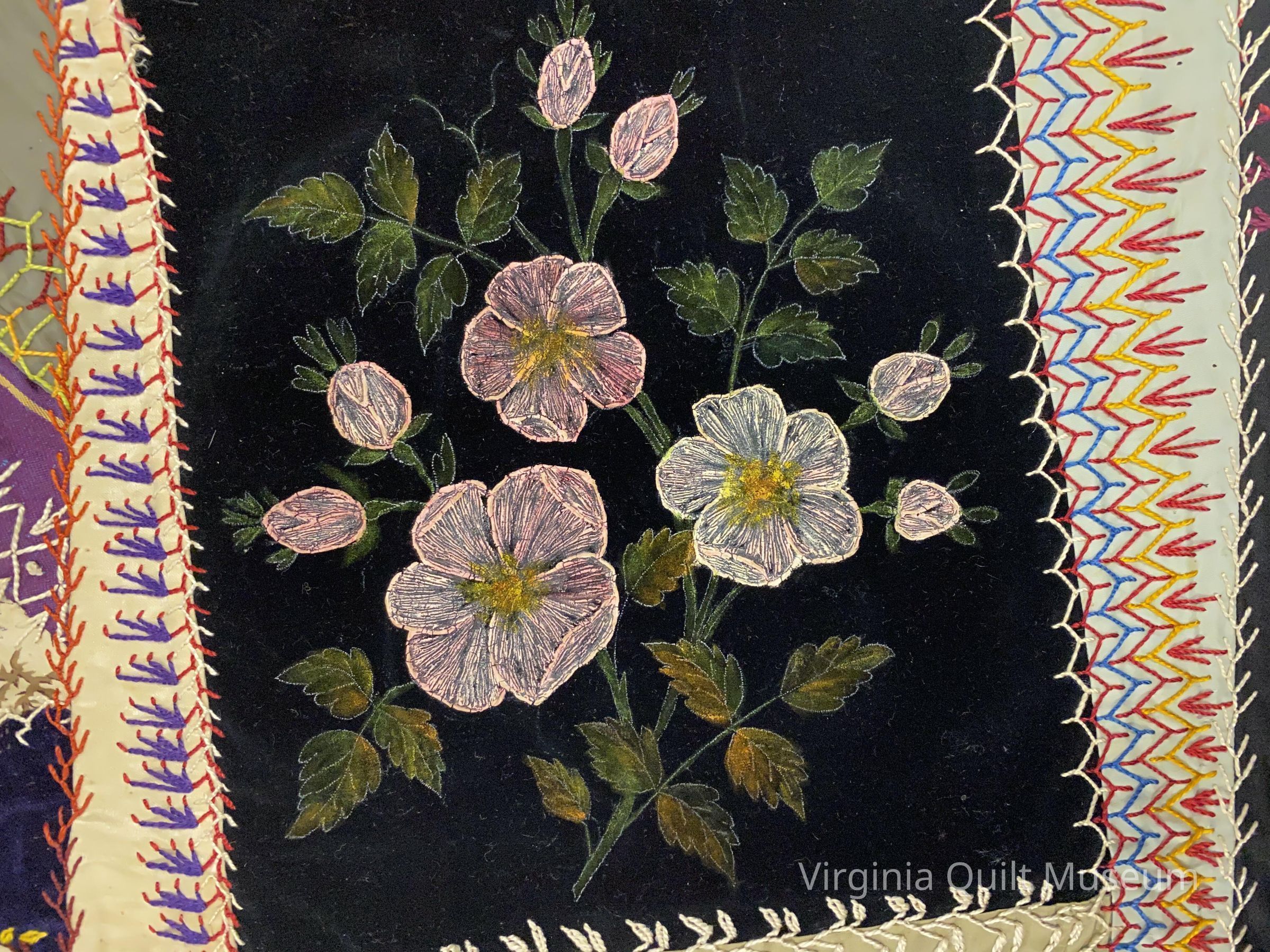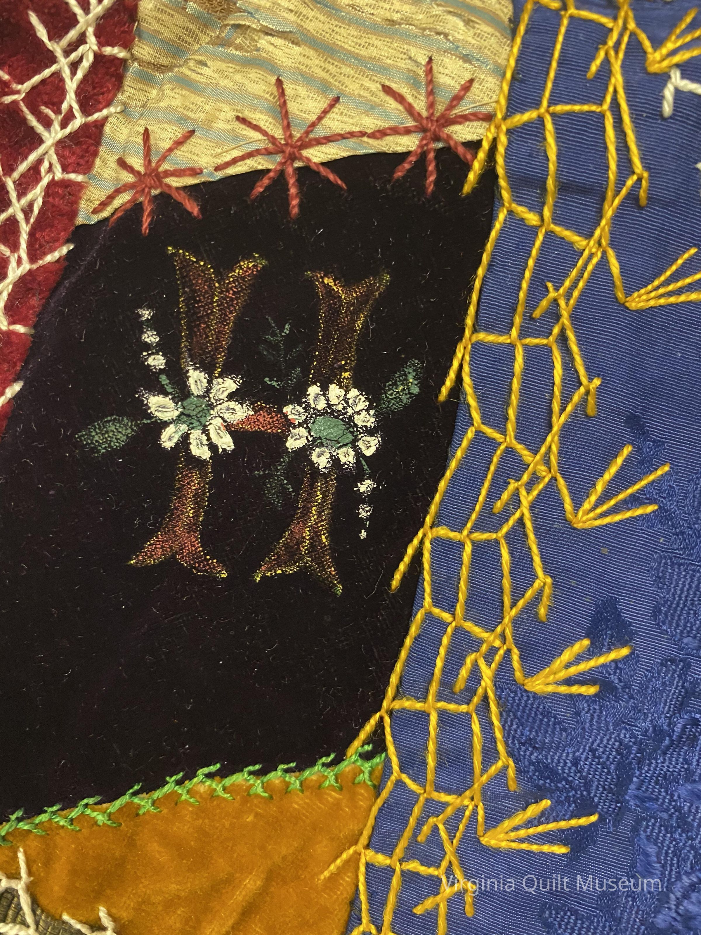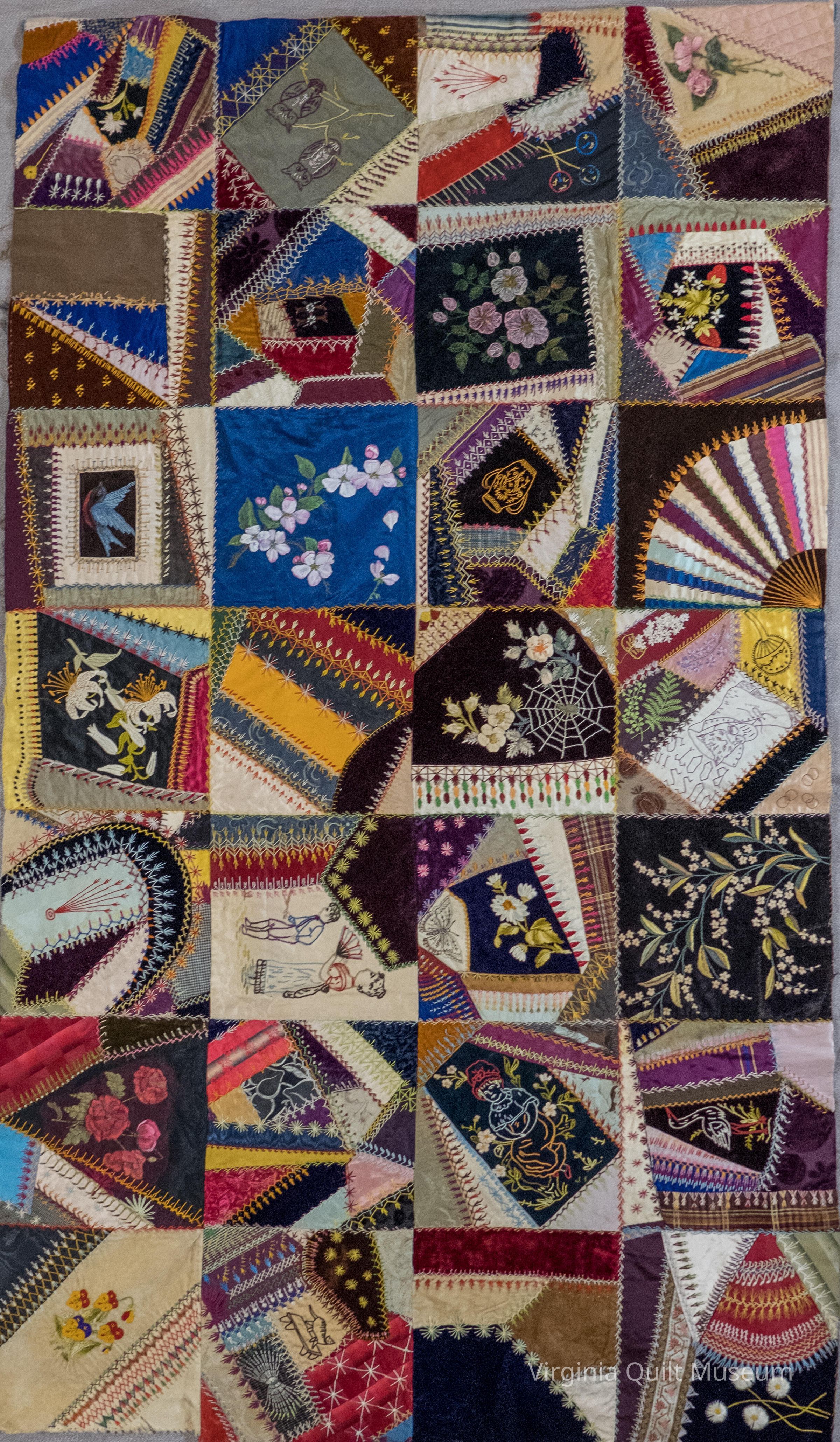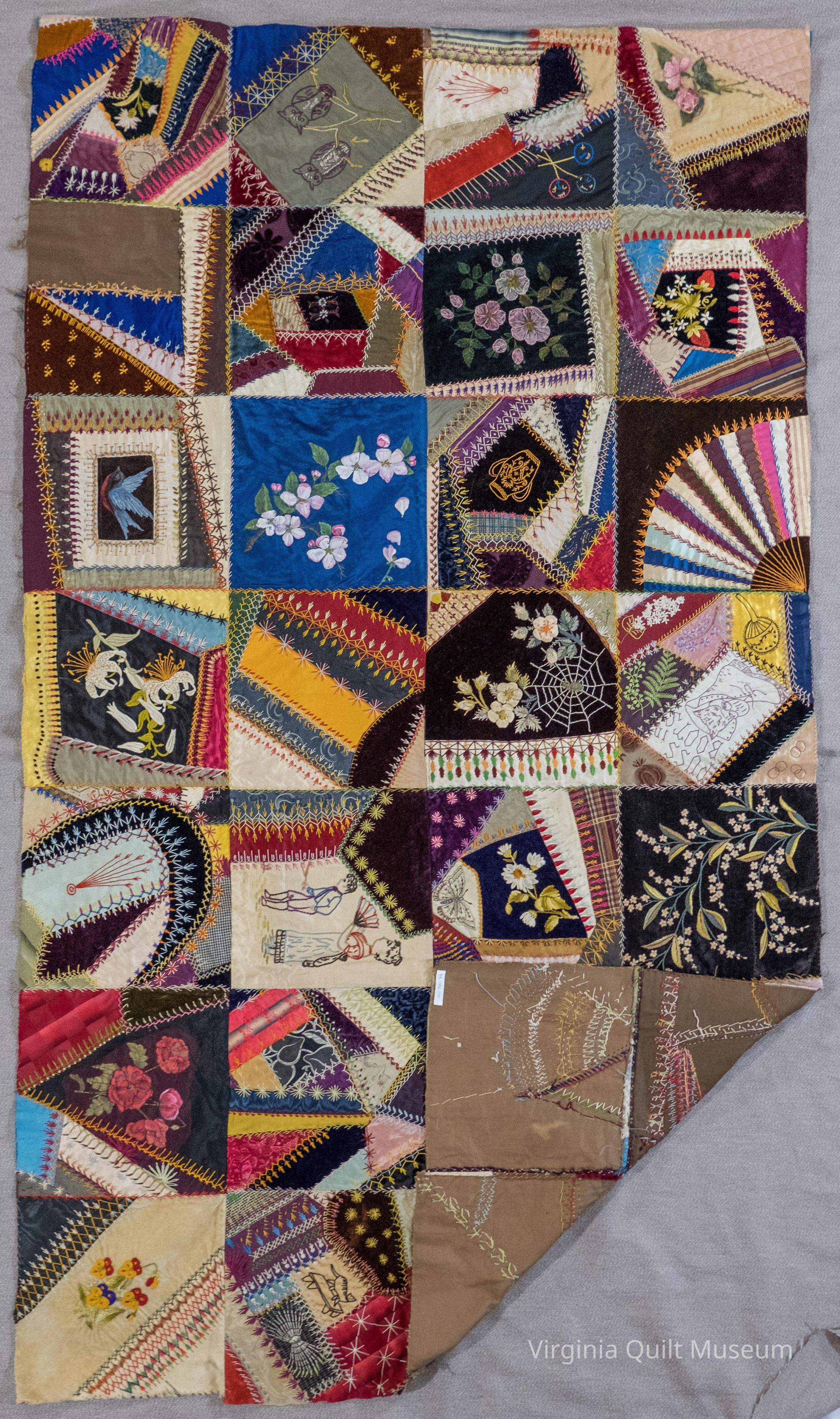 This Victorian period quilt top consists of 28 blocks measuring 10 1/2" square. Most of the blocks are pieced in the typical crazy quilt style of randomly sized and shaped pieces of cloth attached to a foundation. The blocks are then embellished with embroidery and painting. Two of the blocks are not pieced, but feature embroidered sprays of flowers. Other blocks depict fans, spider webs, flora and fauna, nursery rhyme characters, 3 dimensional ribbon flowers, and the initial H.  Colors include black, blue, gold, burgundy, cream, and maroon in silks and velvets.