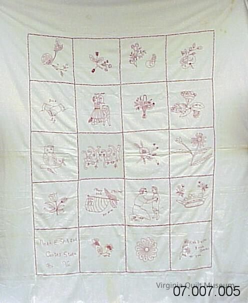 20 blocks of redwork embroidery on white. Set 4 blocks wide by 5 bolocks down. Red stitching over seam lines to form outline/grid. Wide 10.5 inch border on all sides. Blocks feature floral designs, girl with dog, and other motifs.Context